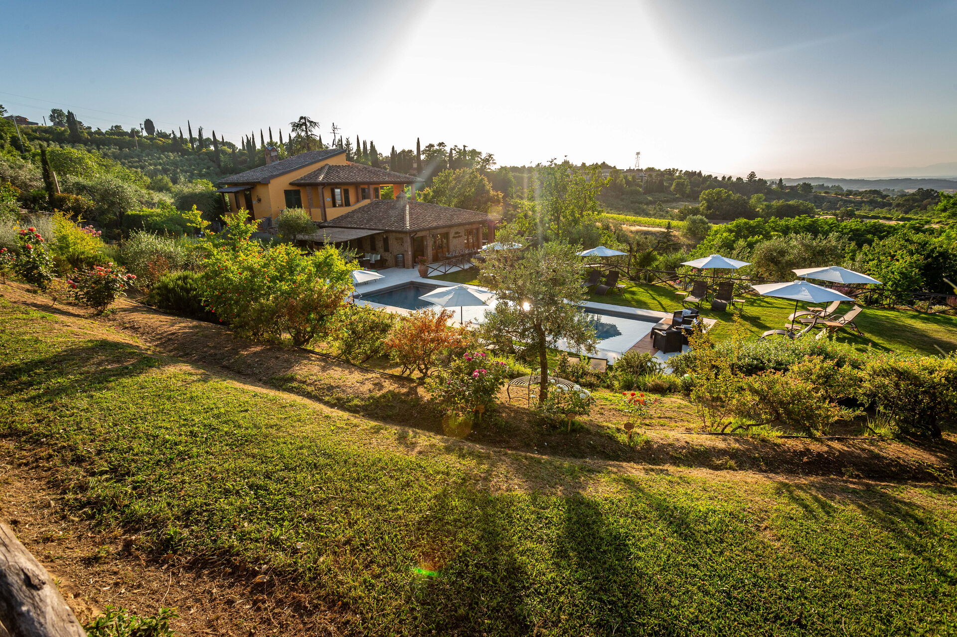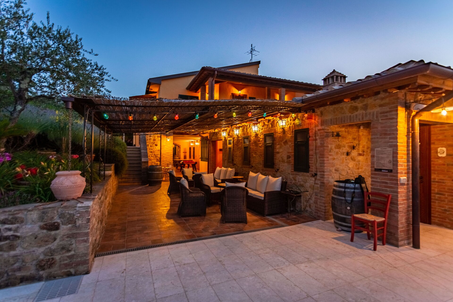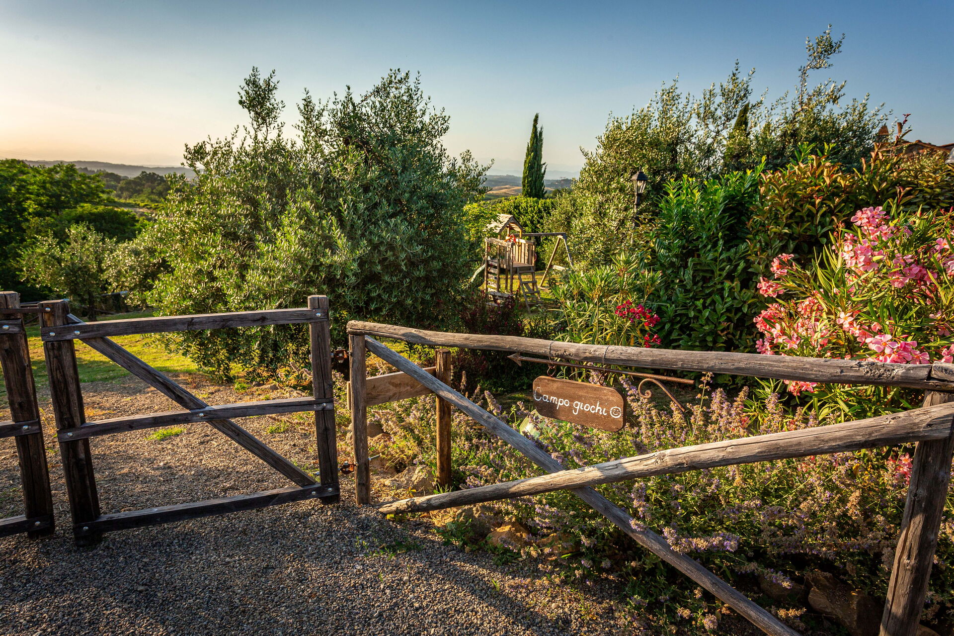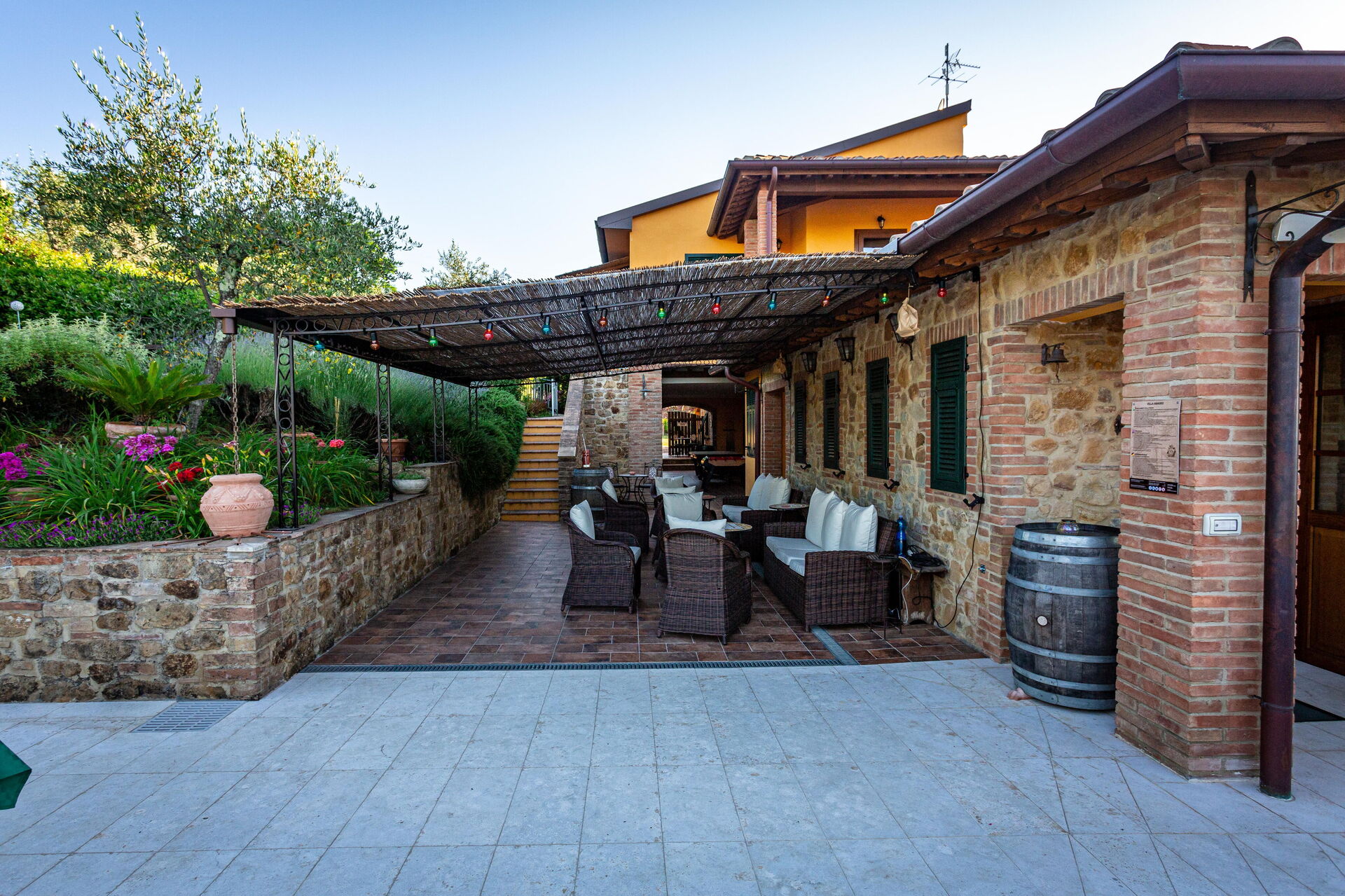 La struttura è circondata da un bel giardino curato, con alberi, piante e fiori, da cui si può godere di una meravigliosa vista panoramica sulla natura circostante e sul paesaggio collinare tipico del Chianti. Numerose are attrezzate sono a disposizione degli ospiti per potersi rilassare e divertire nel giardino, compreso un parco giochi per i bambini più piccoli.