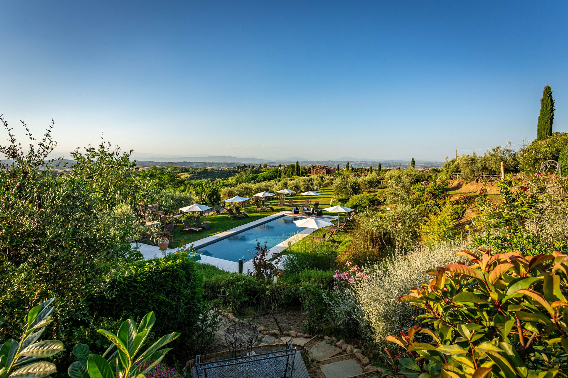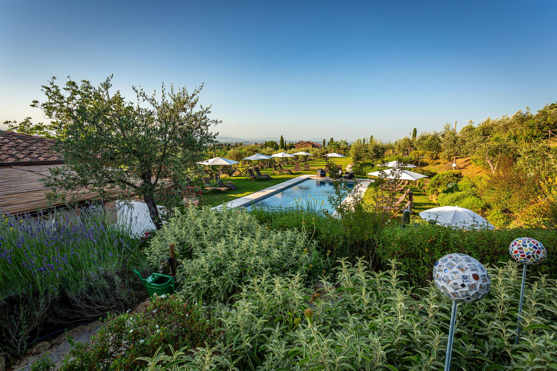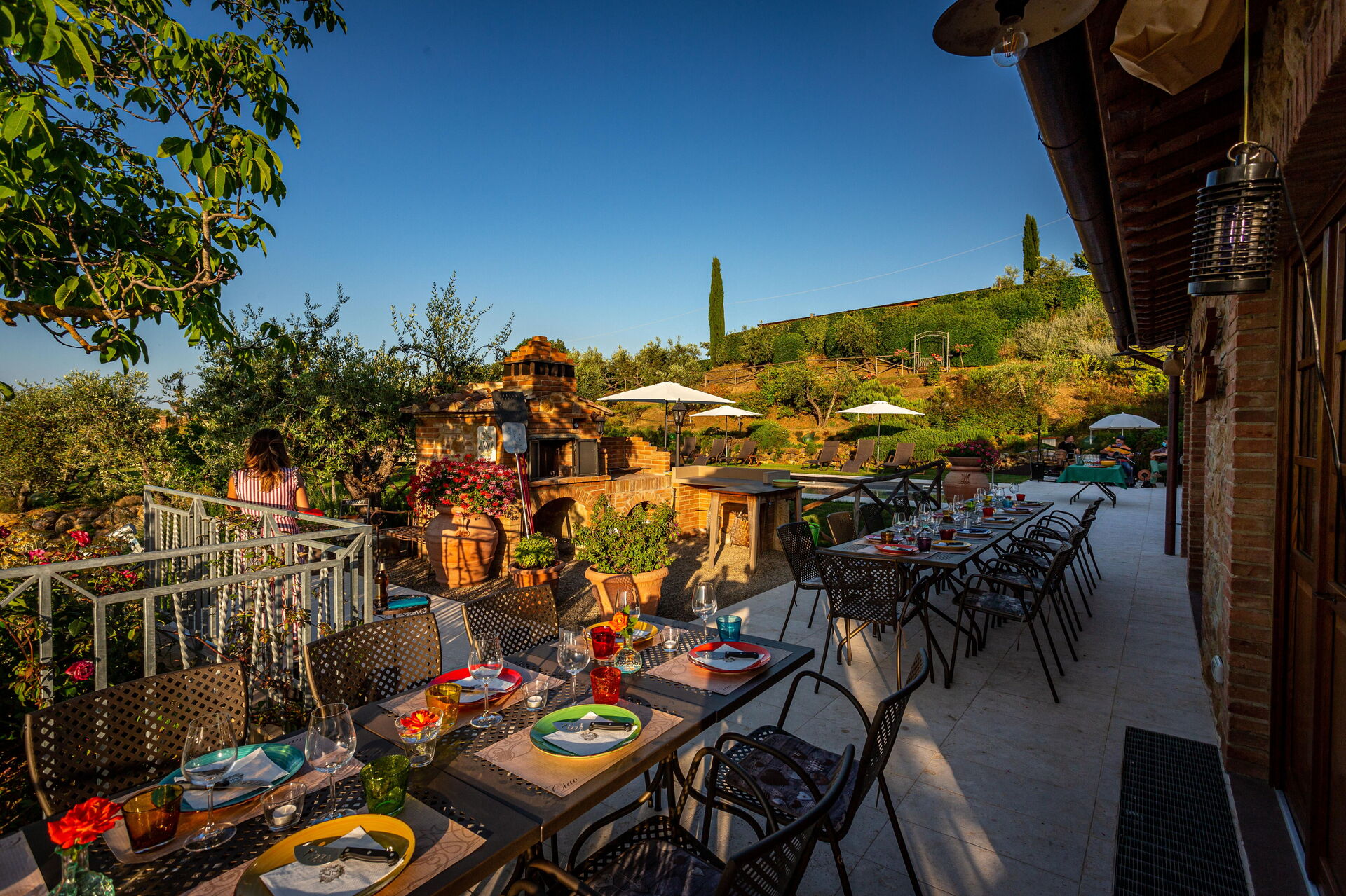 La struttura è circondata da un bel giardino curato, con alberi, piante e fiori, da cui si può godere di una meravigliosa vista panoramica sulla natura circostante e sul paesaggio collinare tipico del Chianti. Numerose are attrezzate sono a disposizione degli ospiti per potersi rilassare e divertire nel giardino, compreso un parco giochi per i bambini più piccoli.