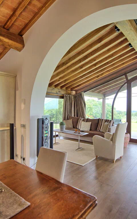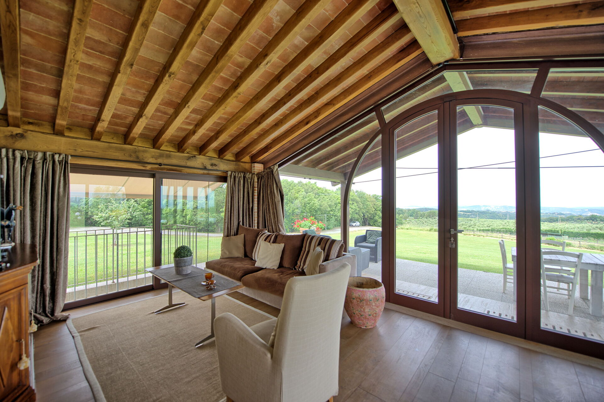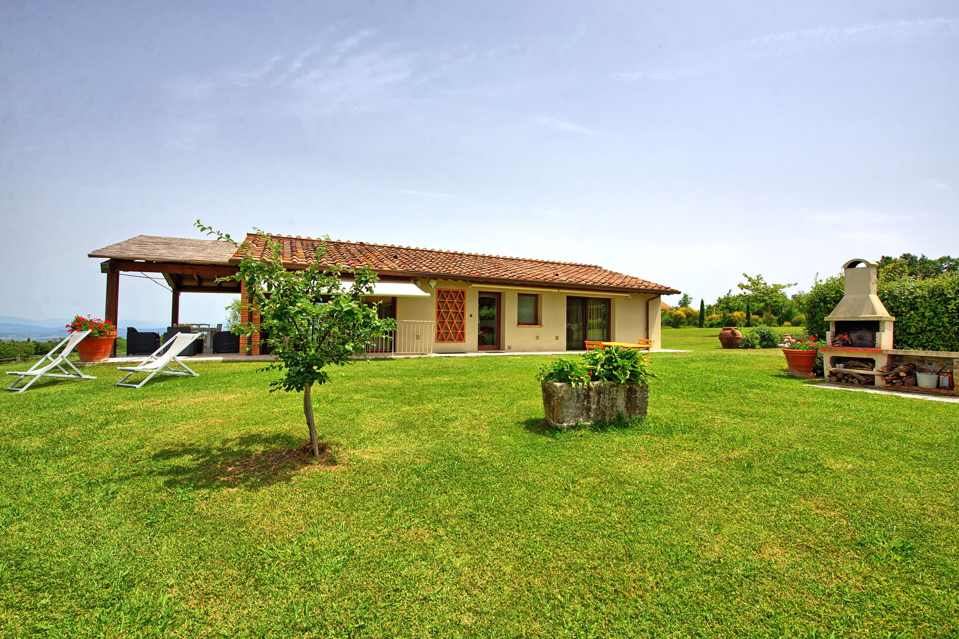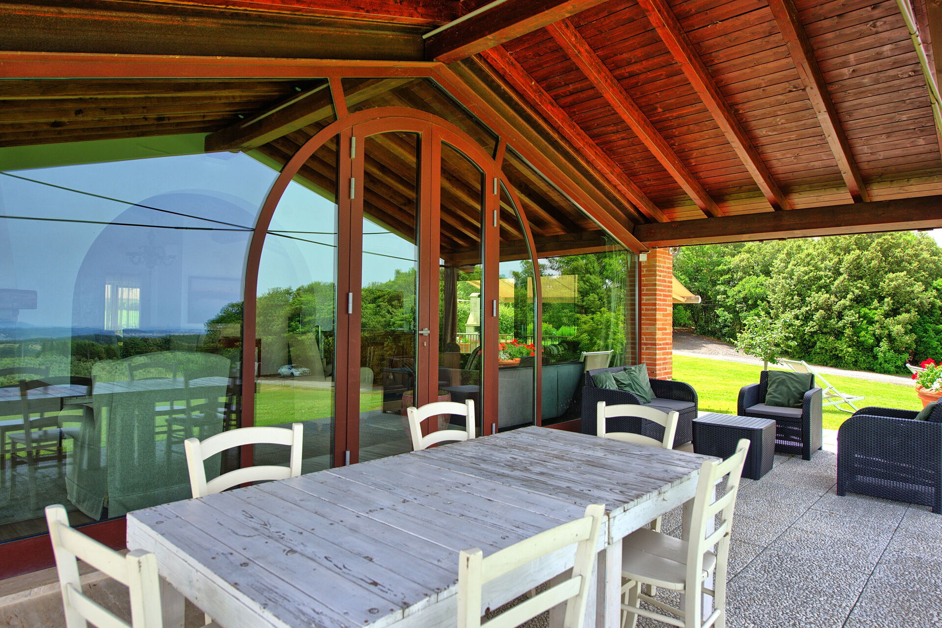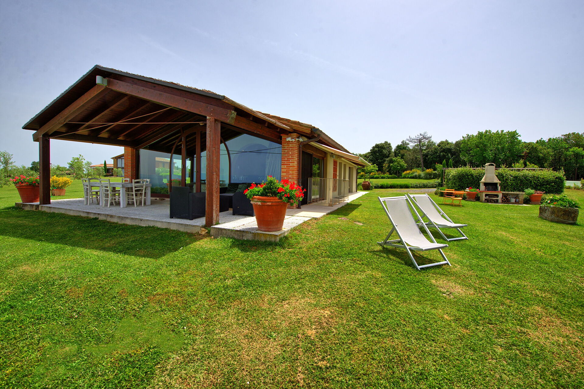 Uscendo dal soggiorno si accede ad una panoramica veranda attrezzata con tavolo e sedie per mangiare all'aperto; barbecue e grande giardino.