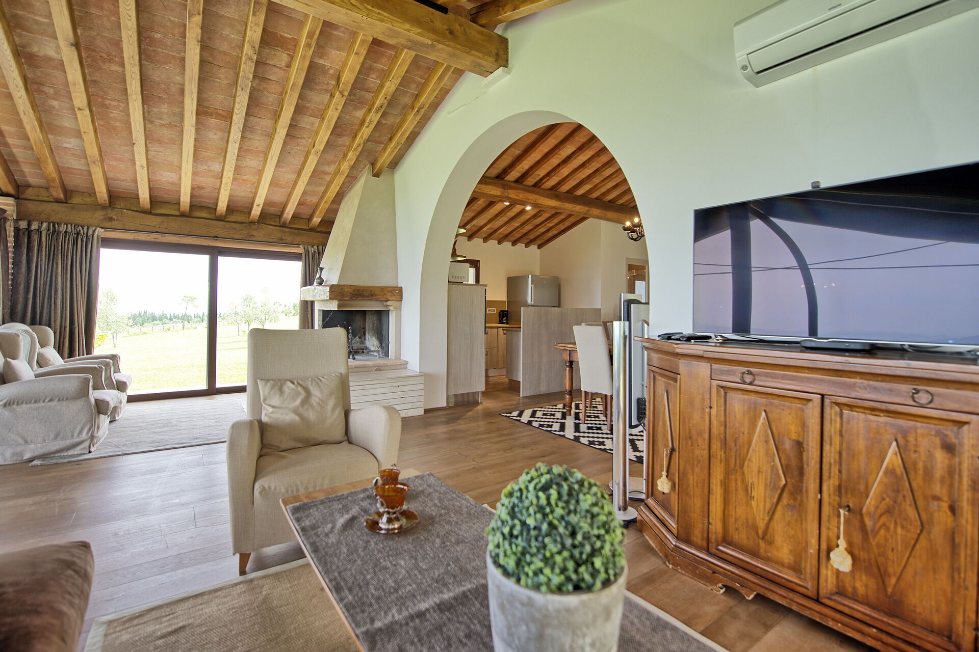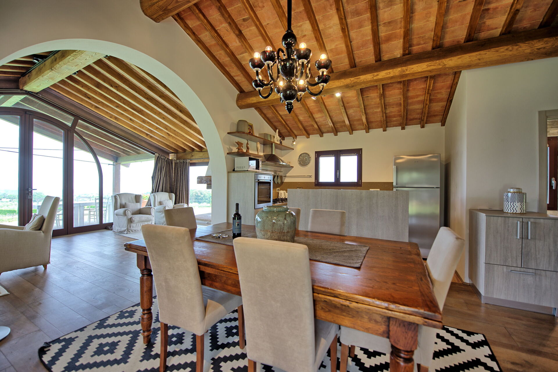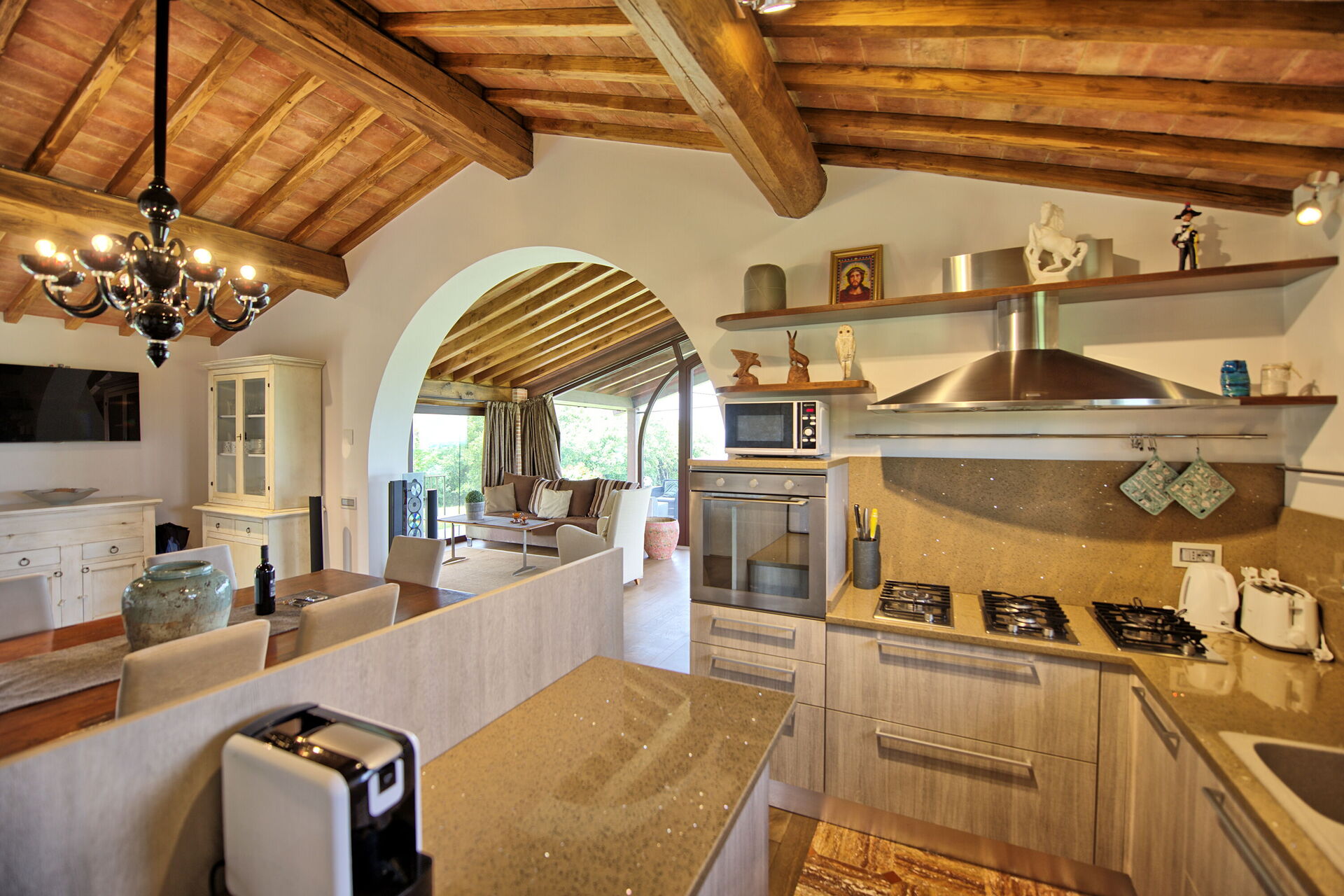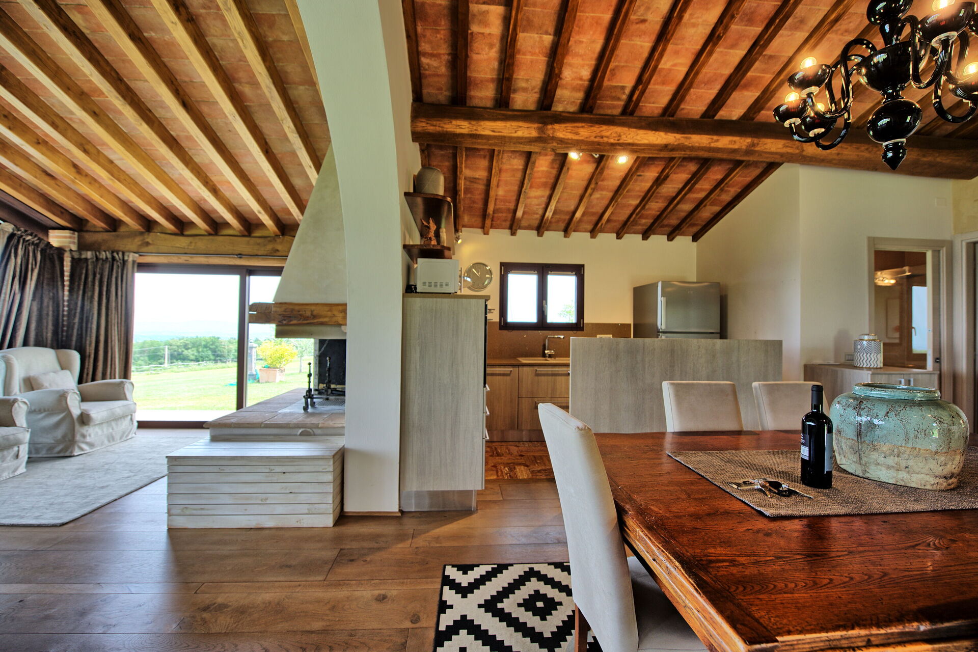 Piano terreno: luminoso e panoramico soggiorno con camino, zona pranzo e cucina (forno, freezer, lavastoviglie, microonde, tostapane), 2 camere matrimoniali con bagno privato con doccia.