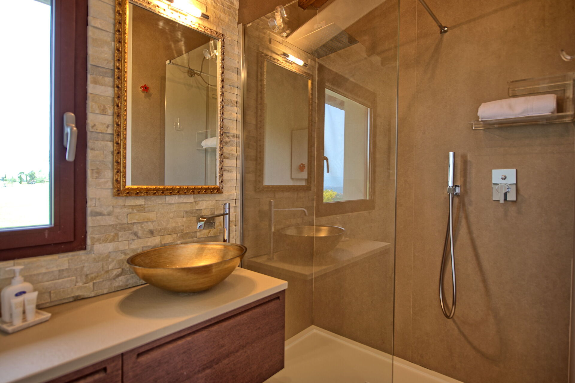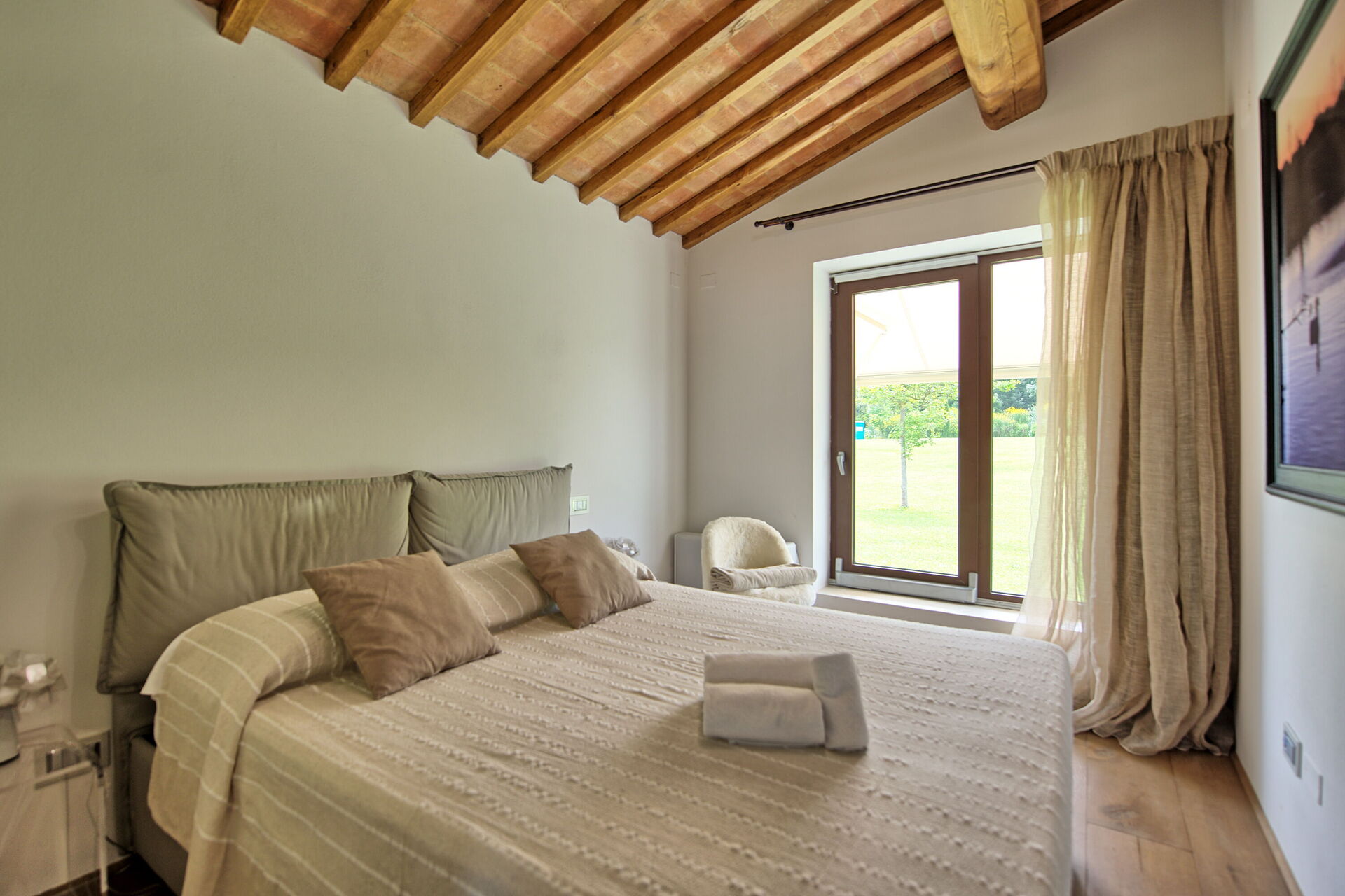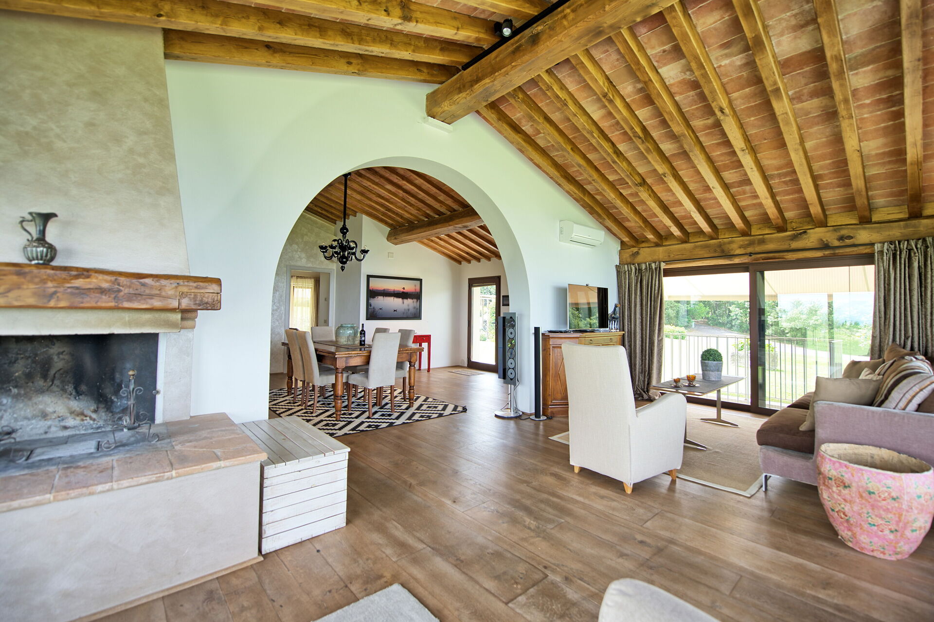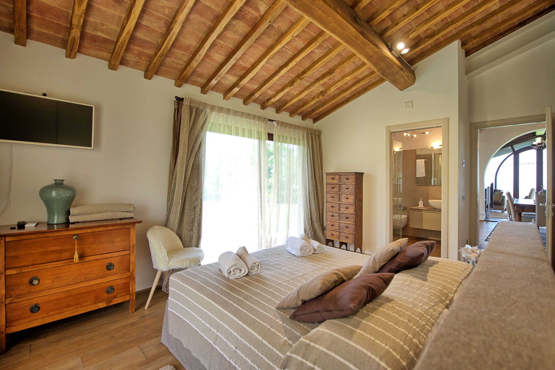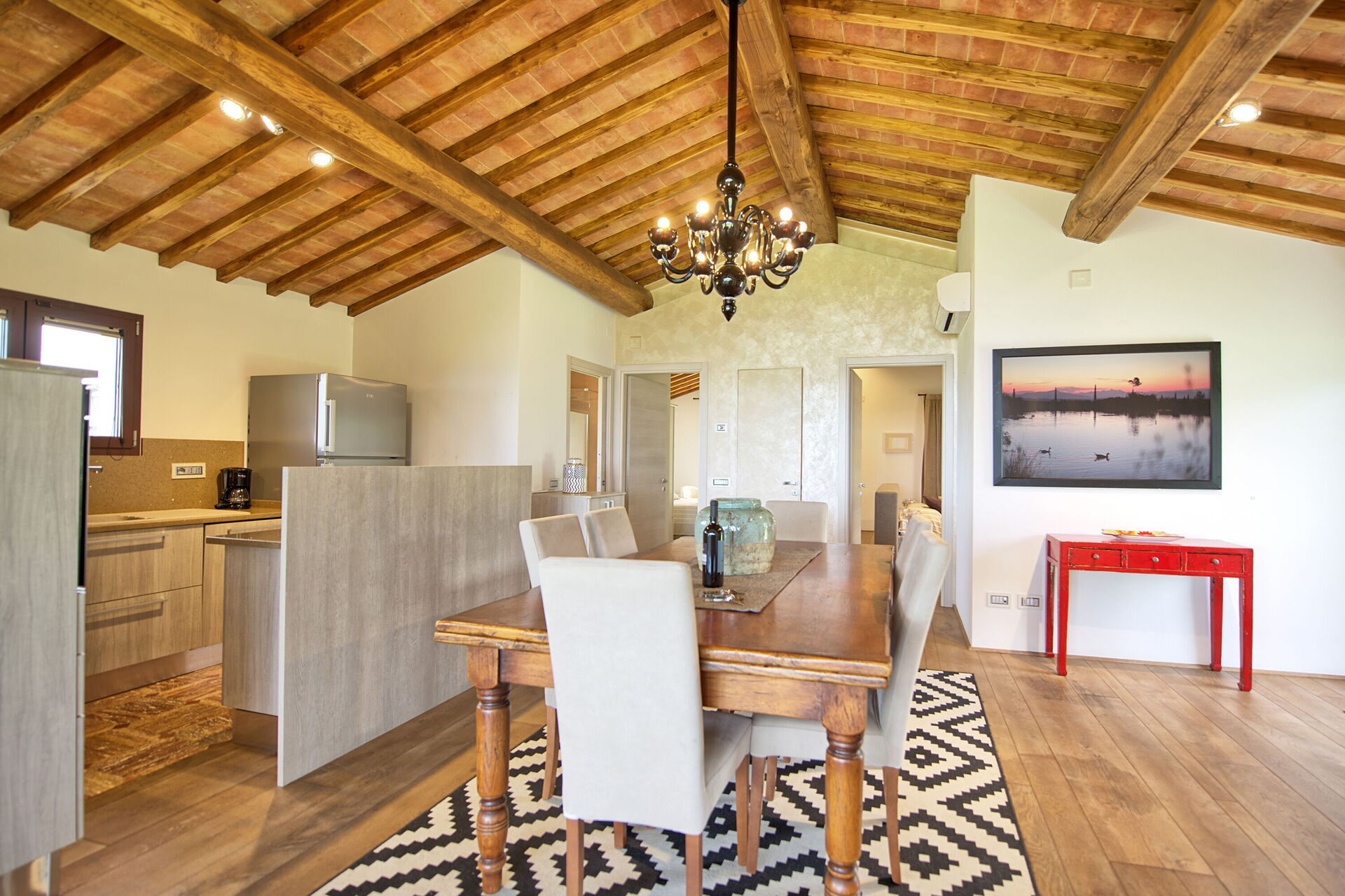 Piano terreno: luminoso e panoramico soggiorno con camino, zona pranzo e cucina (forno, freezer, lavastoviglie, microonde, tostapane), 2 camere matrimoniali con bagno privato con doccia.