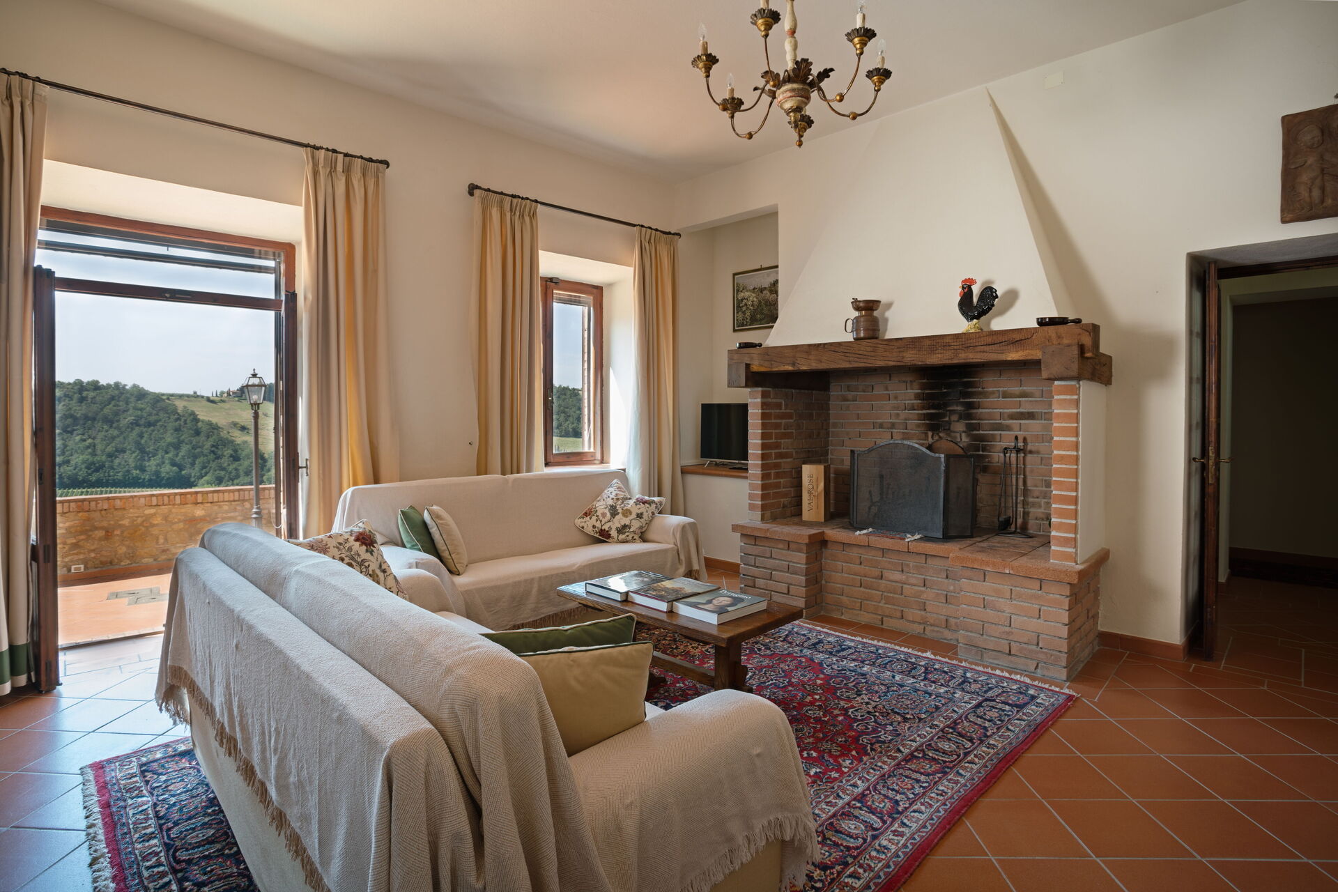Piano terreno: soggiorno (TV e camino) con zona pranzo e accesso sull'esterno, cucina (forno, lavastoviglie, microonde, bollitore, tostapane, macchina da caffè espresso, frigorifero, freezer), WC.