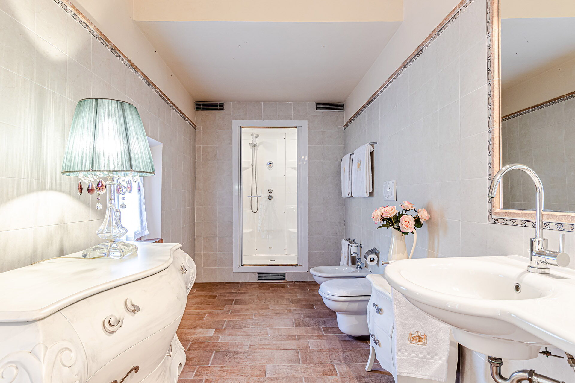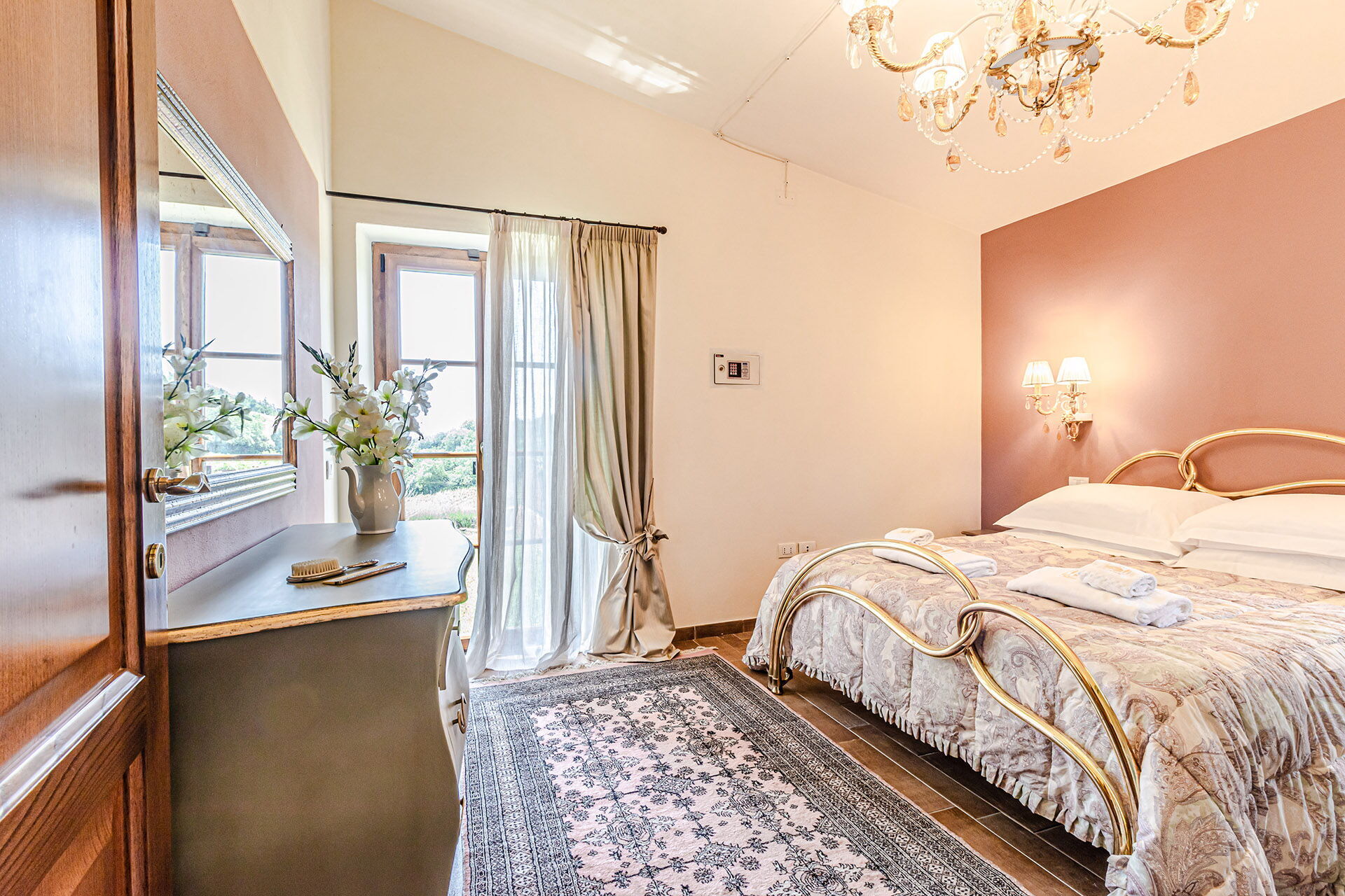 Piano primo: (accessibile solo dall’esterno e non collegata internamente al resto della villa): camera matrimoniale (aria condizionata, camino) con bagno privato con doccia e con accesso alla terrazza panoramica.