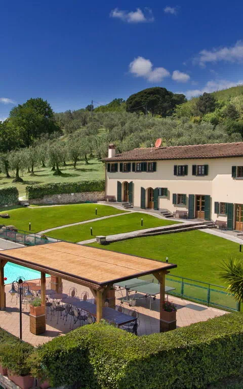 Dal cancello una lunga strada (illuminata) in ghiaia bianca porta alla villa, interamente circondata da mura in pietra ed in posizione dominante su tutta la Valdinievole con un panorama fantastico a 360°.