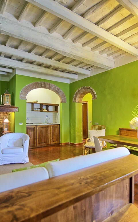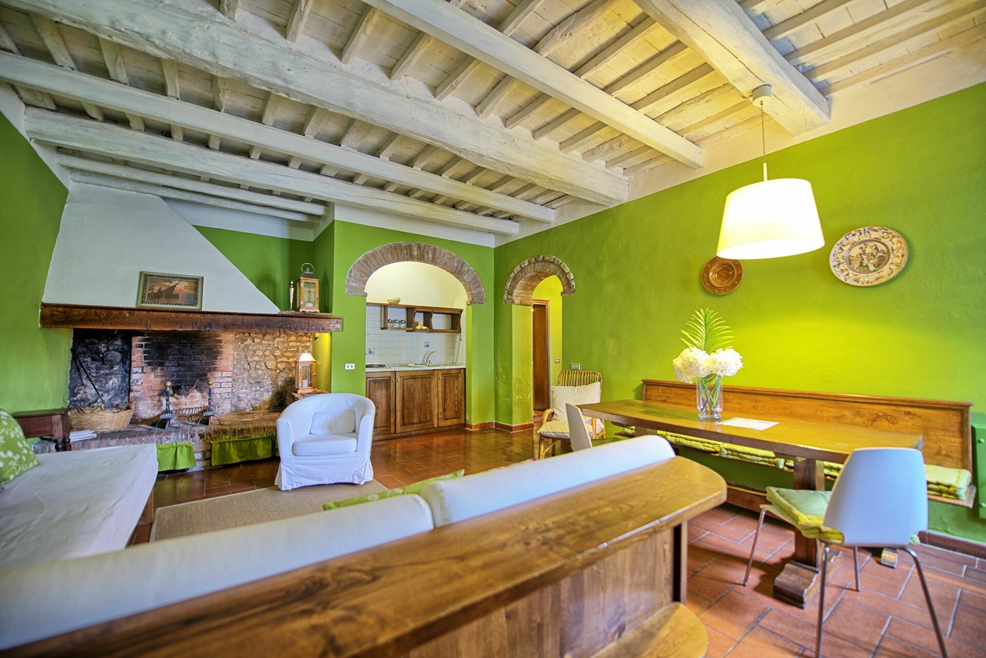 Piano terreno: ampio soggiorno con zona pranzo, bel camino, angolo cottura e 2 divani letto singoli, camera matrimoniale, bagno con doccia.