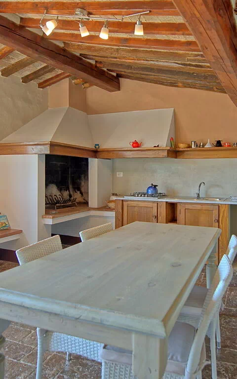 2° Piano: ampio e luminoso soggiorno con grandi finestre che si affacciano sui tetti del castello e sulla campagna circostante con zona pranzo, angolo cottura, grande camera matrimoniale (aria condizionata), bagno con doccia.
