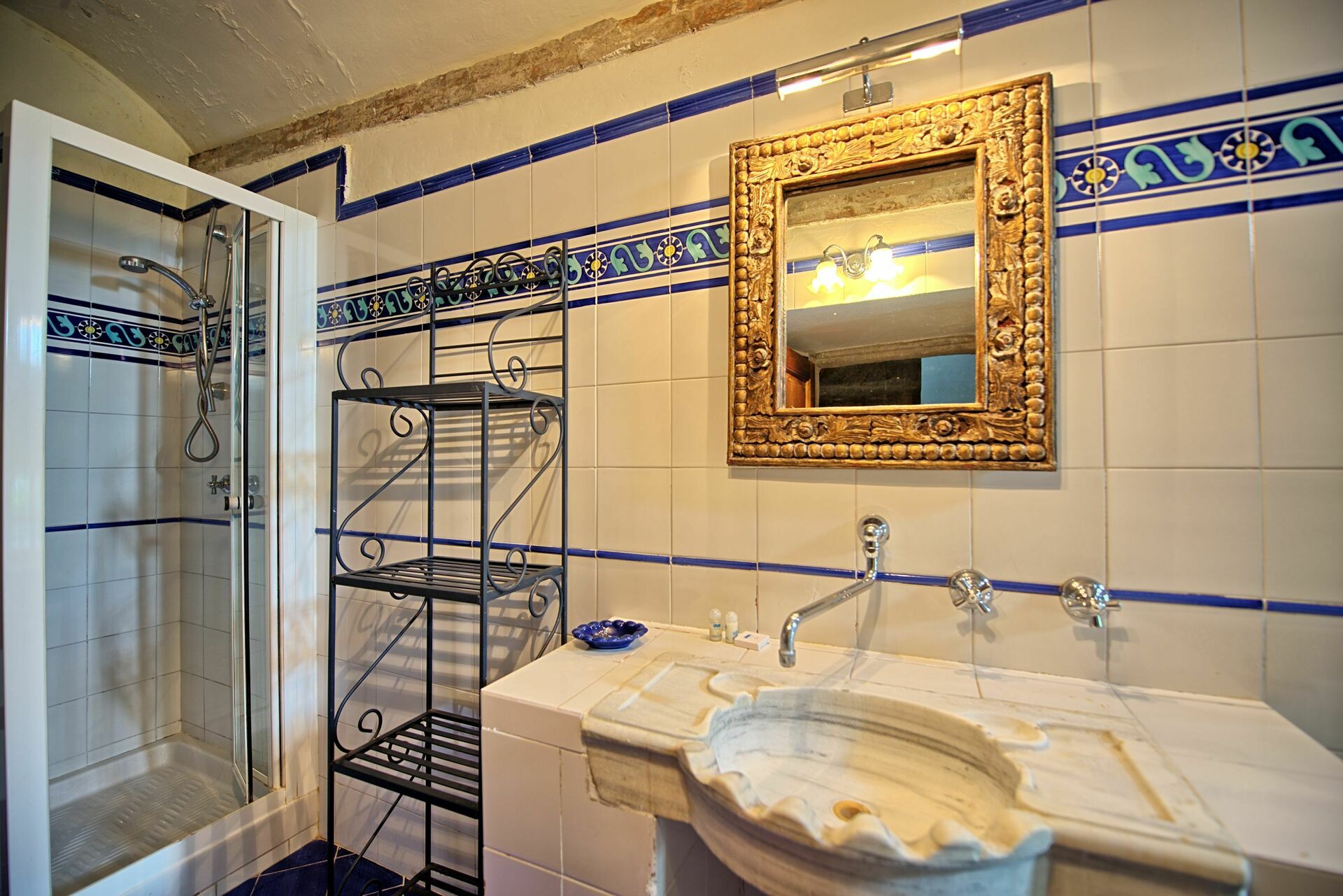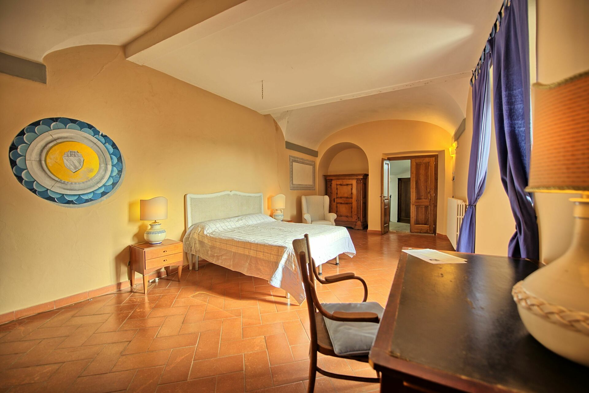 1° Piano (accesso tramite una scala a chiocciola in pietra oppure dall’esterno): ampia camera matrimoniale con aria condizionata e piccola terrazza con bellissima vista sulla campagna circostante.