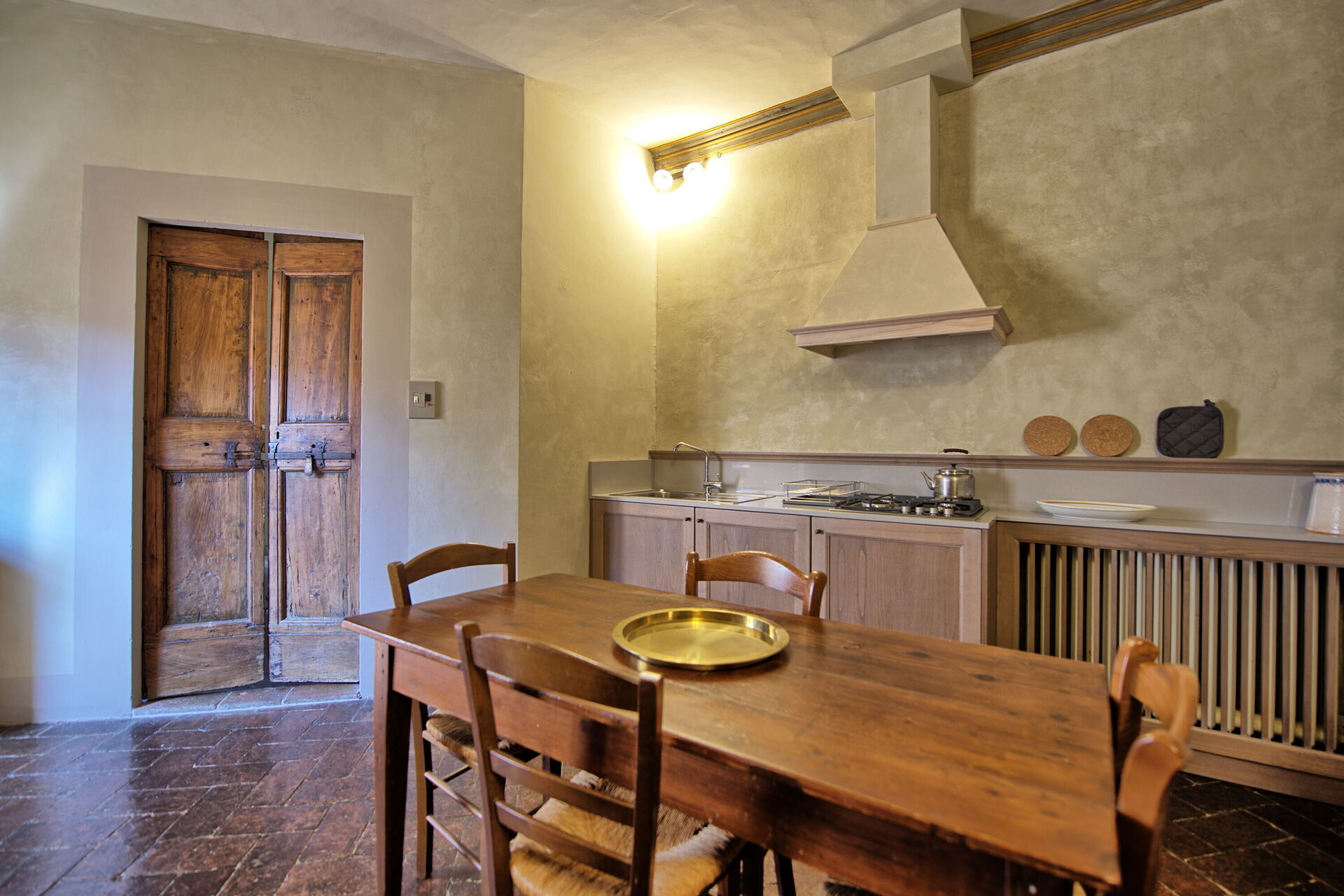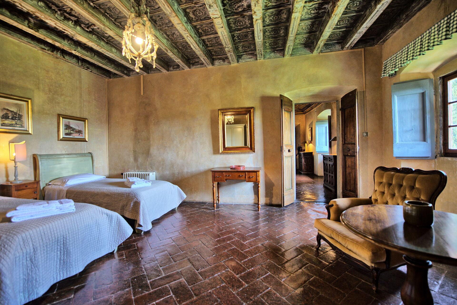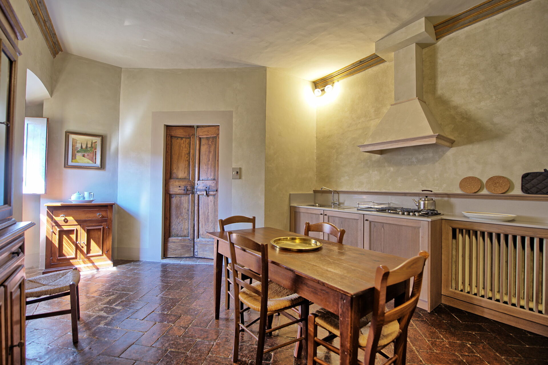 1° piano: soggiorno con zona pranzo e camino originale (non più in funzione), vista sul giardino principale e sulla campagna circostante, camera con due letti singoli, camera matrimoniale con vista sulla corte principale. Cucina, bagno con doccia.