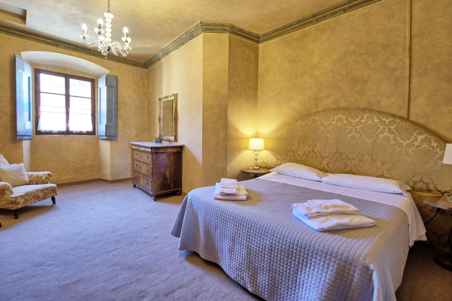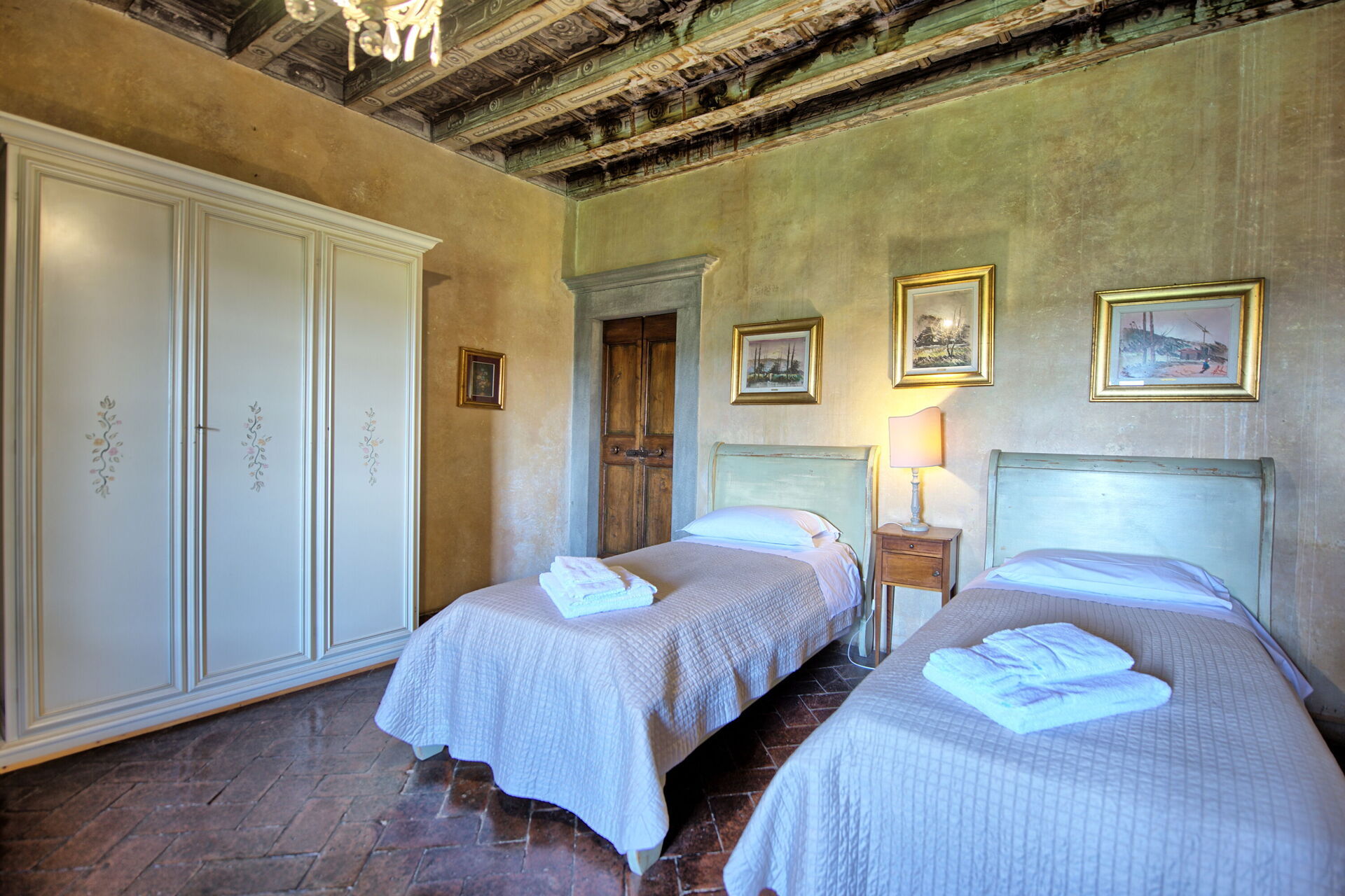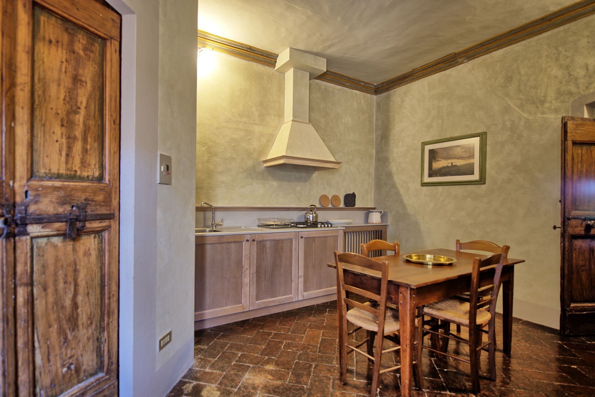 1° piano: soggiorno con zona pranzo e camino originale (non più in funzione), vista sul giardino principale e sulla campagna circostante, camera con due letti singoli, camera matrimoniale con vista sulla corte principale. Cucina, bagno con doccia.