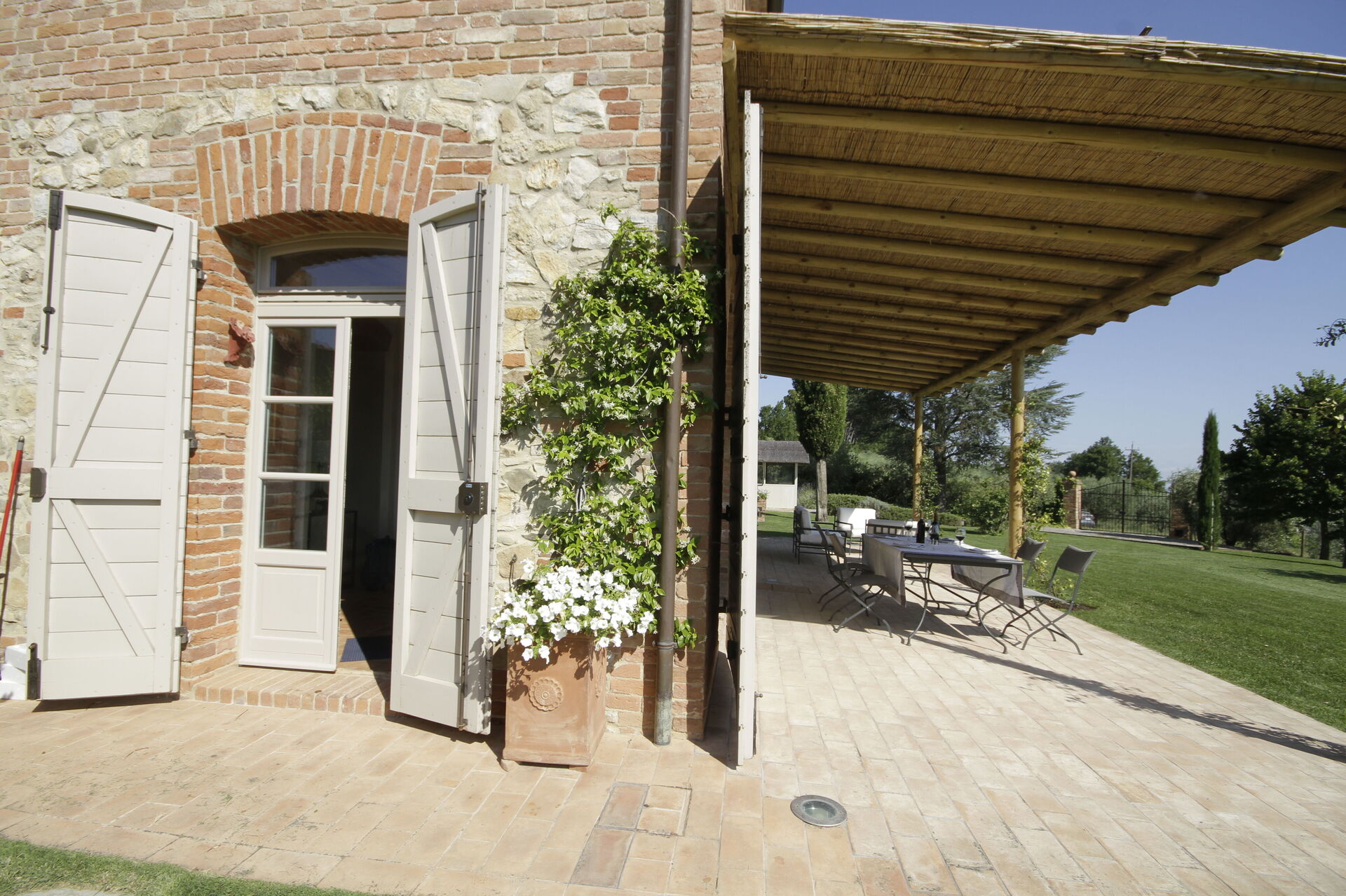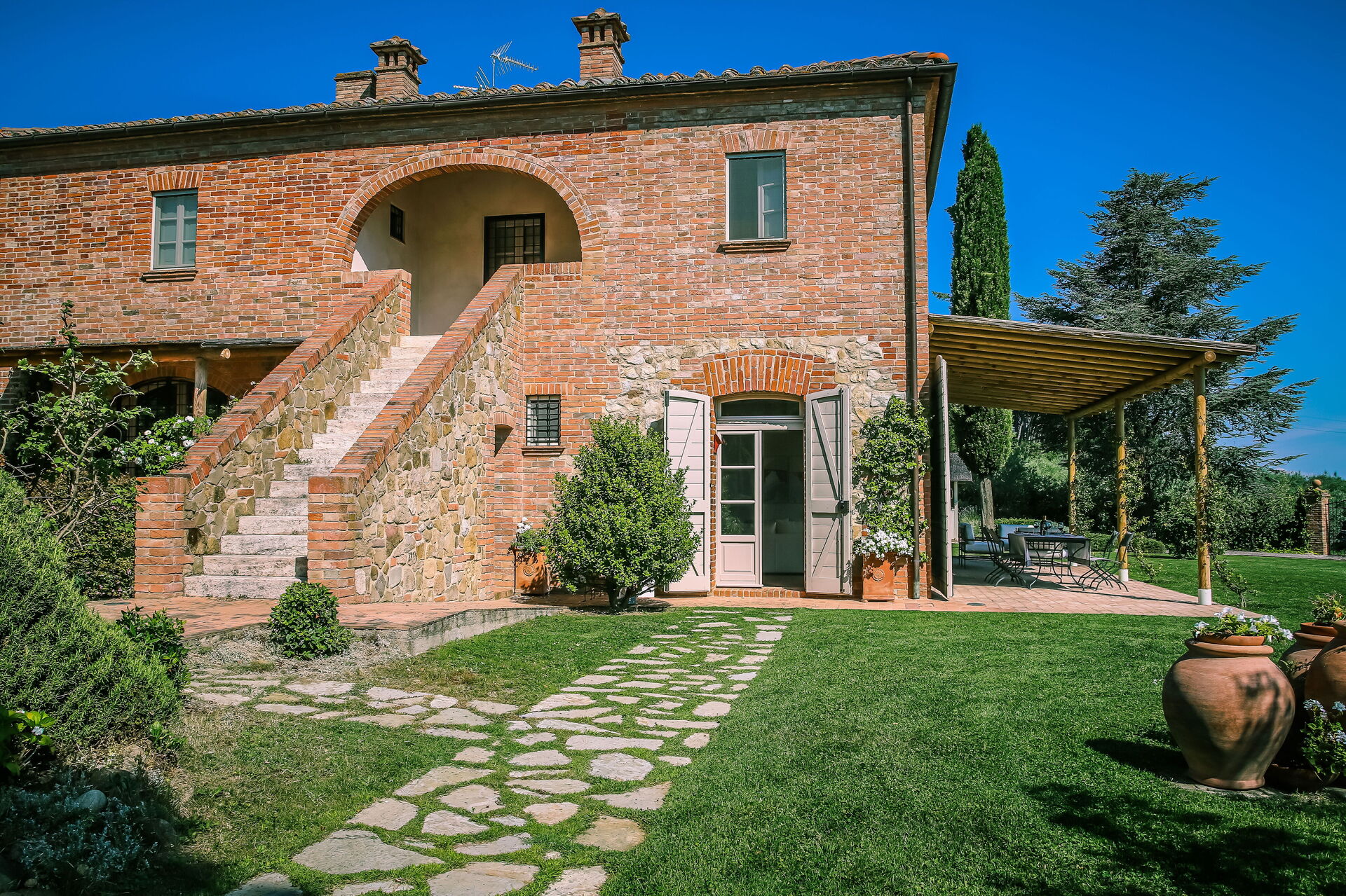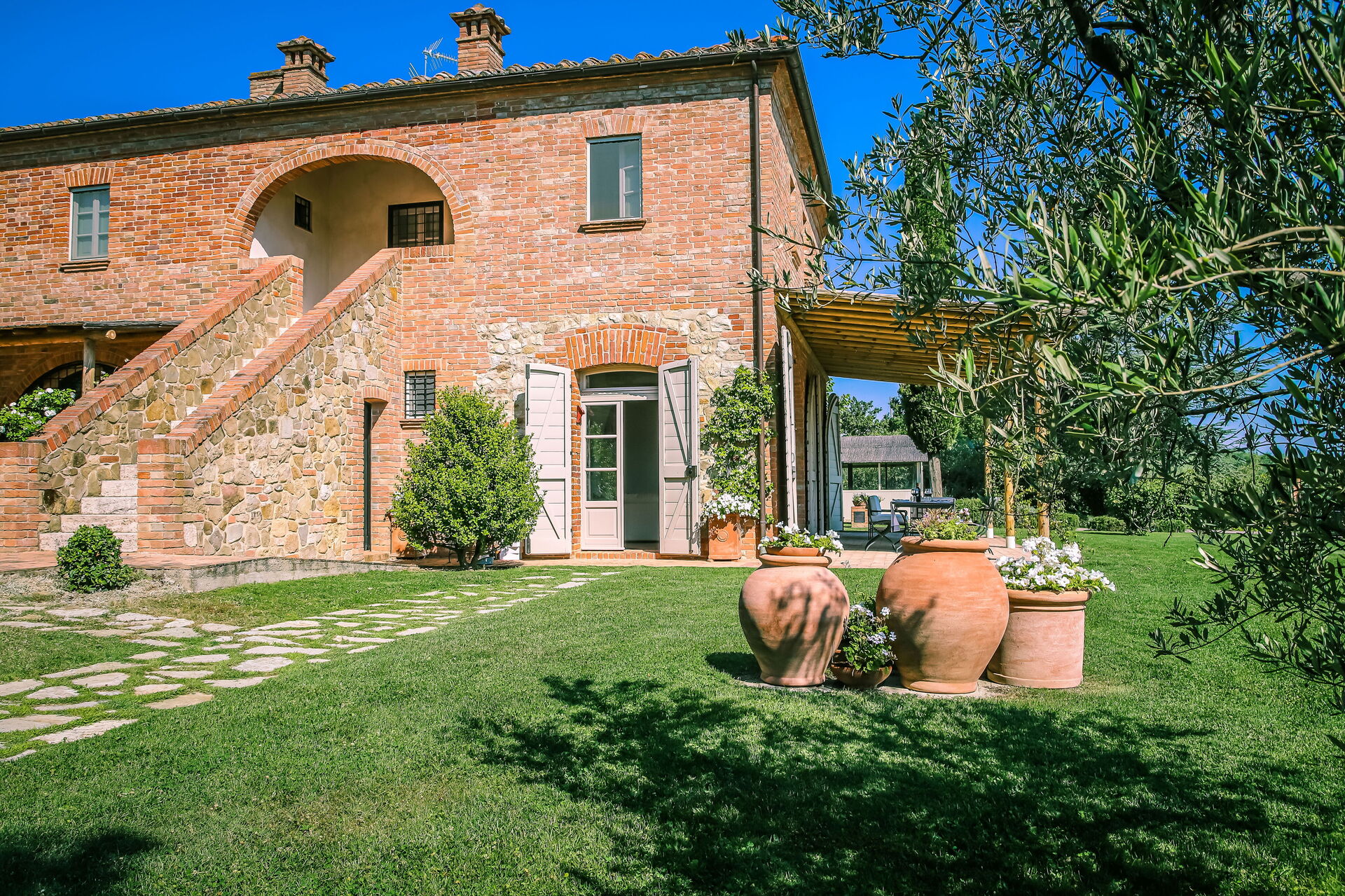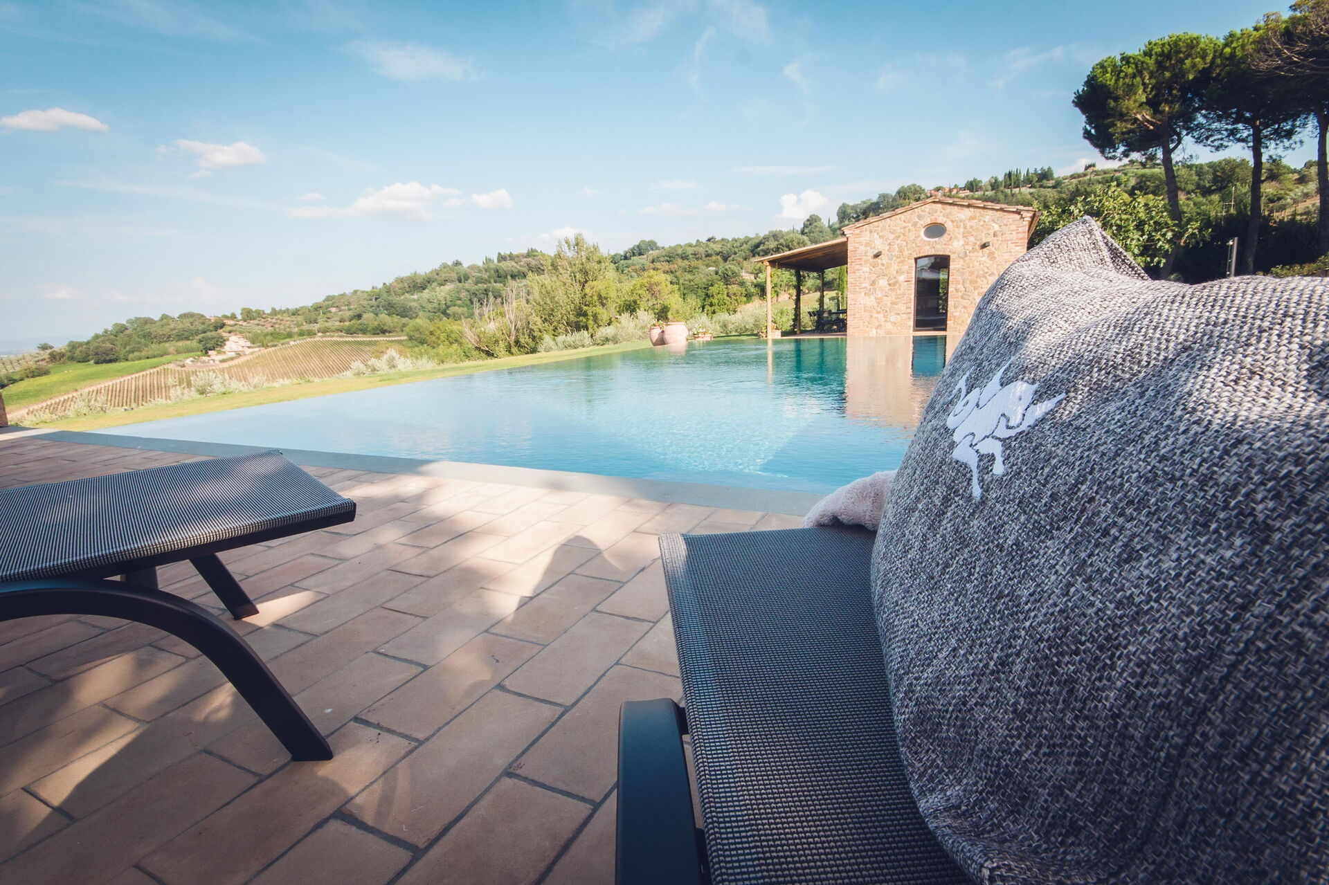 Questa esclusiva dimora si trova in posizione tranquilla e molto panoramica con vista sui vigneti e sulle dolci colline della Val d'Orcia e sulla vallata della Valdichiana. Questo territorio in Toscana è famoso in tutto il mondo per i suoi paesaggi e per la qualità dei vini e dell'olio di oliva che vi vengono prodotti.