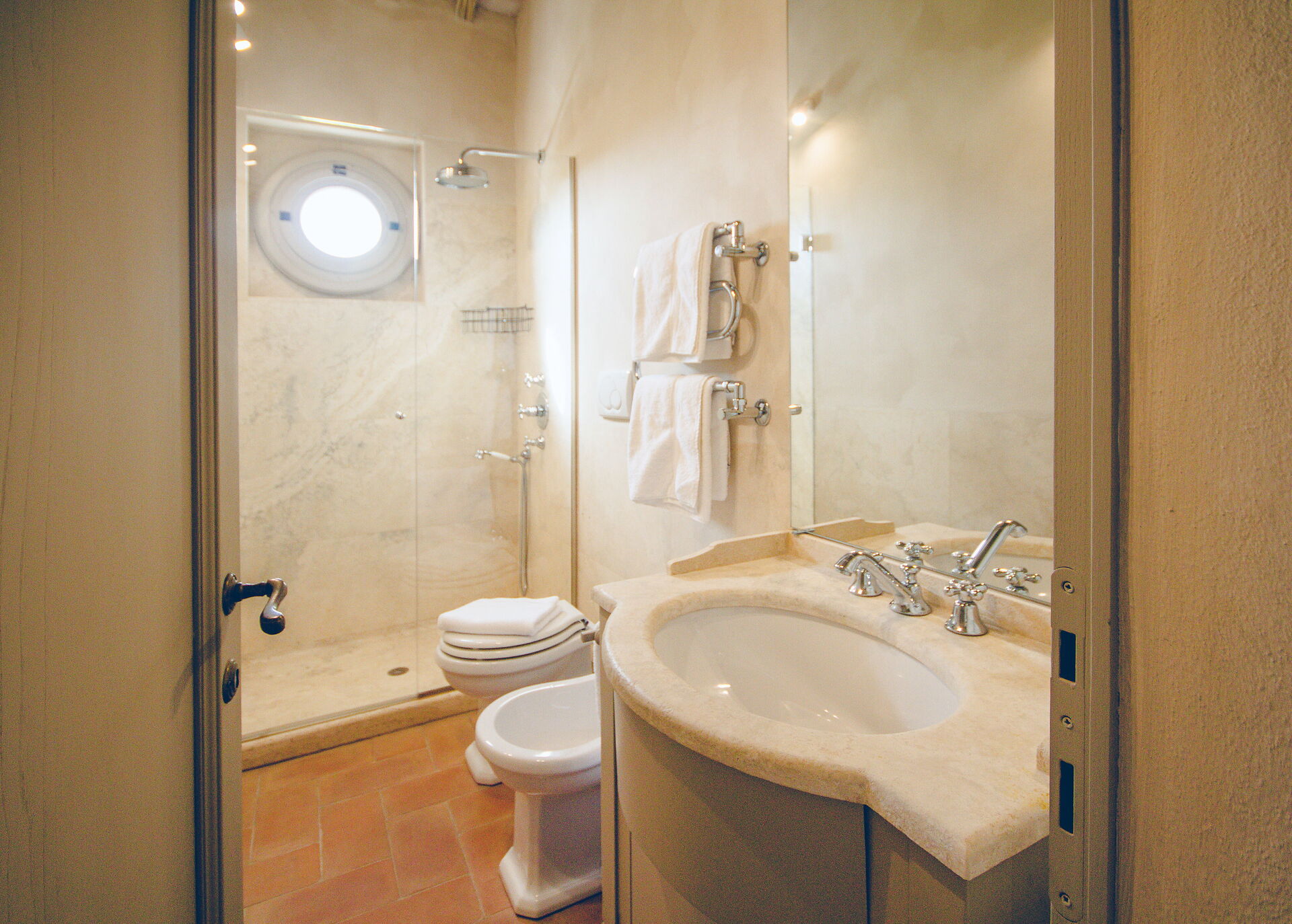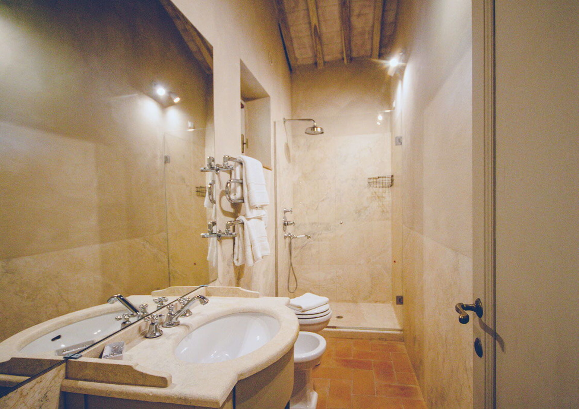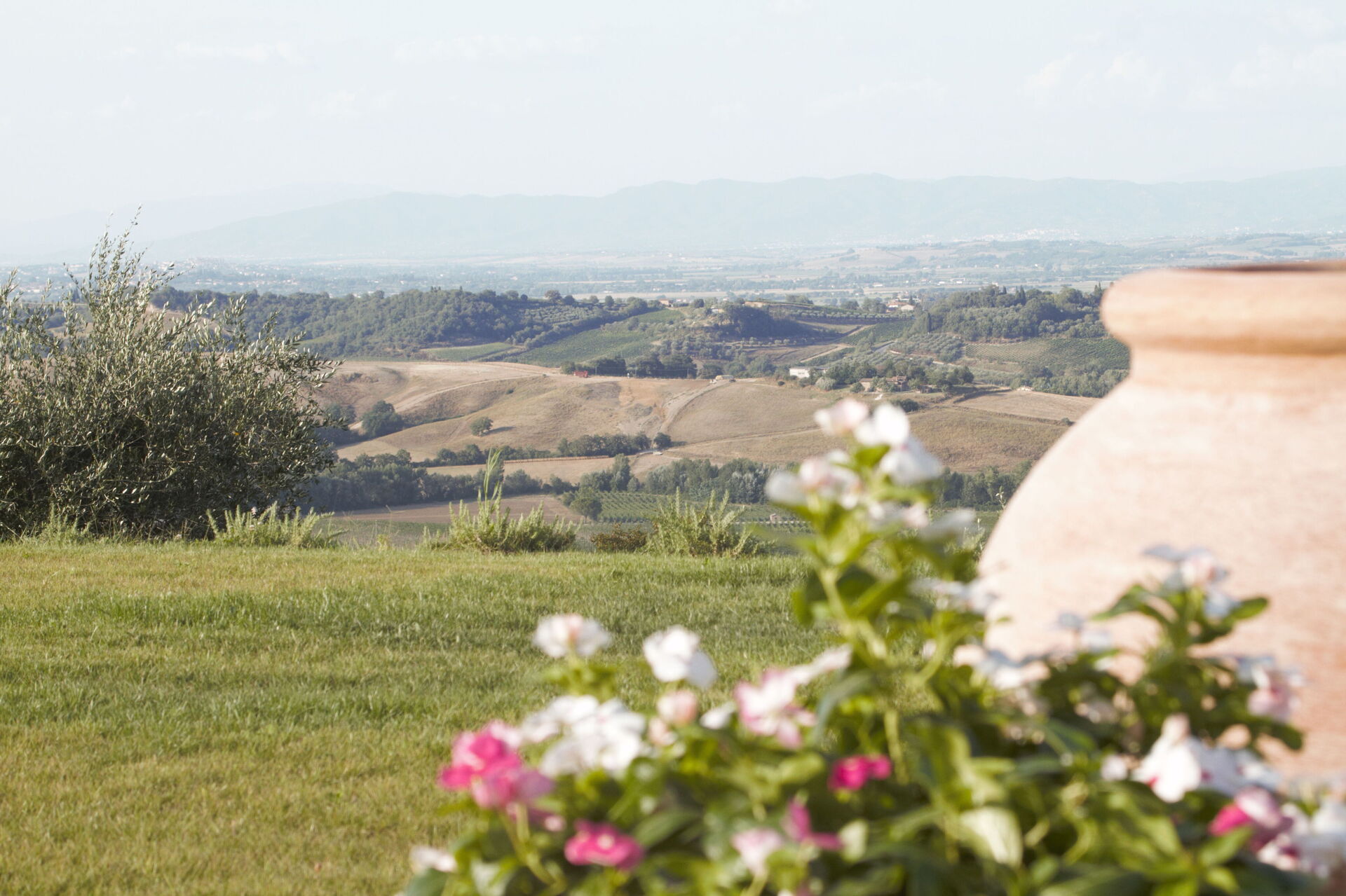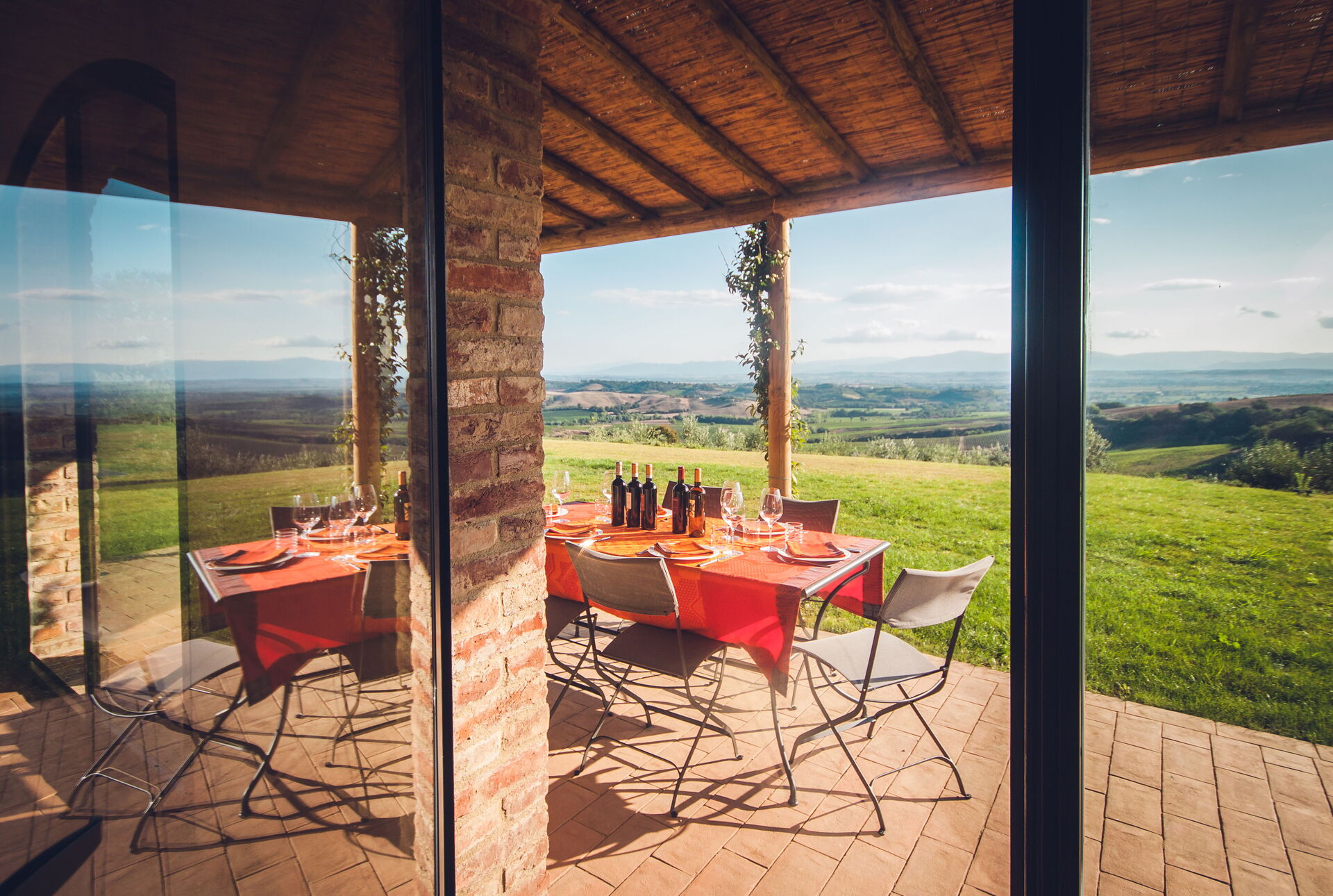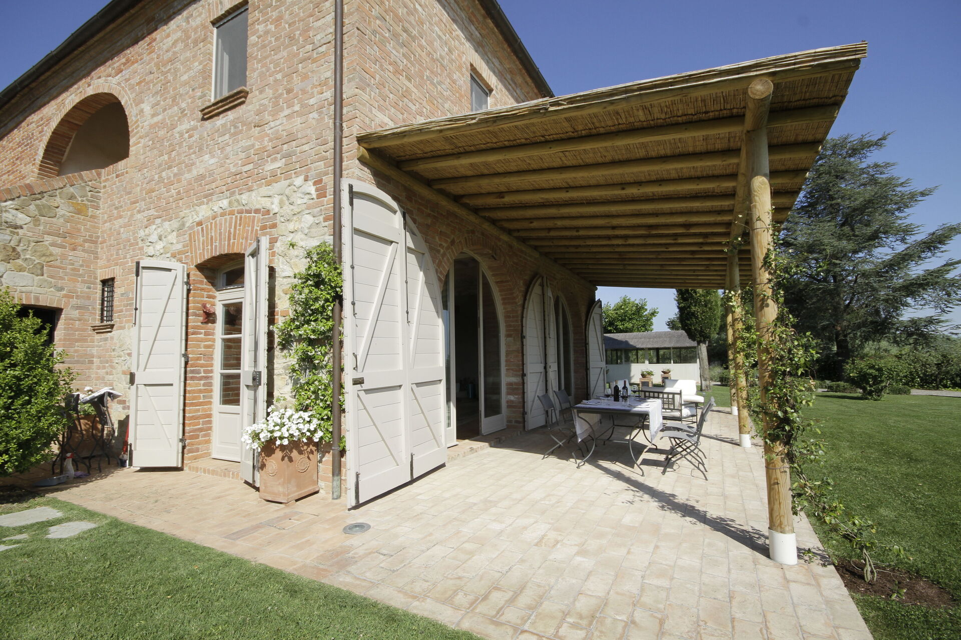 Questa esclusiva dimora si trova in posizione tranquilla e molto panoramica con vista sui vigneti e sulle dolci colline della Val d'Orcia e sulla vallata della Valdichiana. Questo territorio in Toscana è famoso in tutto il mondo per i suoi paesaggi e per la qualità dei vini e dell'olio di oliva che vi vengono prodotti.