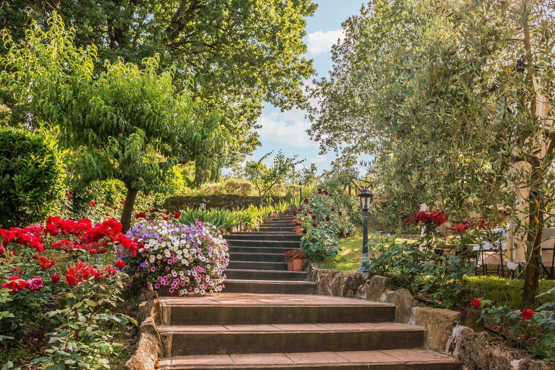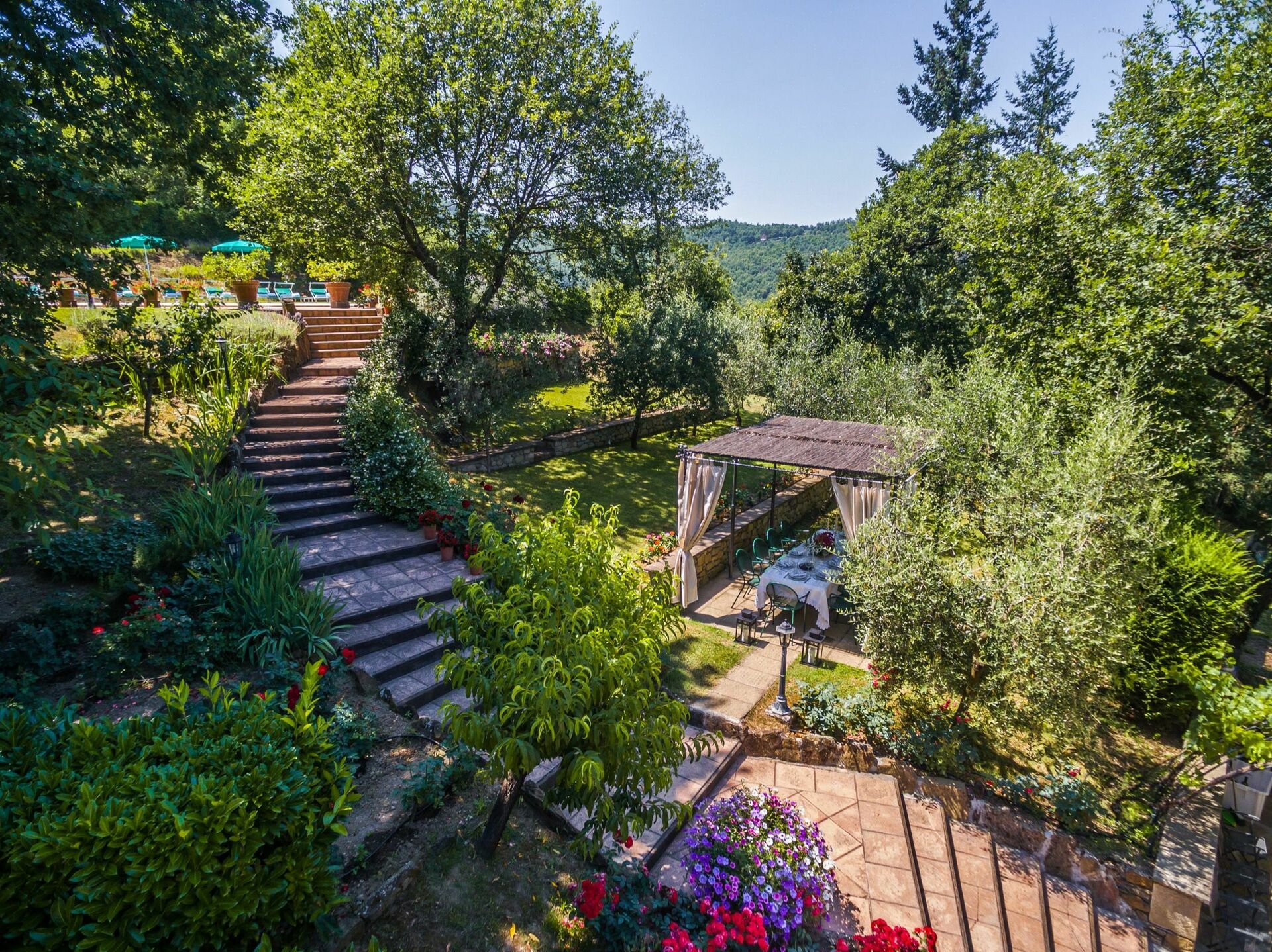 All'esterno un ampio e sempre ben curato giardino di circa 1000 m2 ospita piante, fiori, bellissime rose e una panoramica piscina con annessa piscina idromassaggio Jacuzzi. Accanto alla piscina un bel gazebo attrezzato e un barbecue permettono di mangiare all'aria aperta affacciati sul medievale paese di Monterchi.