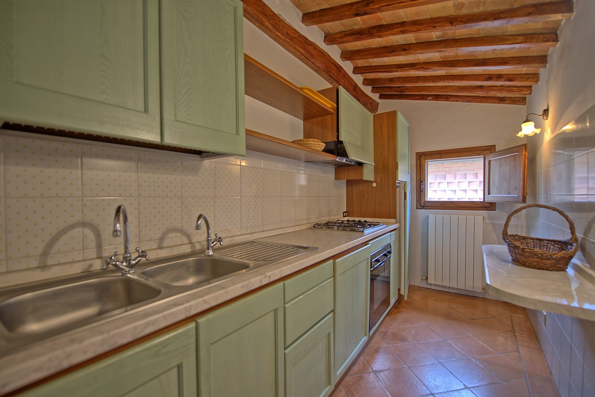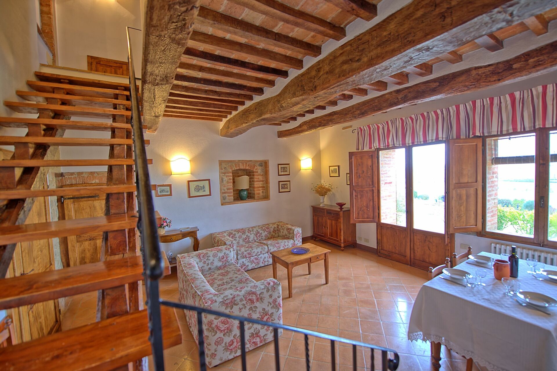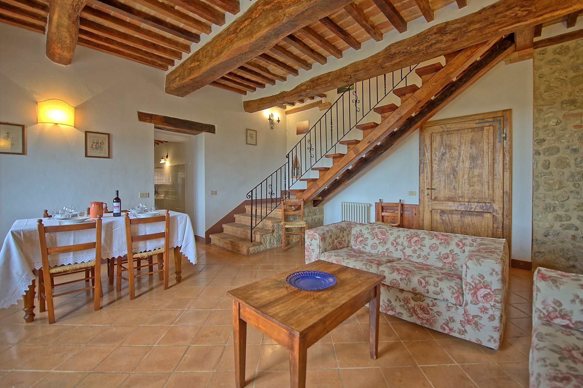 Piano terreno: soggiorno con zona pranzo e accesso sull’esterno (spazio esterno privato con tavolo e sedie), piccola cucina aperta (forno, lavastoviglie).