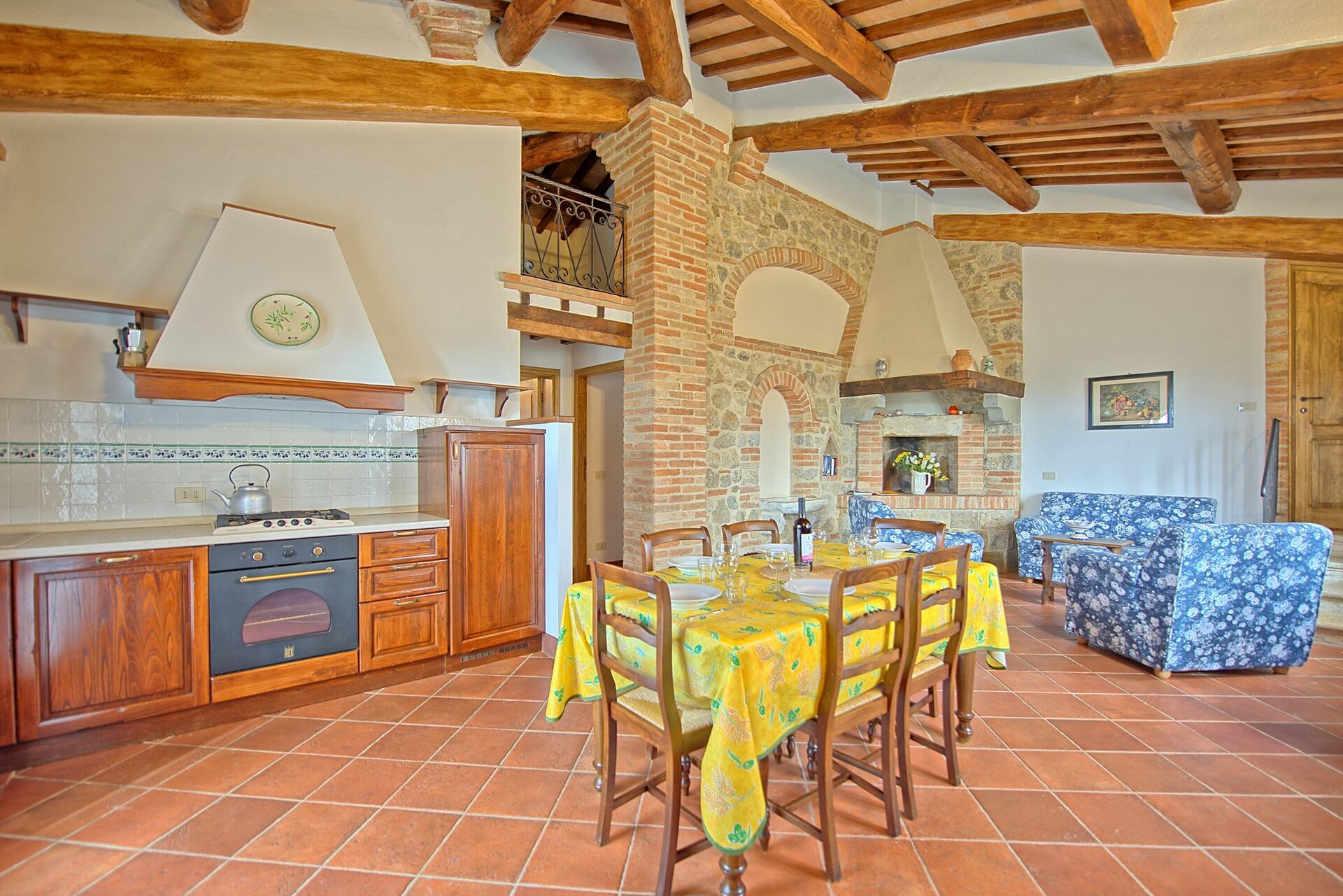 Piano terreno: spazioso e bel soggiorno con zona pranzo, camino, angolo cottura (forno, freezer, lavastoviglie) ed accesso sull’esterno (con simpatico gazebo), camera matrimoniale, camera con 2 letti singoli, bagno con doccia.