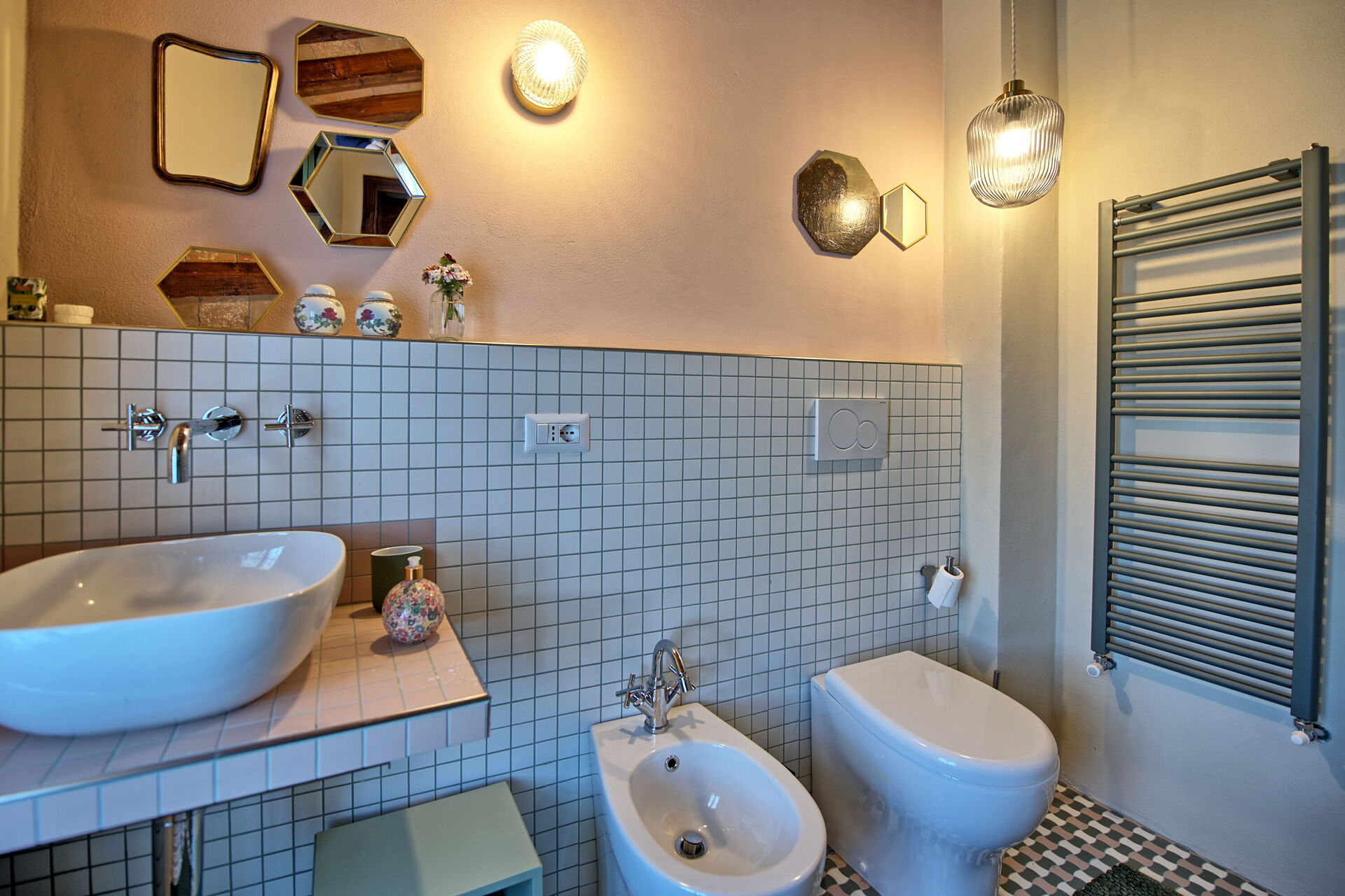 8 gradini sopra: camera matrimoniale (aria condizionata) con bagno privato con doccia.