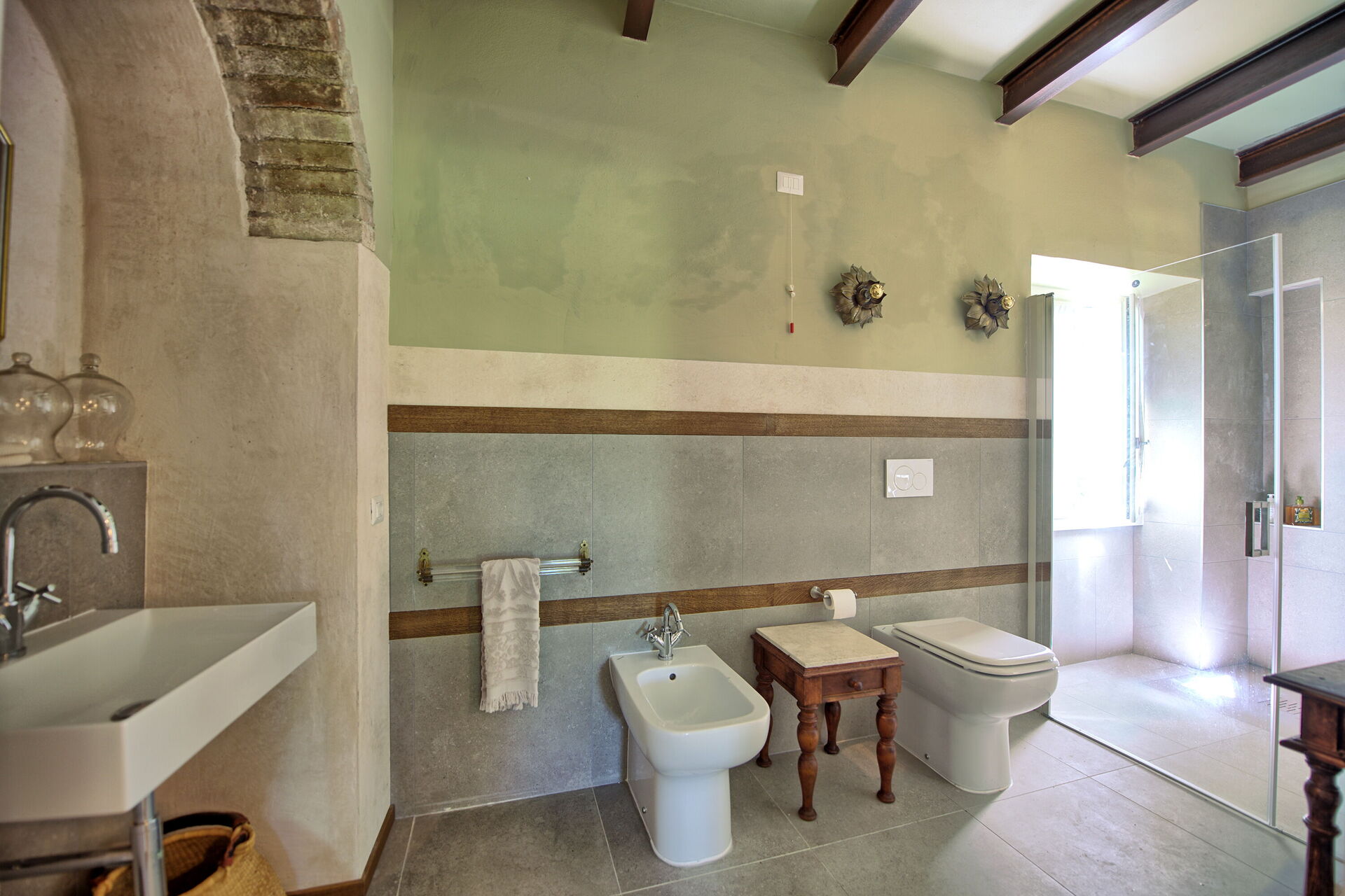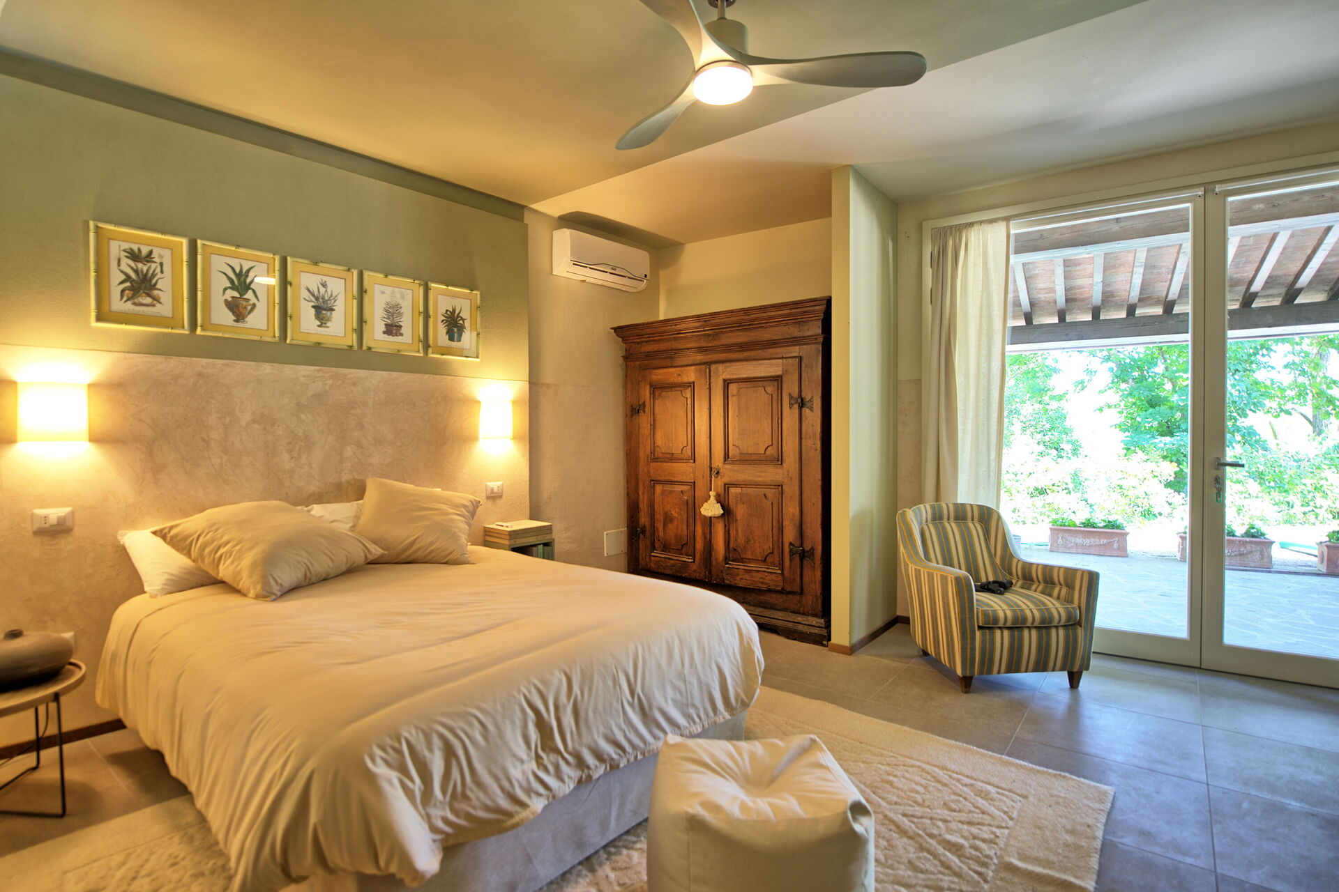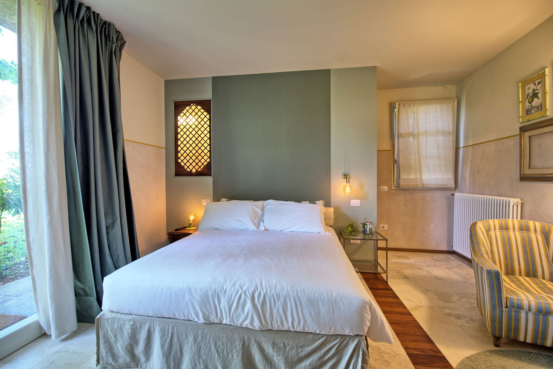 Piano terreno (non collegata internamente al resto della villa): camera matrimoniale (aria condizionata e ventilatore) con bagno privato con doccia adatto ad ospitare persone con disabilità.