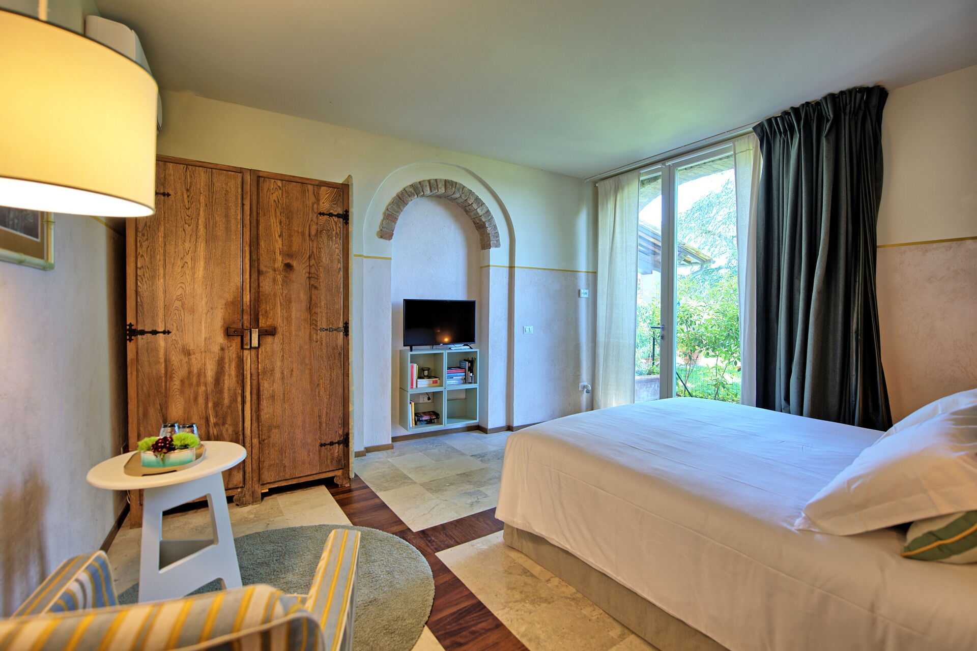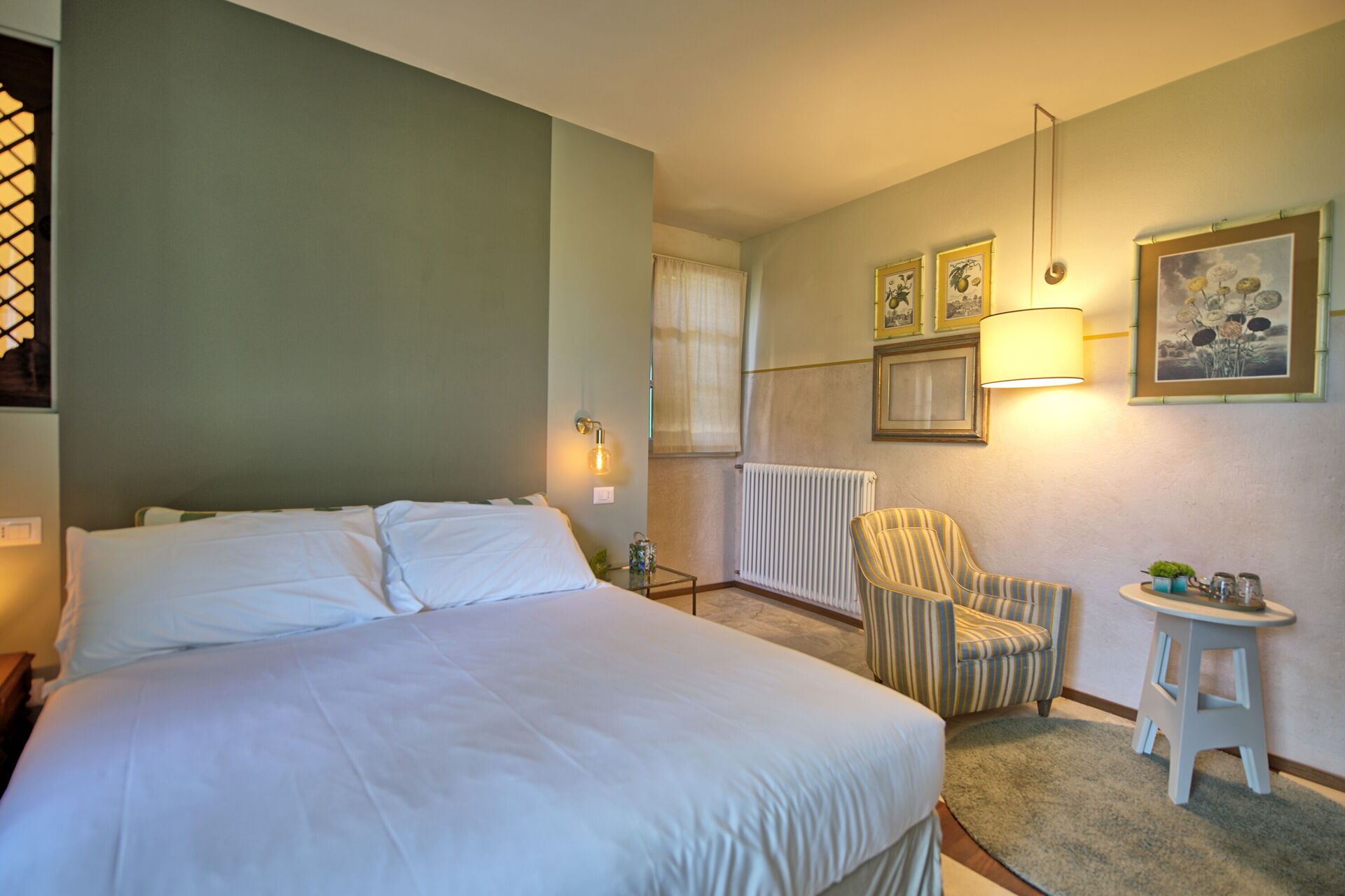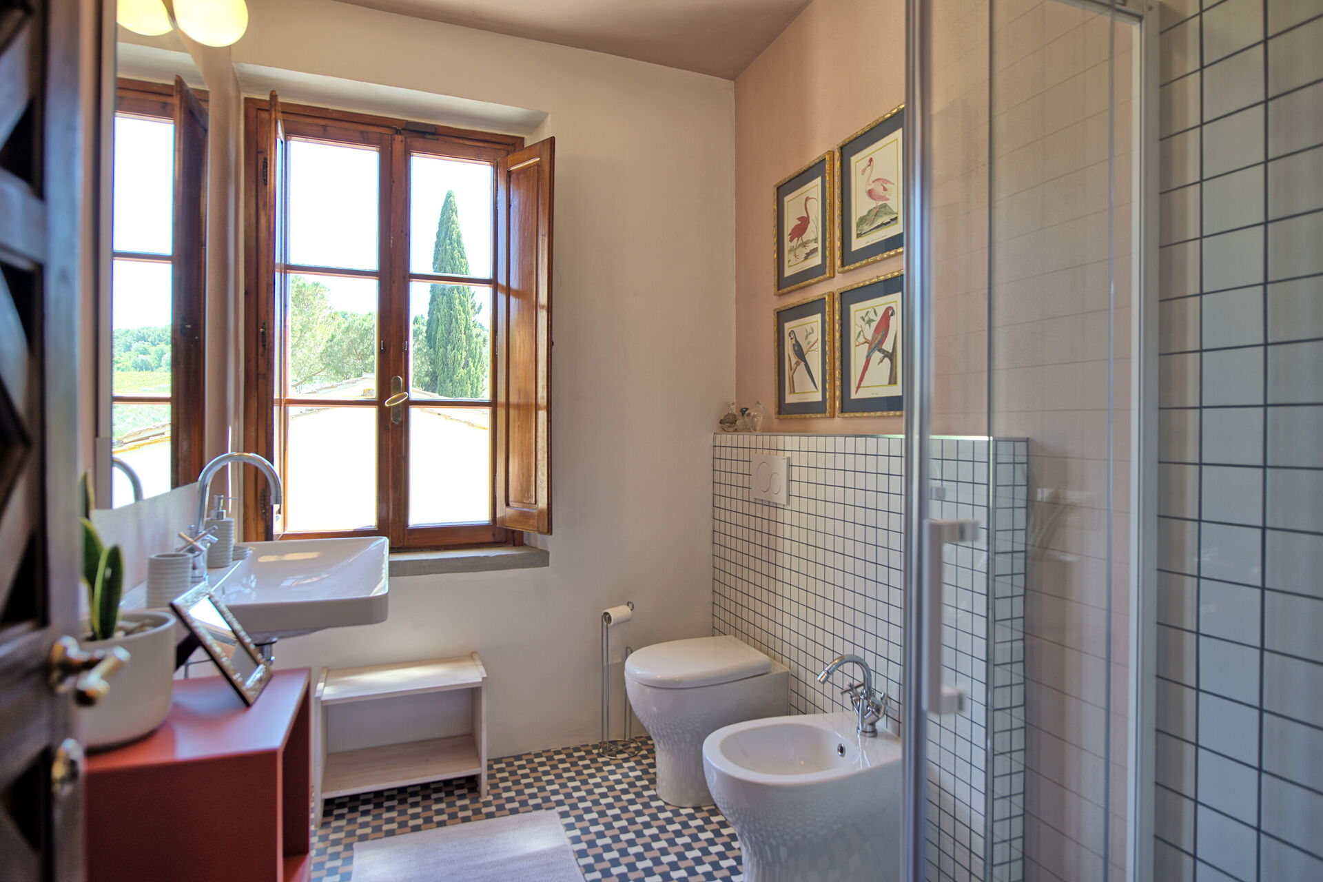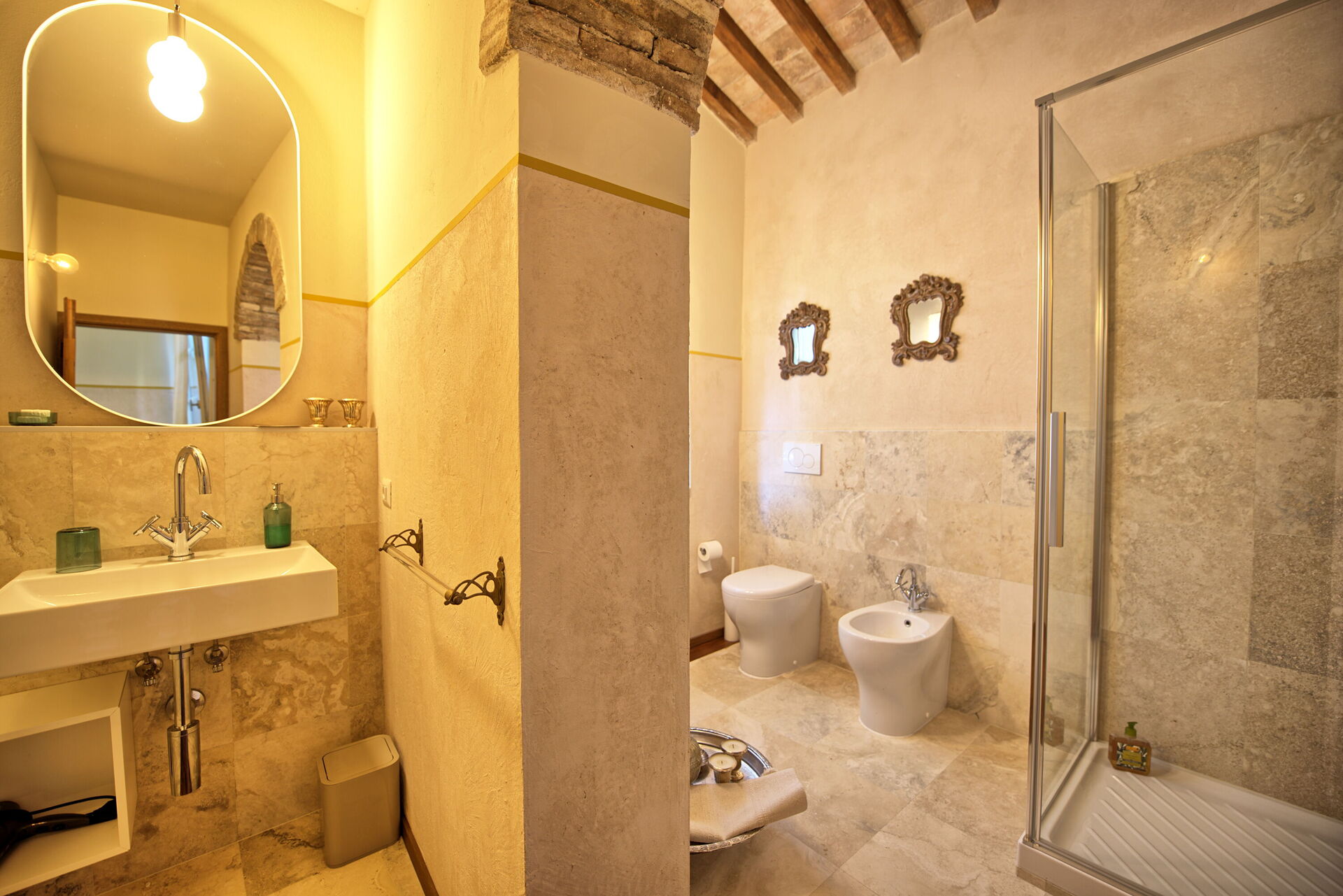 Piano terreno (non collegata internamente al resto della villa): camera matrimoniale (aria condizionata e ventilatore) con bagno privato con doccia adatto ad ospitare persone con disabilità.