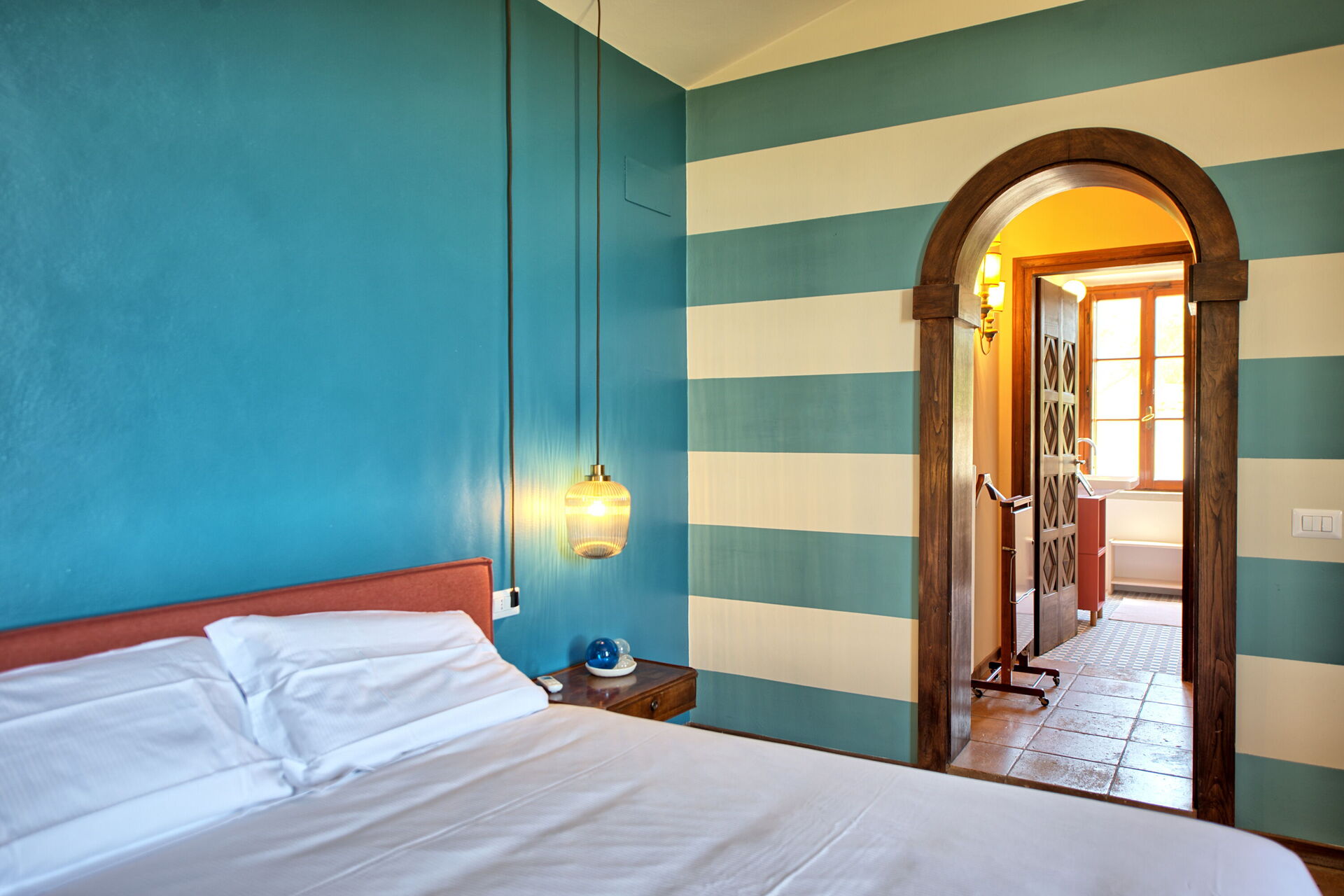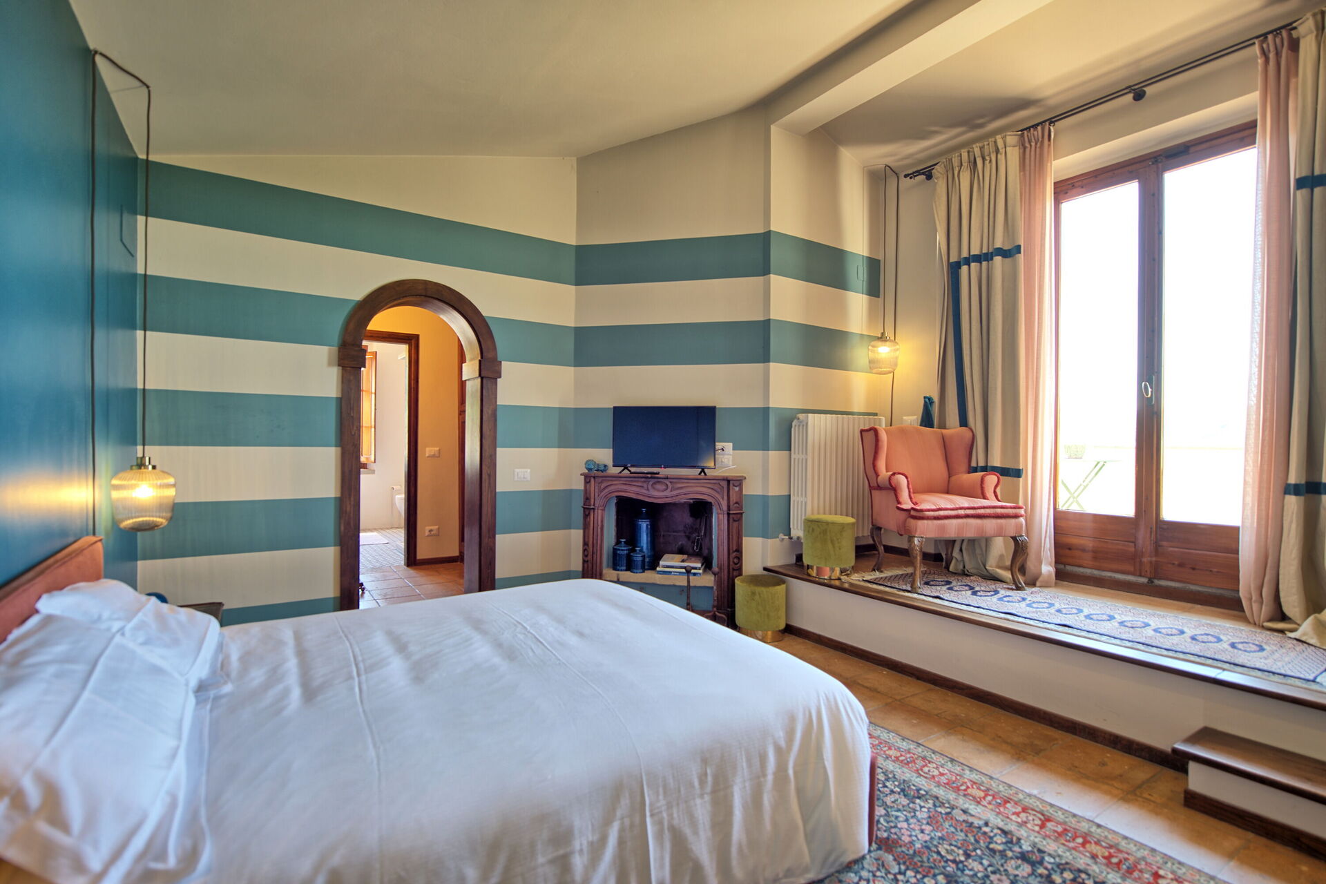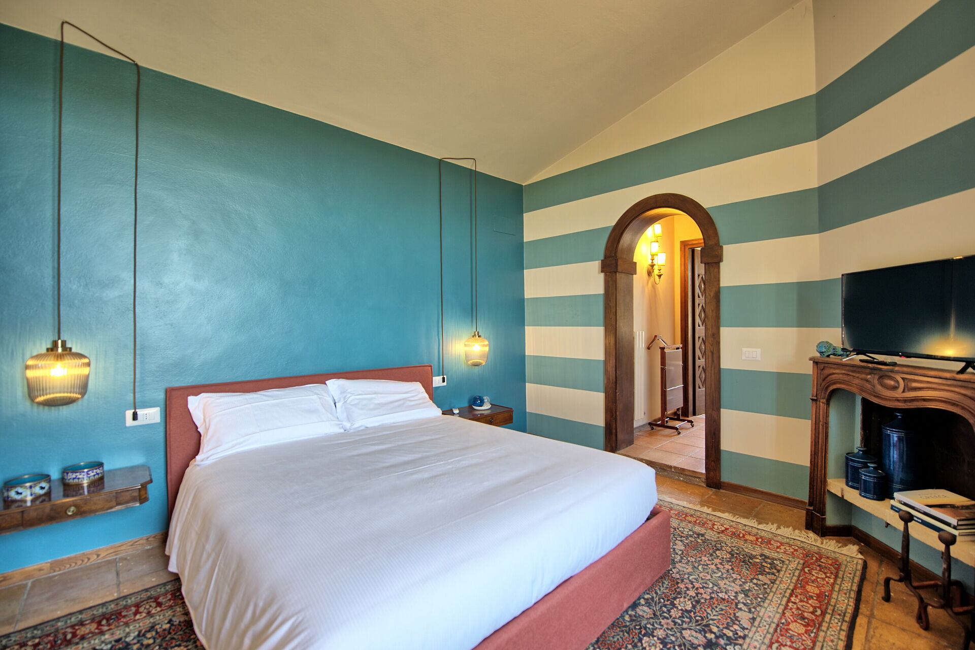 Secondo piano: suite con camera matrimoniale (aria condizionata) e stanza di passaggio (aria condizionata) con letto singolo, bagno privato con doccia e accesso a torretta con letto alla francese ad uso singolo, camera matrimoniale (aria condizionata) con bagno privato con doccia.