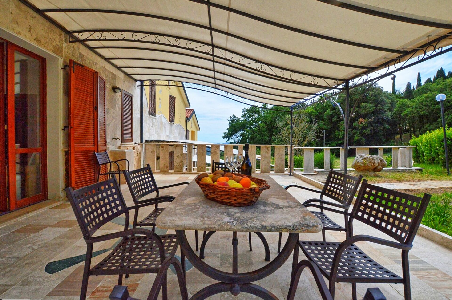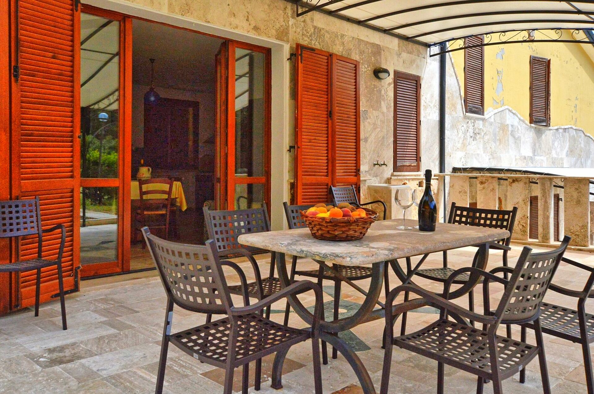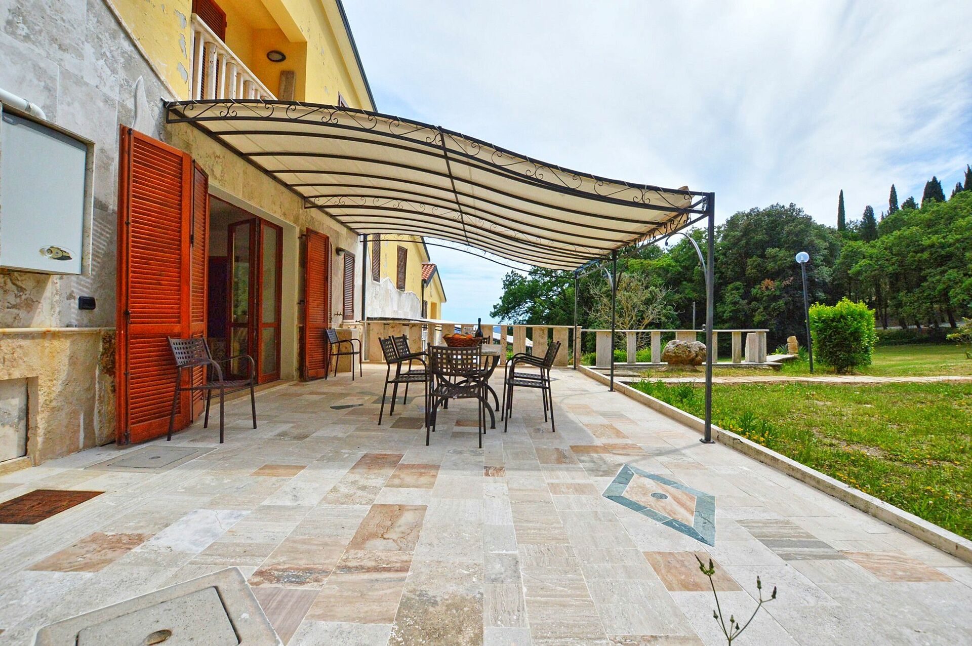 Ampio spazio esterno privato con tavolo, sedie e sdraie.