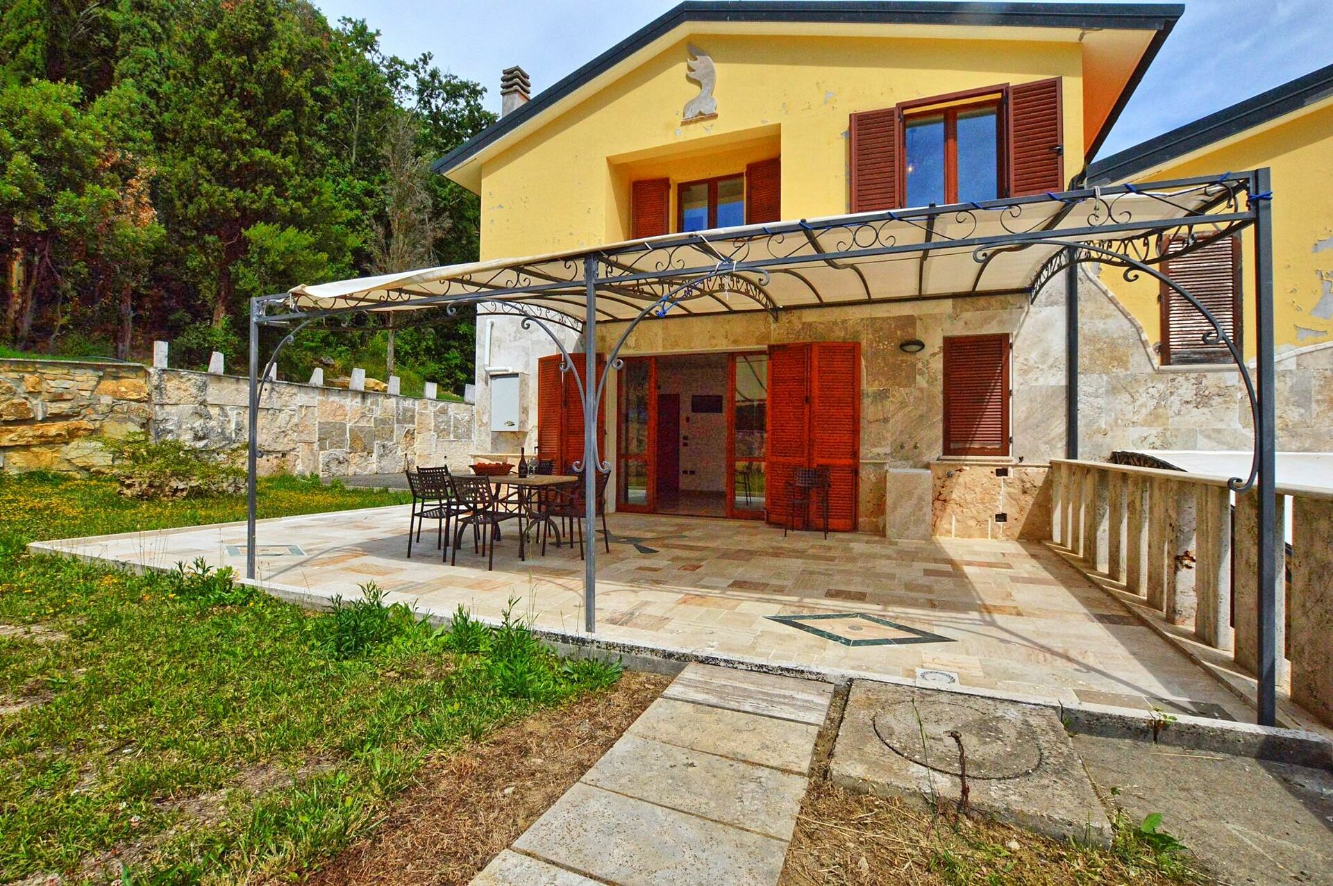 Piano terreno: grande soggiorno con zona pranzo e divano letto matrimoniale che si prolunga su un’ampia terrazza in parte ombreggiata, cucinotto aperto (forno, freezer, lavastoviglie), bagno con doccia.