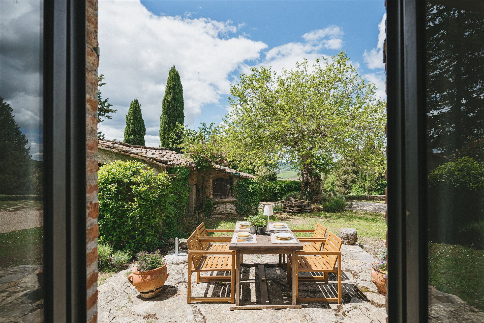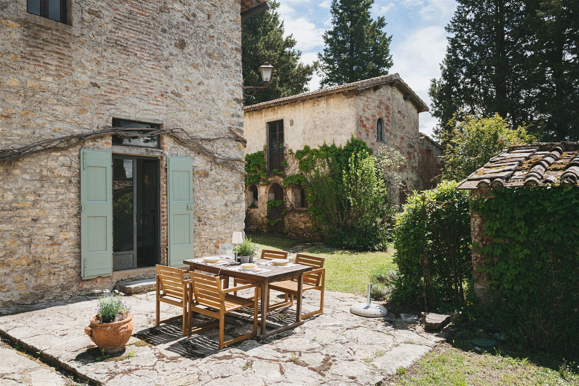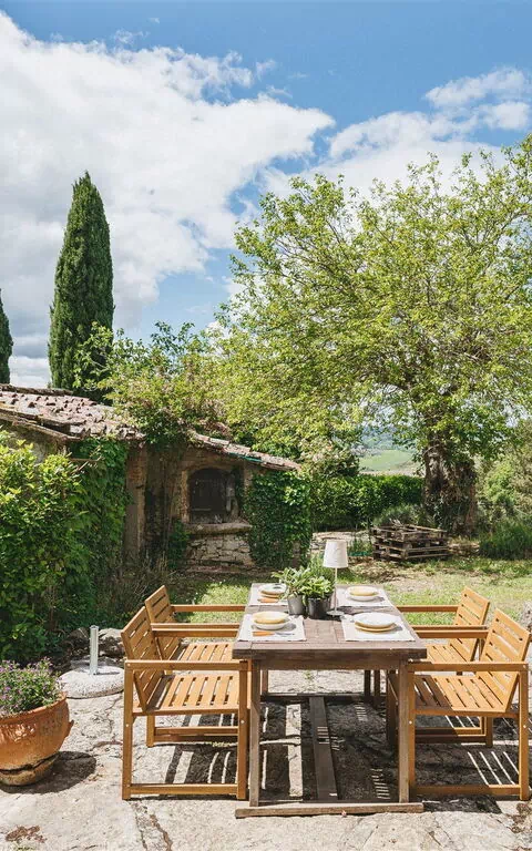 Spazio esterno privato attrezzato con tavolo e sedie e barbecue.