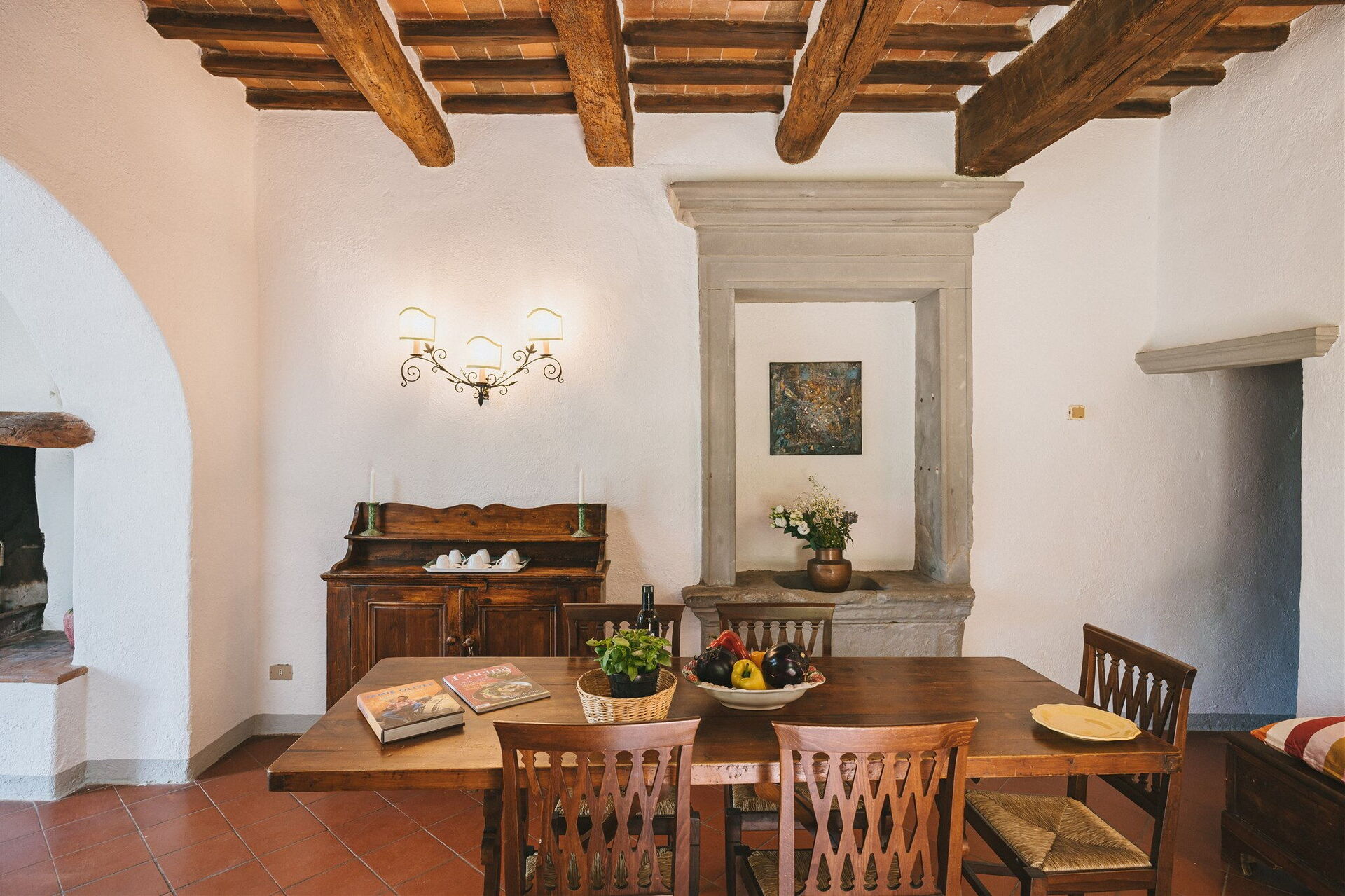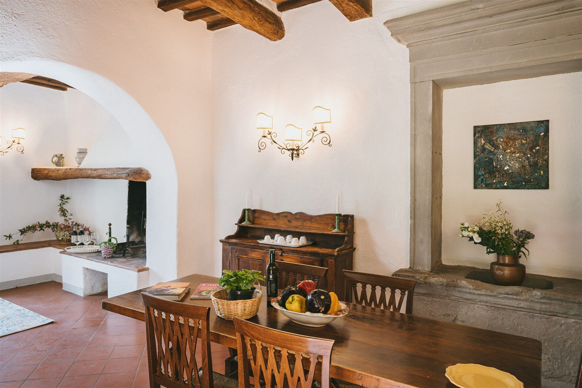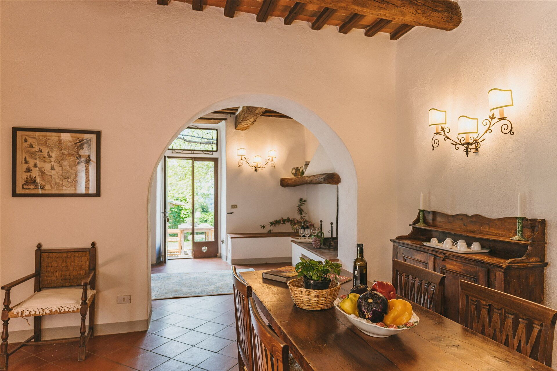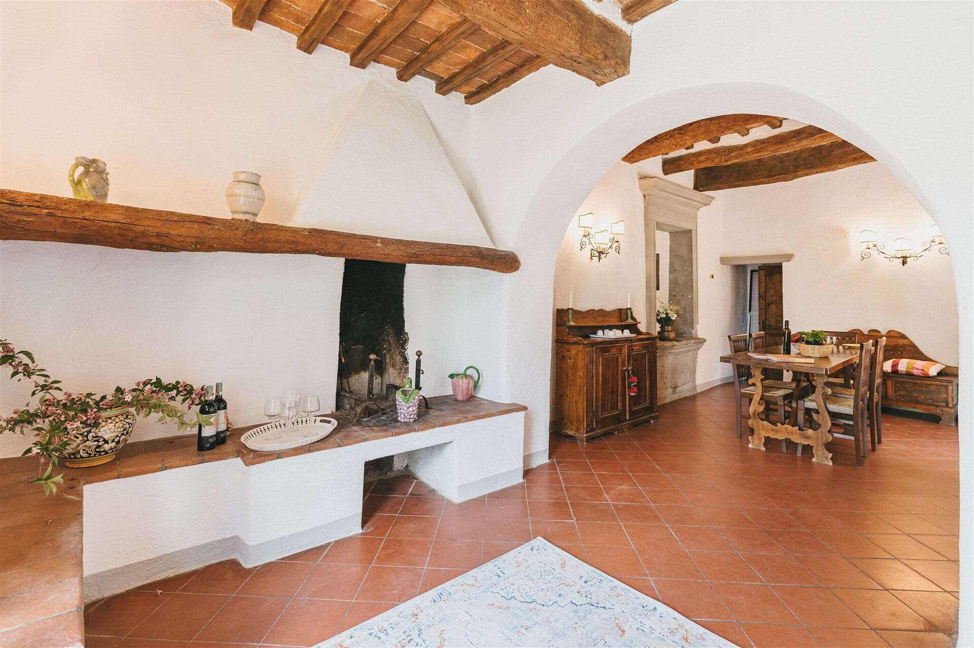 Piano terreno: cucina (piano cottura, forno, freezer, frigorifero, lavastoviglie, microonde, moka) con camino, sala pranzo, wc.