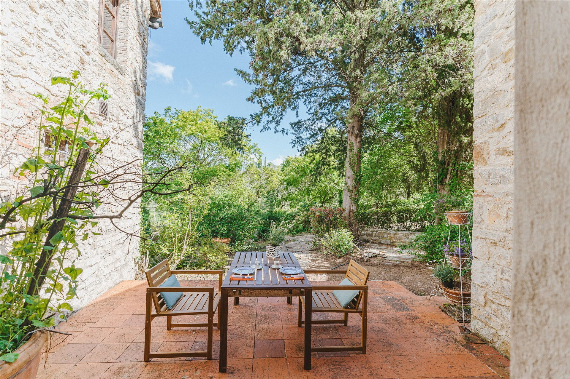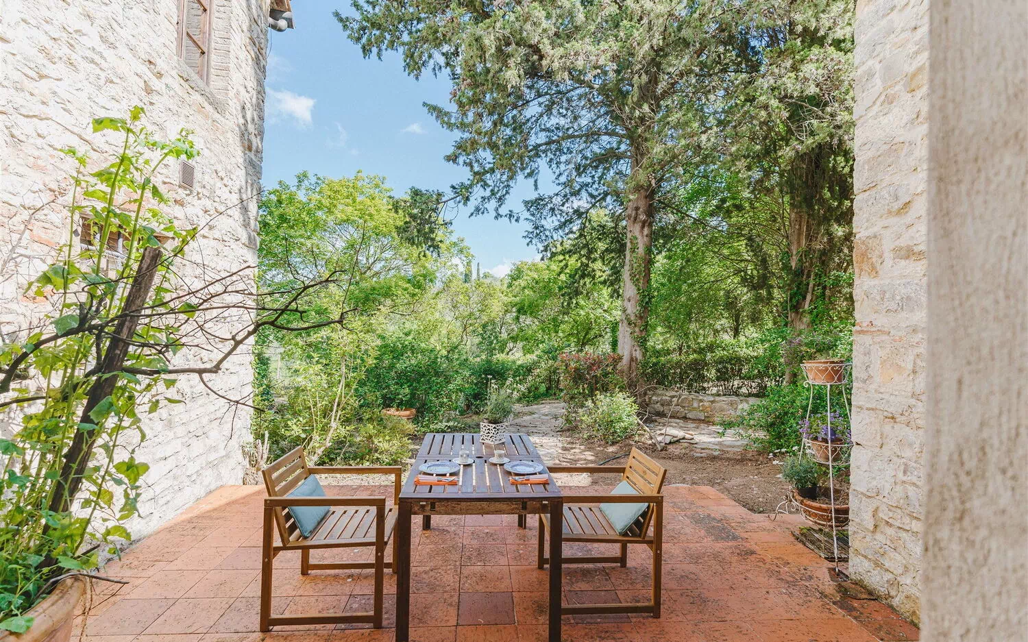 Spazio esterno privato attrezzato con tavolo e sedie e barbecue.