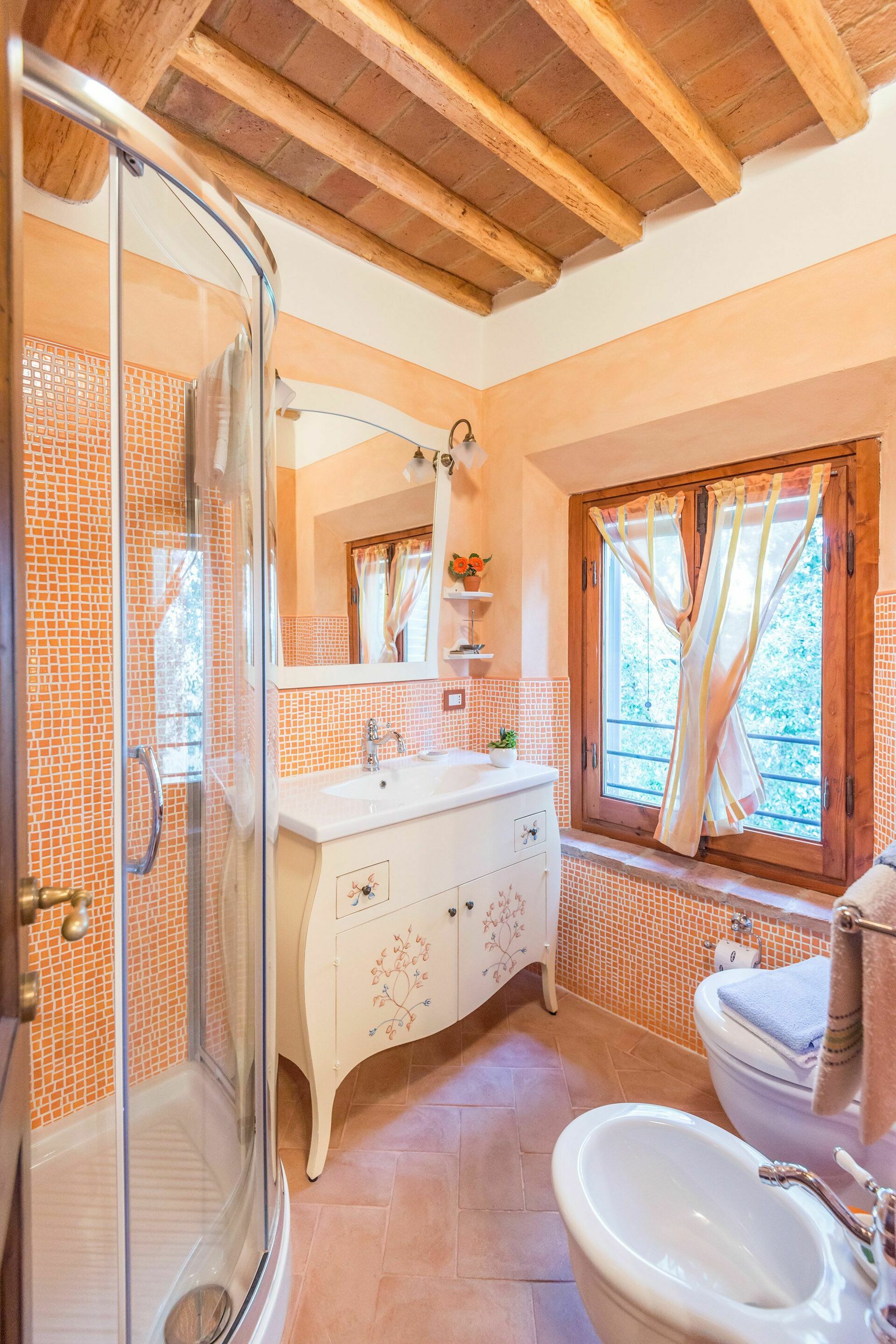 1 gradino sopra: camera con due letti singoli e bagno privato con doccia, camera matrimoniale con bagno privato con doccia e lavatrice.