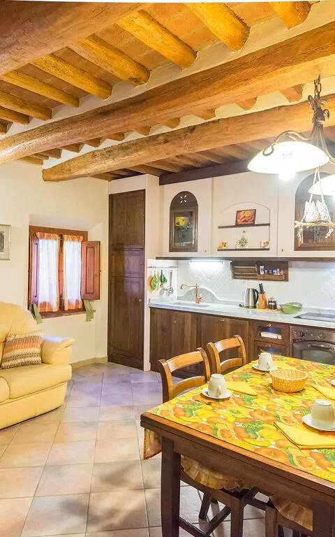 Piano terreno: Soggiorno con zona pranzo, camino e angolo cottura (freezer, forno, lavastoviglie), camera matrimoniale (TV Sat), bagno con doccia, camera matrimoniale.