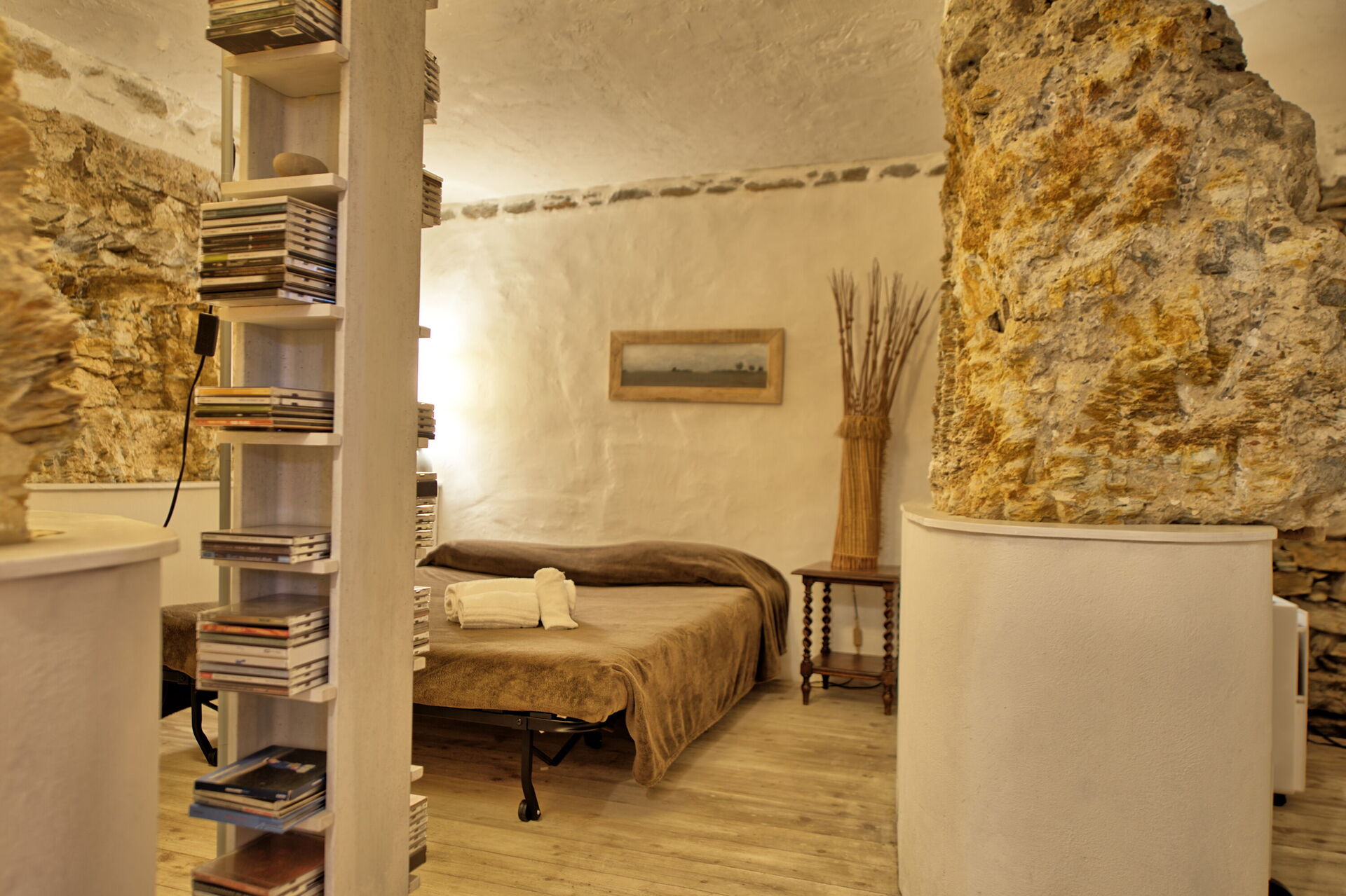 Piano seminterrato: cucina (design industriale) ampia ed attrezzata (forno, freezer, lavastoviglie, forno a microonde, tostapane) con camino e zona pranzo (TV-sat.), camera matrimoniale (climatizzatore – aria calda e fredda) con bagno con doccia, stanza (senza finestra) ricavata nella roccia con divano letto matrimoniale (adatto a bambini, non a persone adulte).