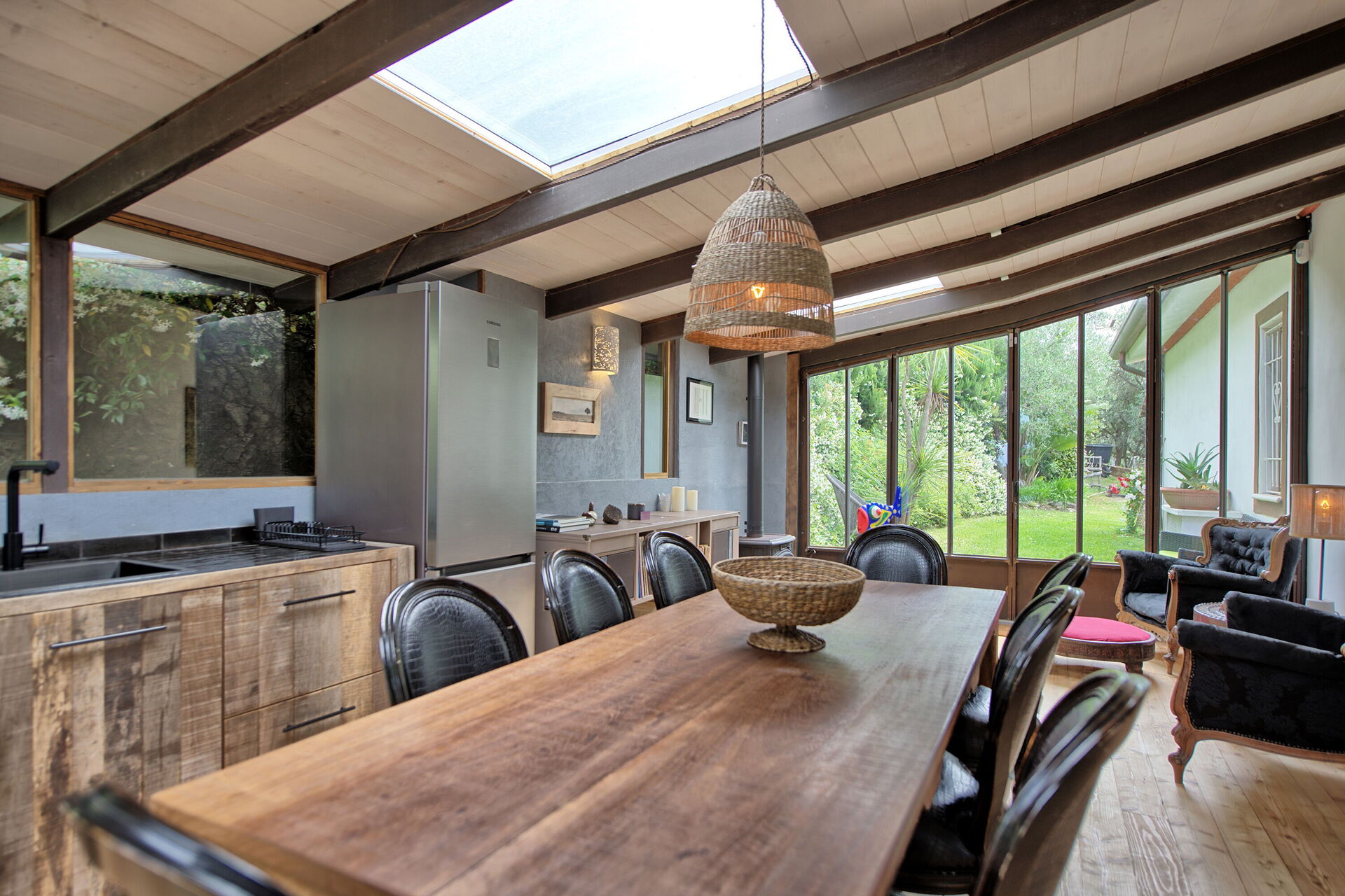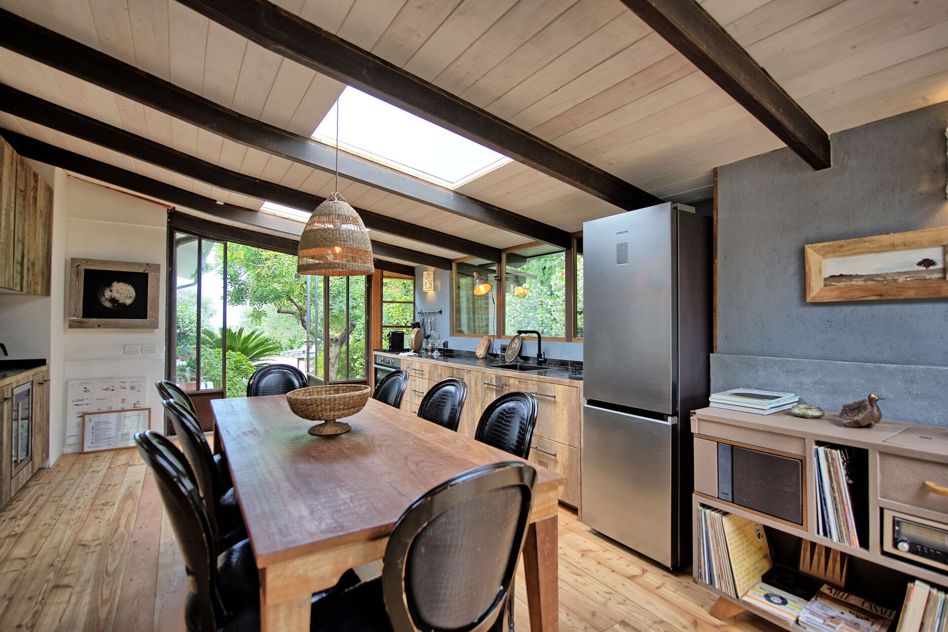 - spazio esterno coperto e attrezzato con cucina (forno, fuochi a induzione, frigorifero, lavastoviglie, cantinetta frigo per vini) con tavolo e sedie