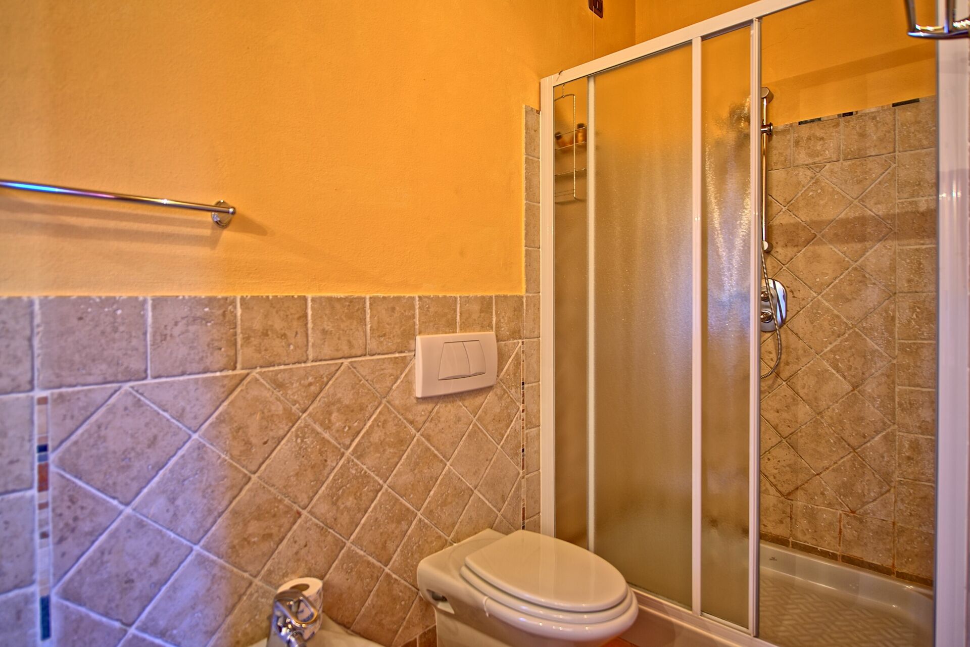 4 gradini più in alto: camera matrimoniale (aria condizionata) con bagno privato con doccia.