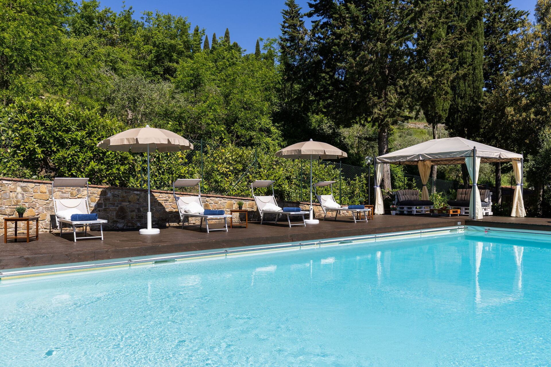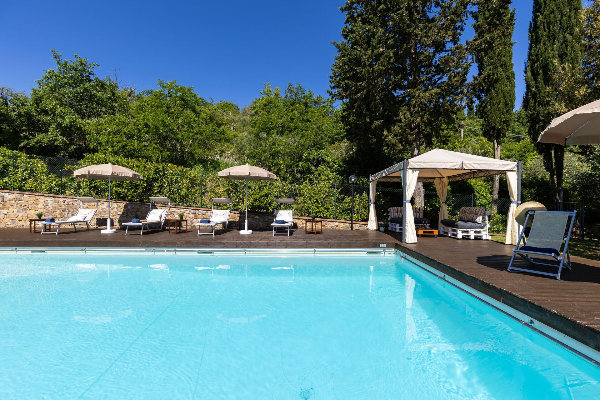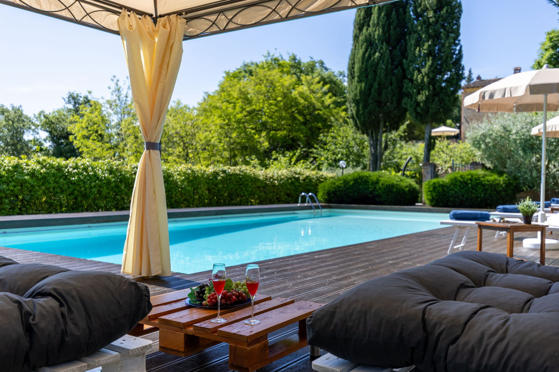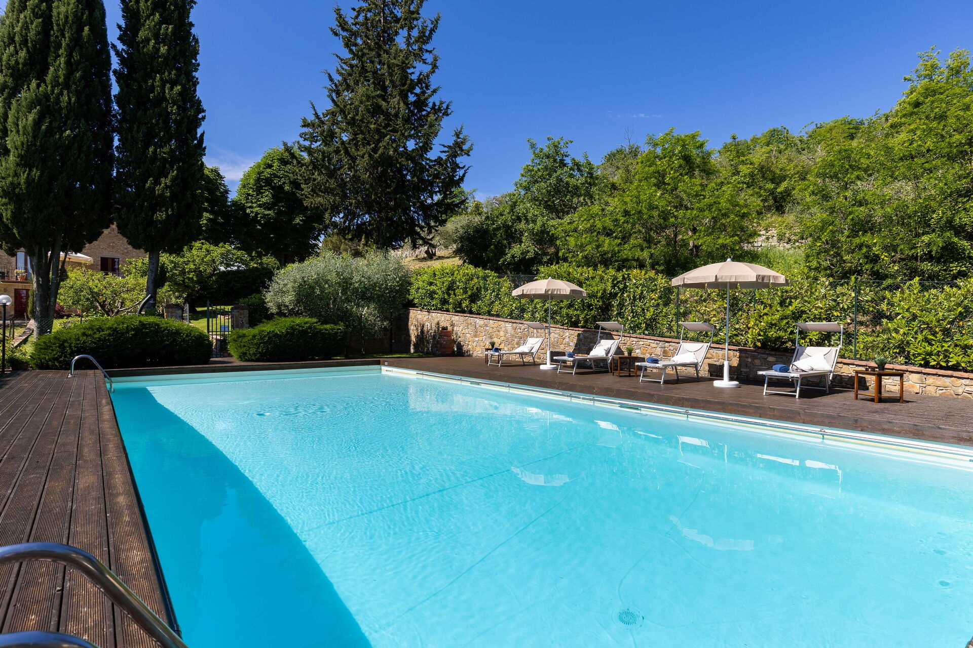 Gli spazi esterni sono sicuramente il pezzo forte della casa: una terrazza attrezzata con tavoli e sedie permette agli ospiti di mangiare all'aperto con una bella vista sul paesaggio circostante; il ben curato giardino che ospita una piscina completamente recintata e un solarium attrezzato con lettini prendisole è il luogo ideale per rilassarsi e per trovare ristoro nelle soleggiate giornate estive toscane.