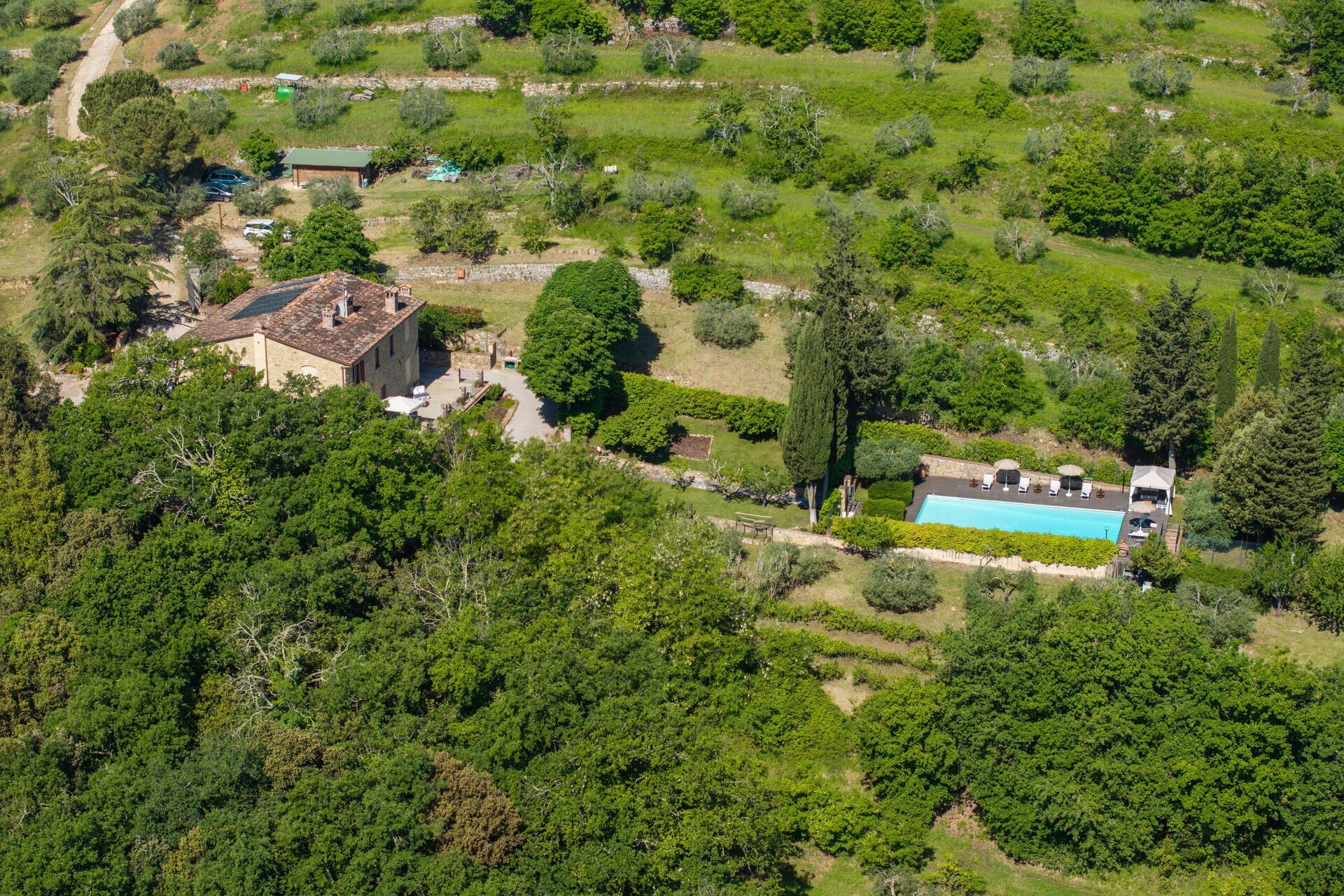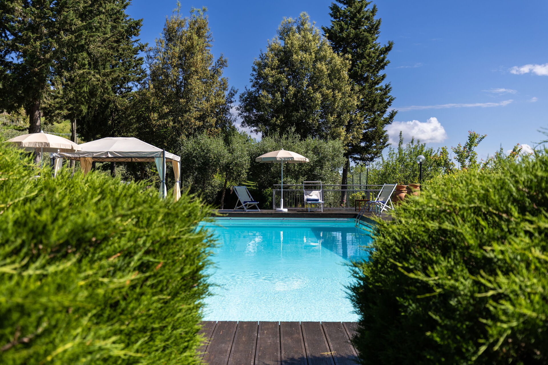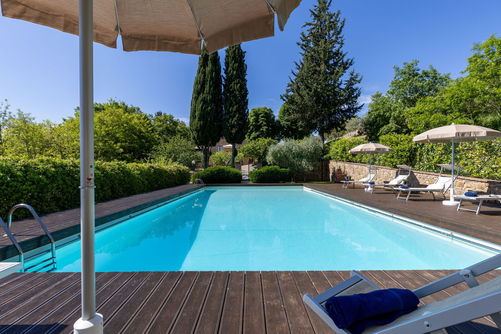 Gli spazi esterni sono sicuramente il pezzo forte della casa: una terrazza attrezzata con tavoli e sedie permette agli ospiti di mangiare all'aperto con una bella vista sul paesaggio circostante; il ben curato giardino che ospita una piscina completamente recintata e un solarium attrezzato con lettini prendisole è il luogo ideale per rilassarsi e per trovare ristoro nelle soleggiate giornate estive toscane.