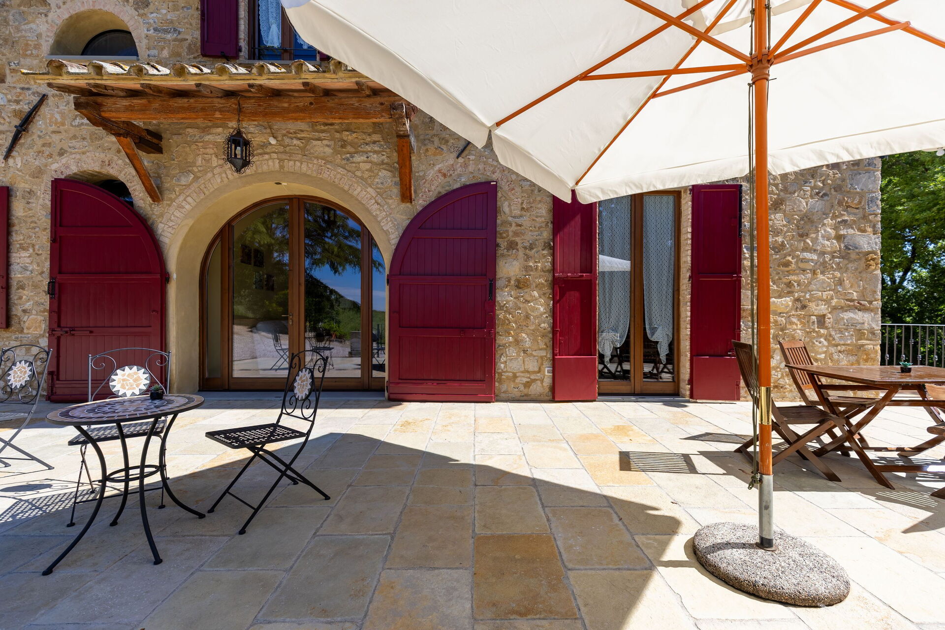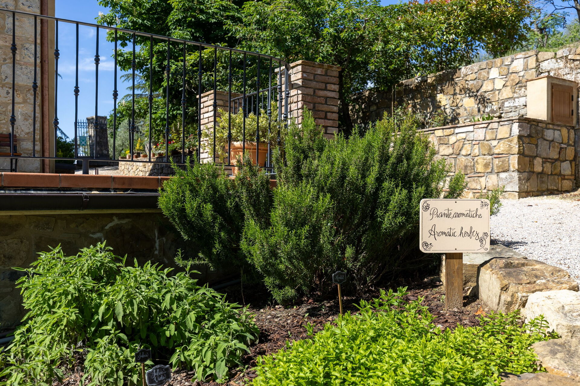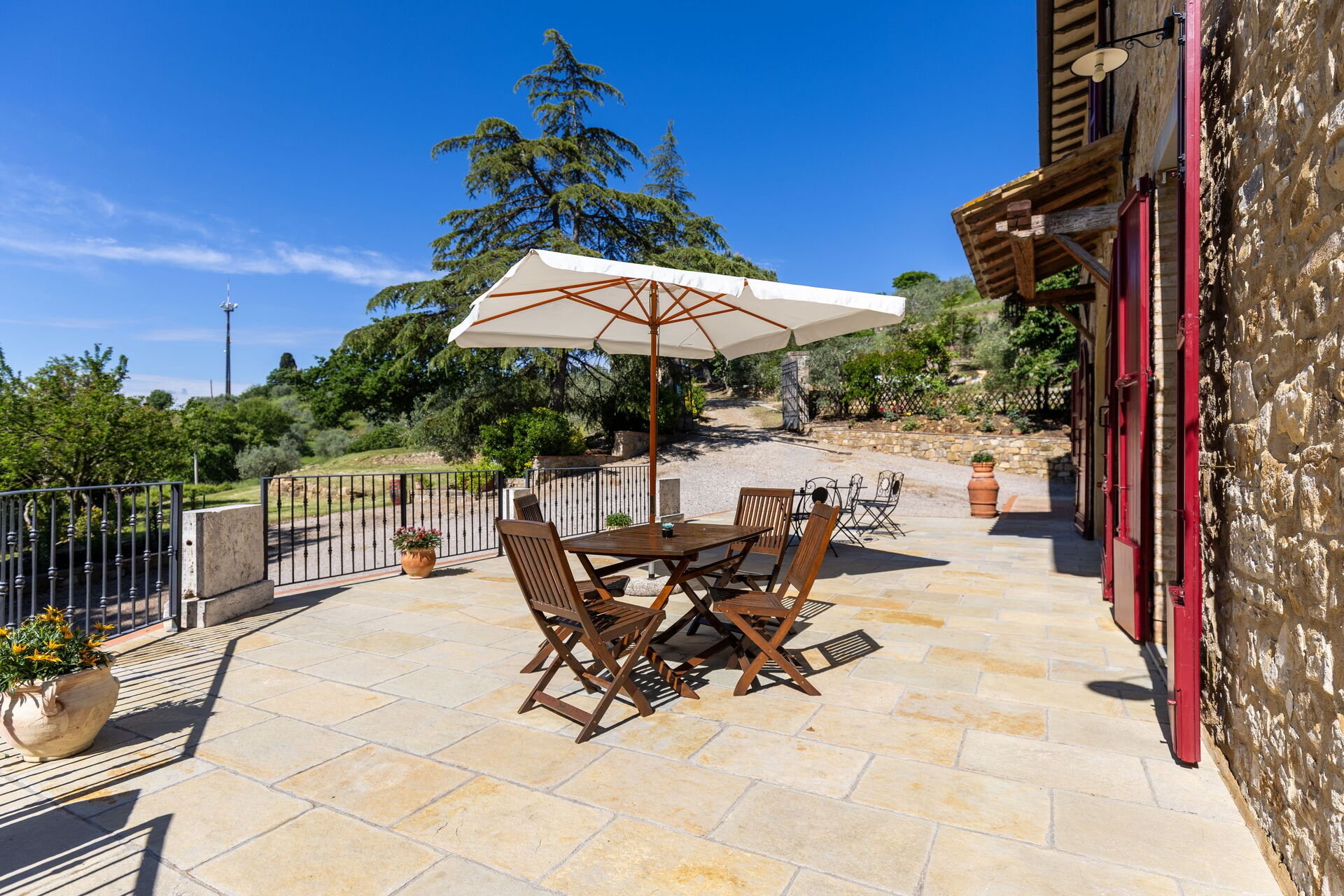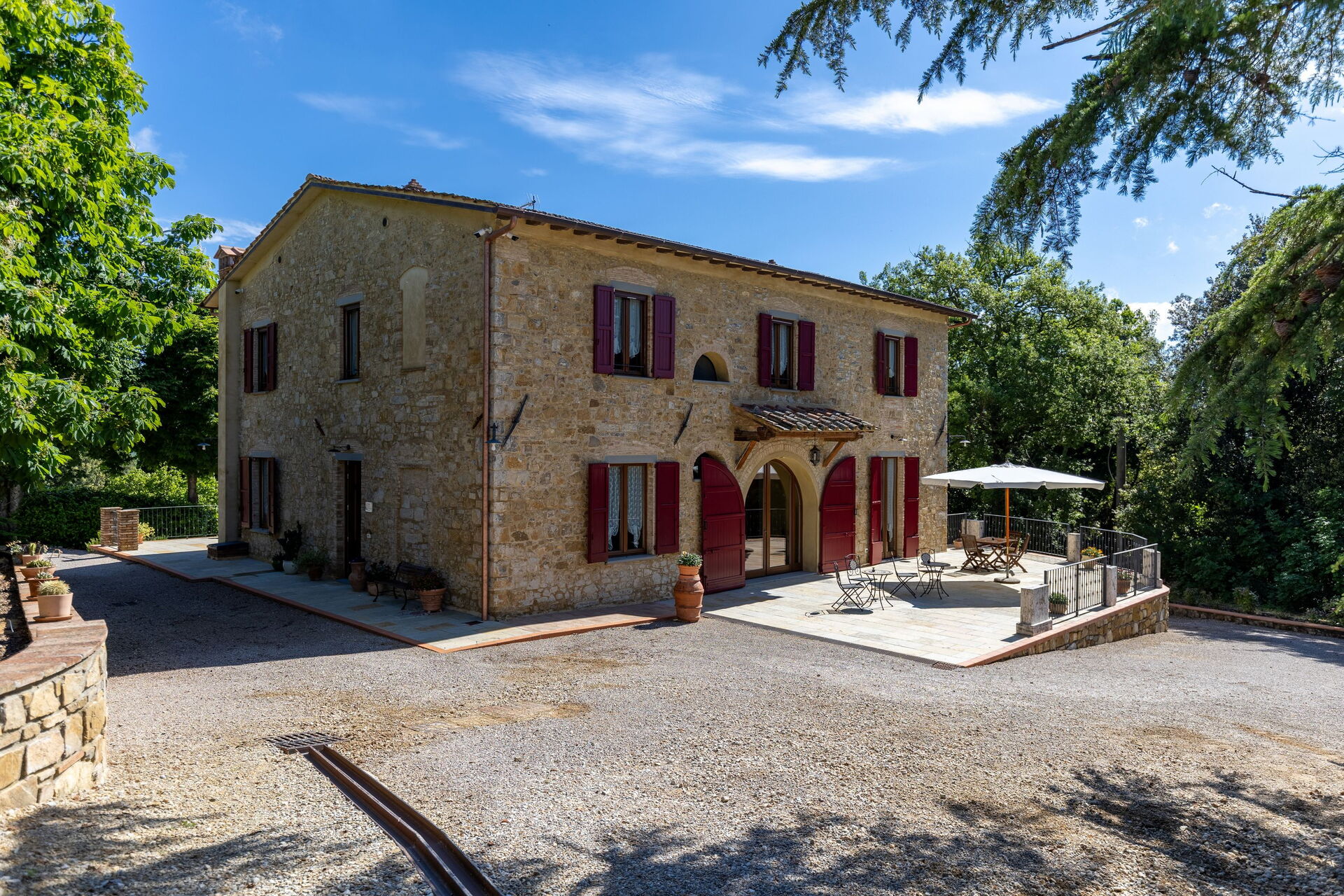 Gli spazi esterni sono sicuramente il pezzo forte della casa: una terrazza attrezzata con tavoli e sedie permette agli ospiti di mangiare all'aperto con una bella vista sul paesaggio circostante; il ben curato giardino che ospita una piscina completamente recintata e un solarium attrezzato con lettini prendisole è il luogo ideale per rilassarsi e per trovare ristoro nelle soleggiate giornate estive toscane.