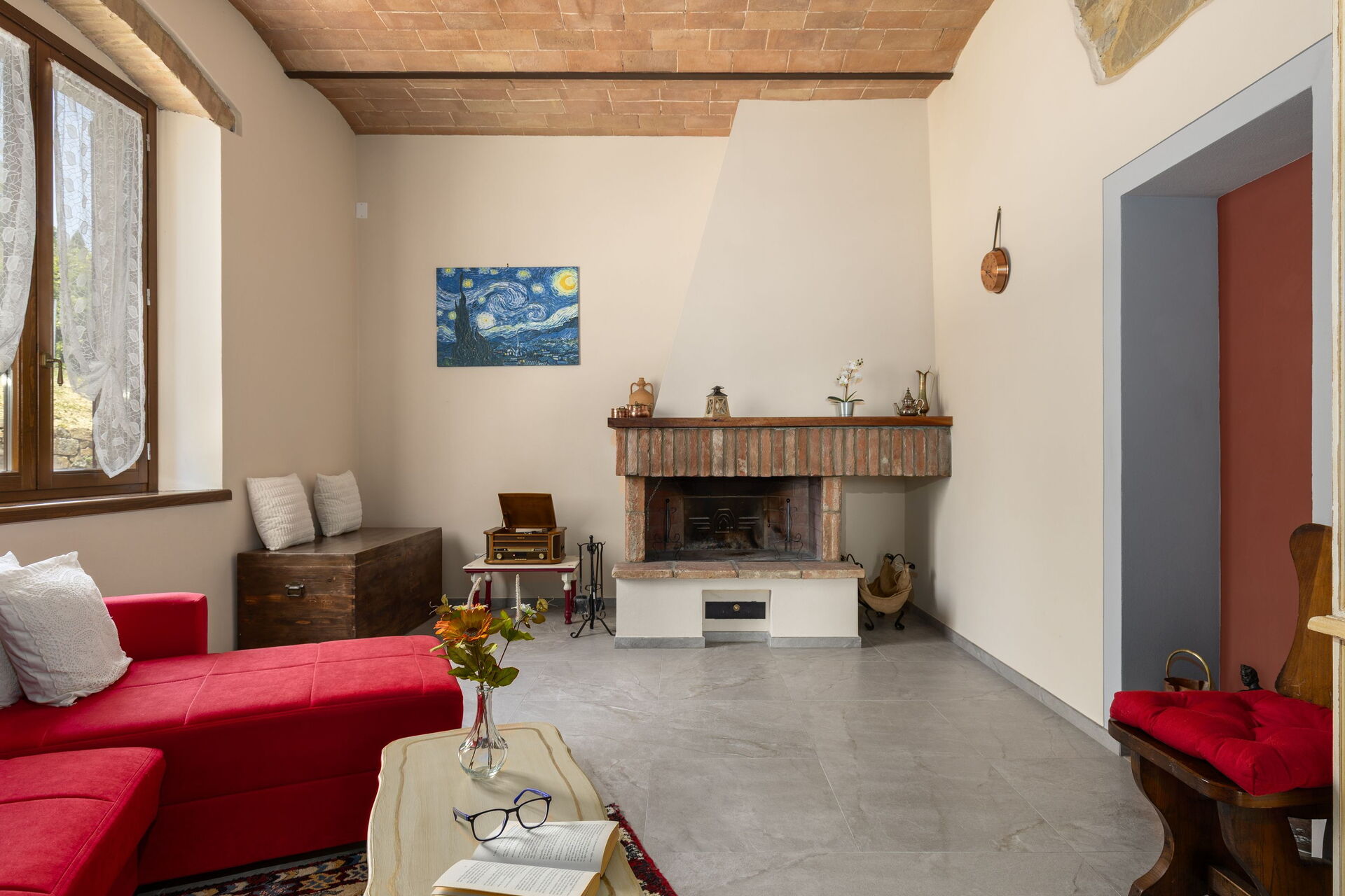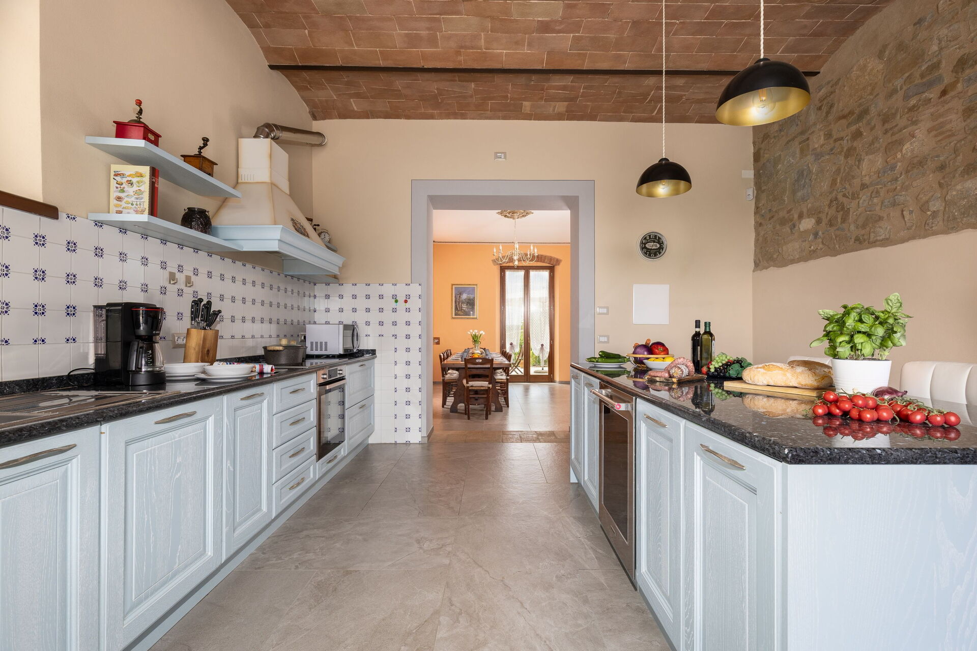 Piano terreno: ingresso su stanza con pianoforte e tavolo, luminoso soggiorno (TV), sala pranzo, cucina (forno, freezer, frigorifero, lavastoviglie, microonde, macchina da caffè espresso, macchina da caffè americano, tostapane) e con accesso alla terrazza; bagno con doccia, sala lettura con divano.