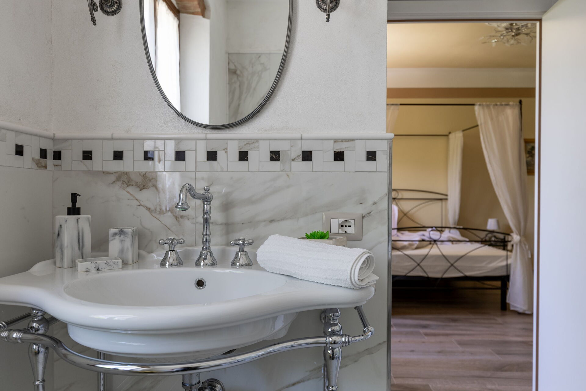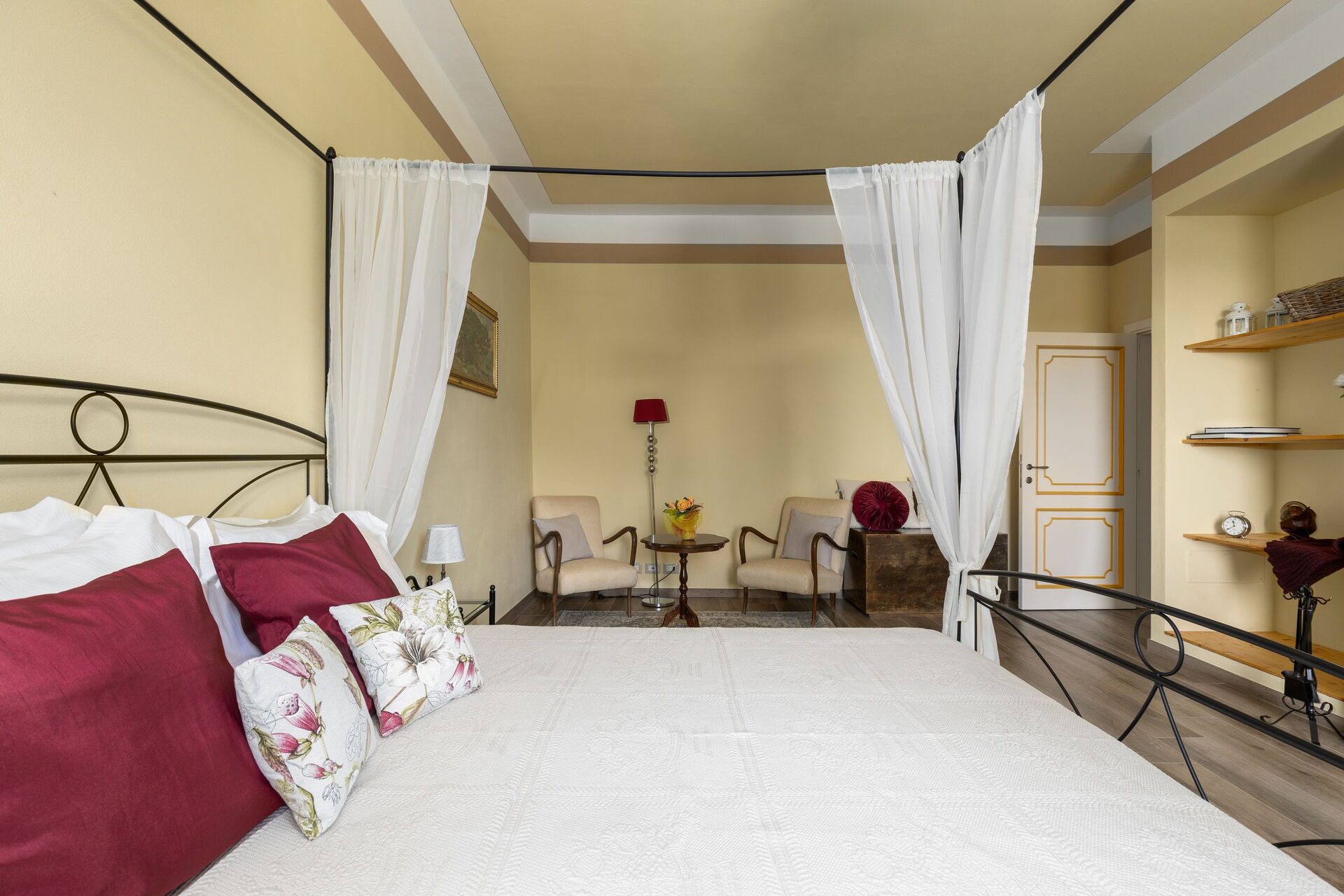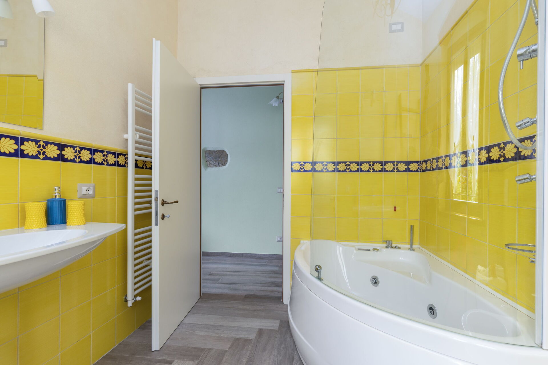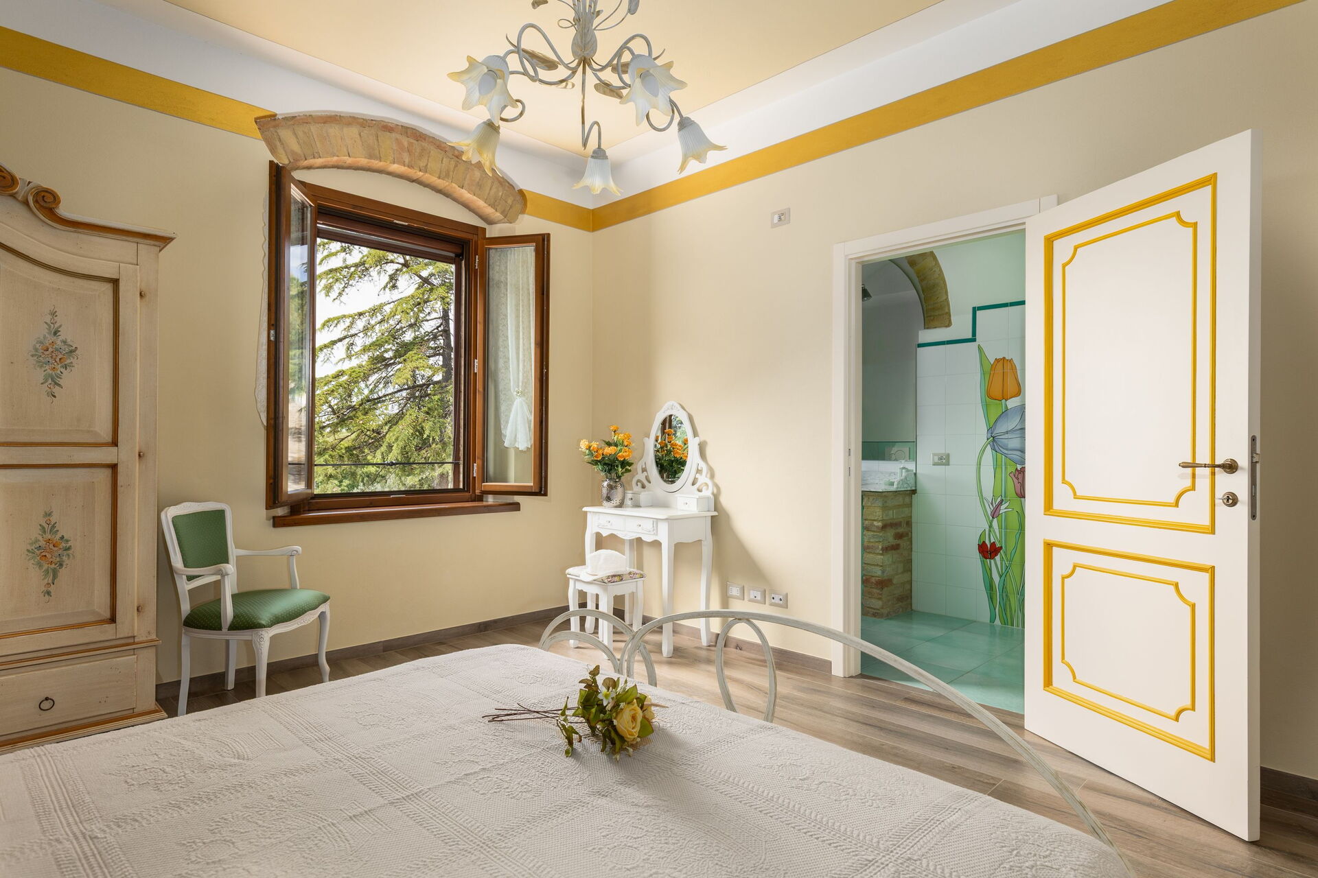 Primo piano: 2 camere matrimoniali con bagno privato con doccia, camera matrimoniale con bagno privato con doccia multifunzione con cromoterapia e bagno turco, camera matrimoniale (separabile su richiesta in 2 letti singoli) con bagno privato con vasca con idromassaggio, camera matrimoniale con bagno privato con vasca.