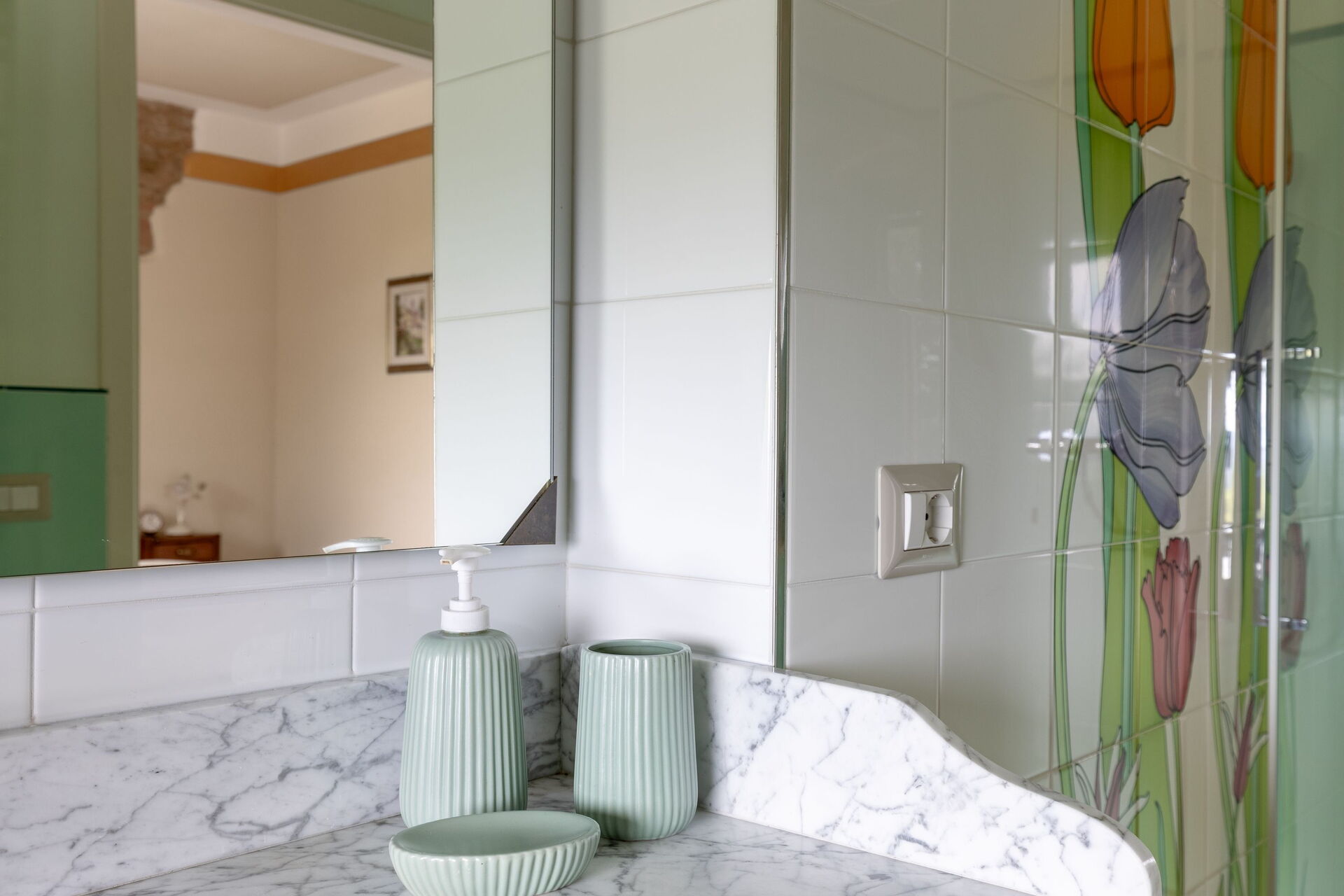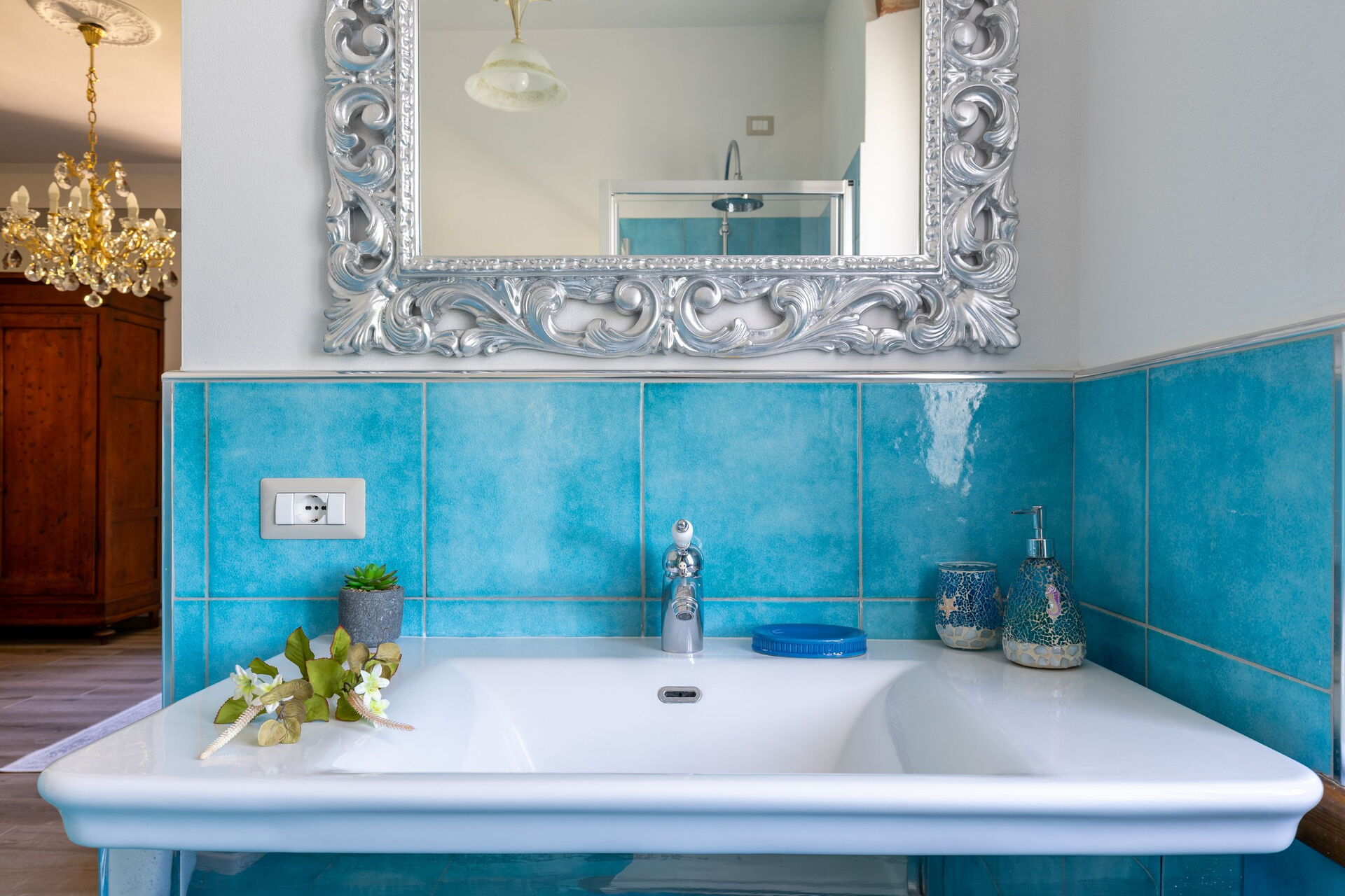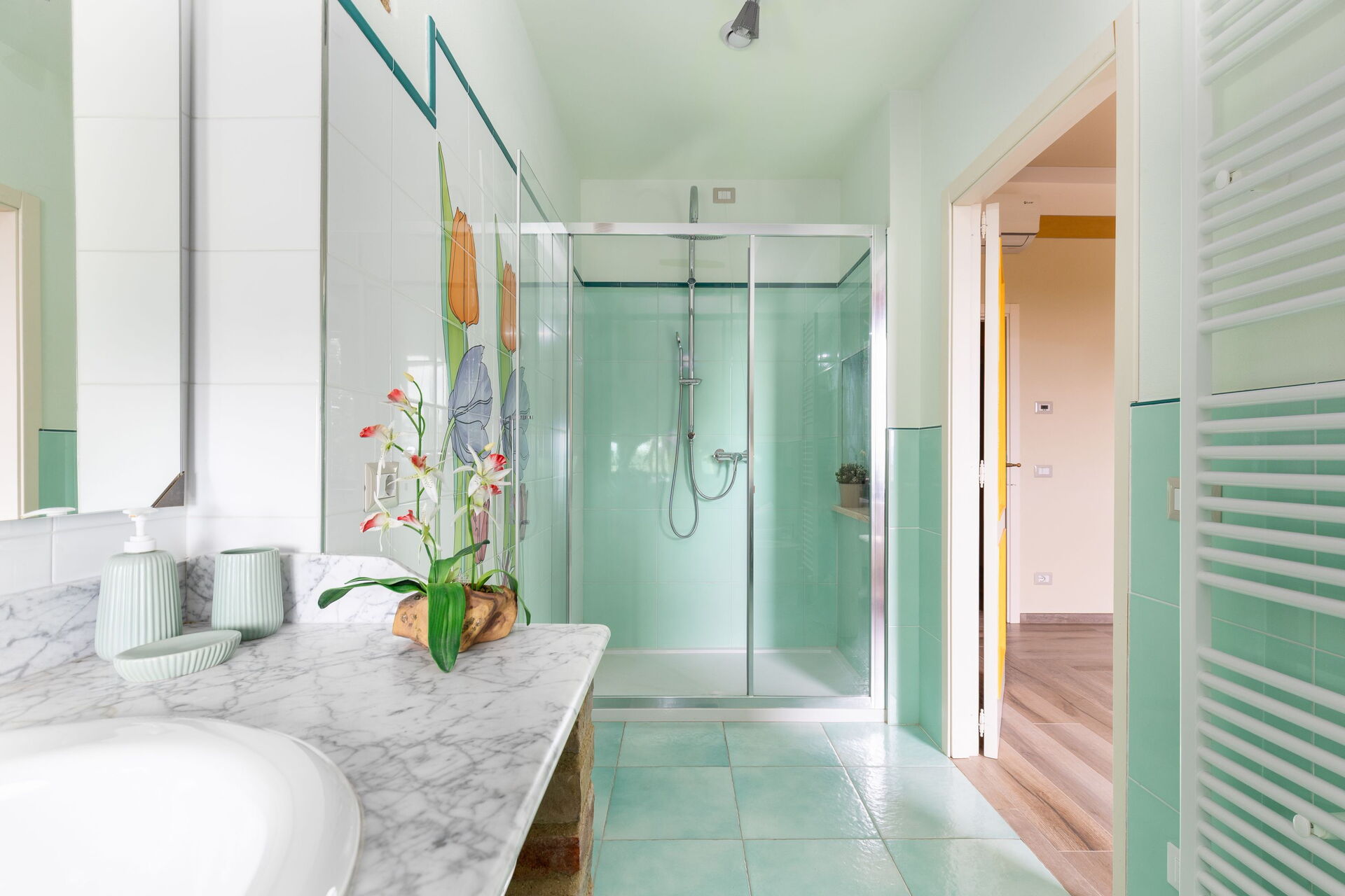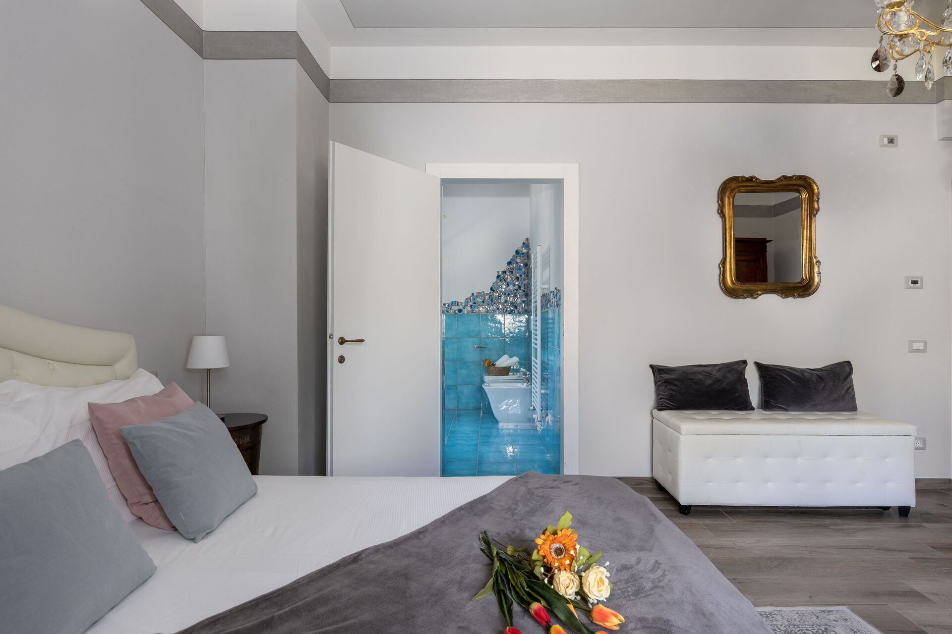 Primo piano: 2 camere matrimoniali con bagno privato con doccia, camera matrimoniale con bagno privato con doccia multifunzione con cromoterapia e bagno turco, camera matrimoniale (separabile su richiesta in 2 letti singoli) con bagno privato con vasca con idromassaggio, camera matrimoniale con bagno privato con vasca.