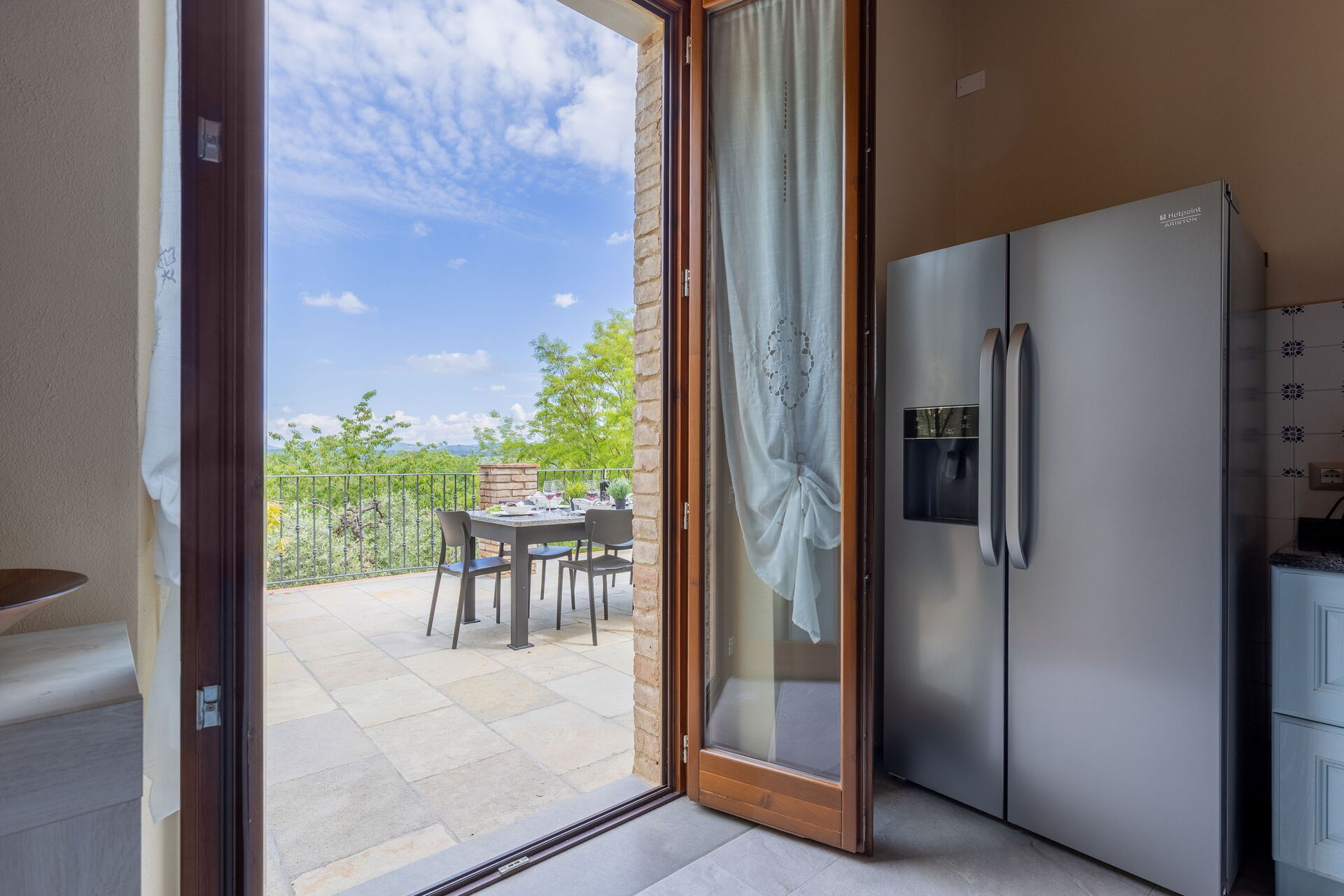 - terrazza attrezzata con tavolo e sedie per mangiare all’aperto