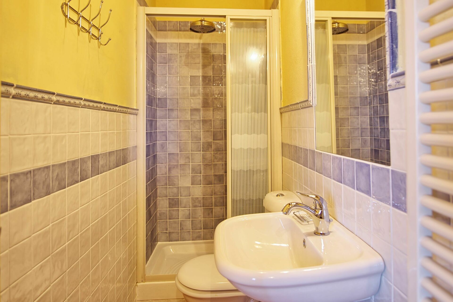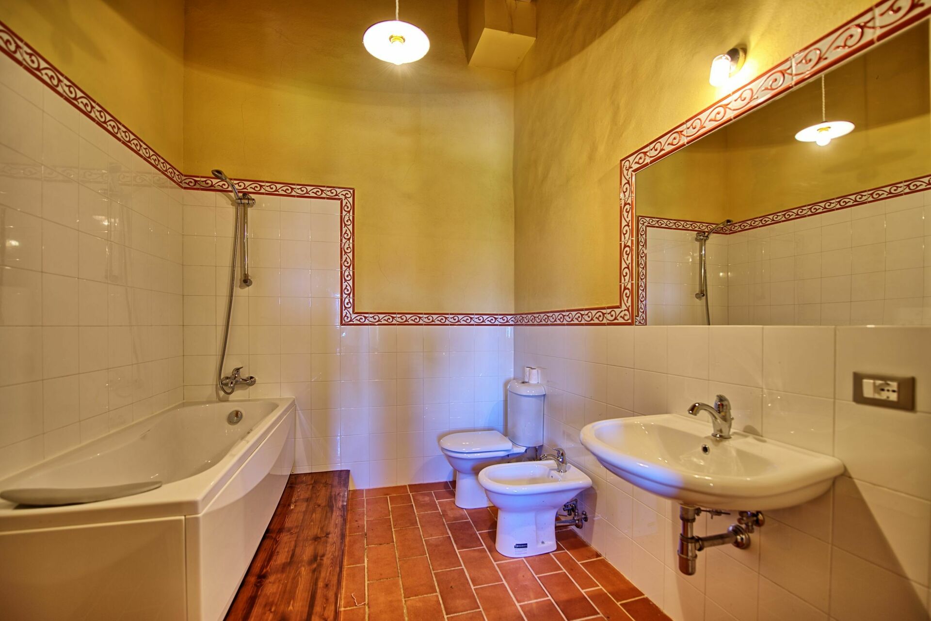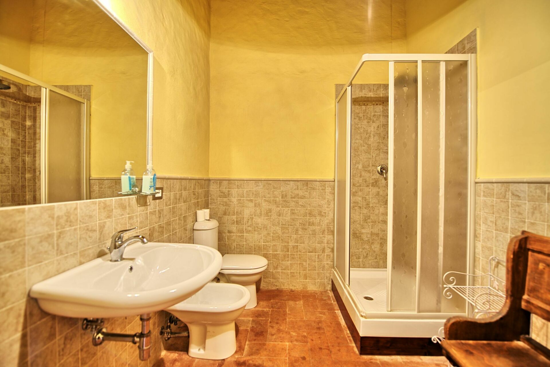 Primo piano: 2 camere matrimoniali entrambe con bagno privato con doccia, 2 camere matrimoniali, camera di passaggio con 2 letti singoli, 2 bagni con doccia, grande camera matrimoniale con terzo letto singolo, ampia camera matrimoniale con terzo letto singolo e con bagno privato con vasca.