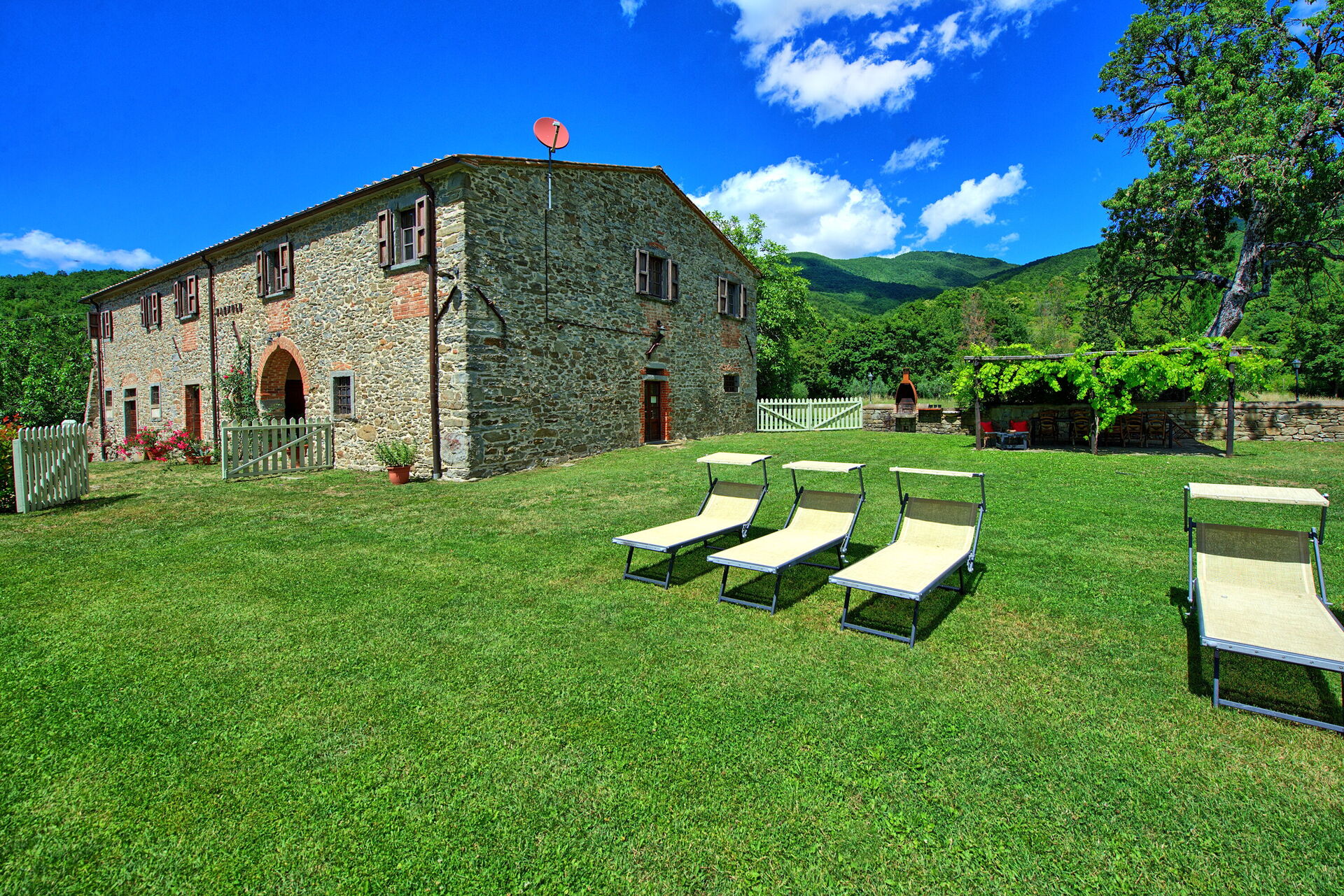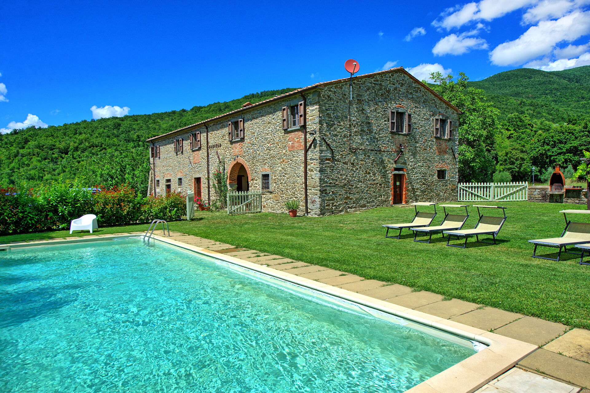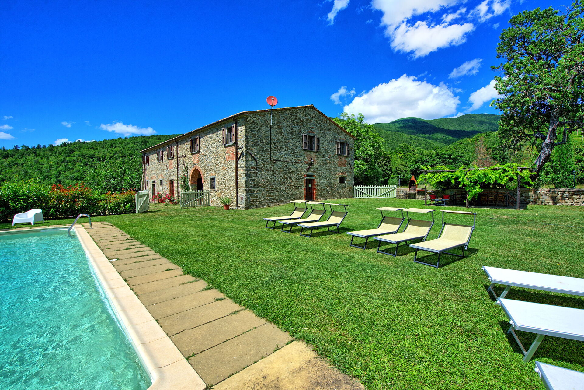 All'esterno, questa bellissima casa per vacanze è avvolta dalla natura e dalle colline. Un ampio giardino curato e ricco di piante e alberi circonda la villa, offrendo totale privacy in un ambiente tranquillo e rilassante. La zona piscina privata è situata in posizione panoramica e dispone di lettini prendisole, poltroncine e ombrelloni: un luogo perfetto per trascorrere lunghe ore a rilassarsi e rinfrescarsi durante le calde giornate estive in compagnia della propria famiglia o di un gruppo di amici. A disposizione degli ospiti vi è una pergola attrezzata con tavolo e sedie per poter organizzare grigliate e godersi pranzi e cene all'aperto. La proprietà è interamente recintata e dispone di un ampio spazio esterno di circa 2000 m2. La posizione è molto tranquilla e permette agli ospiti di trascorrere una vacanza rilassante a contatto con la natura.