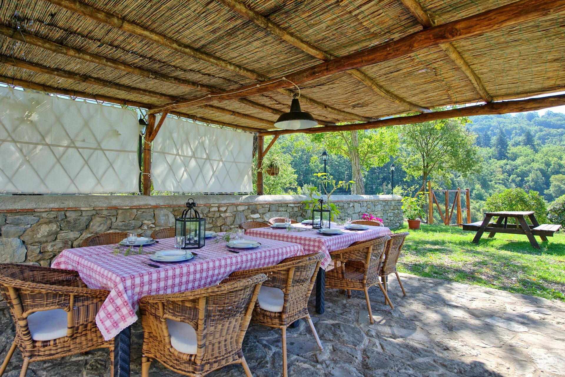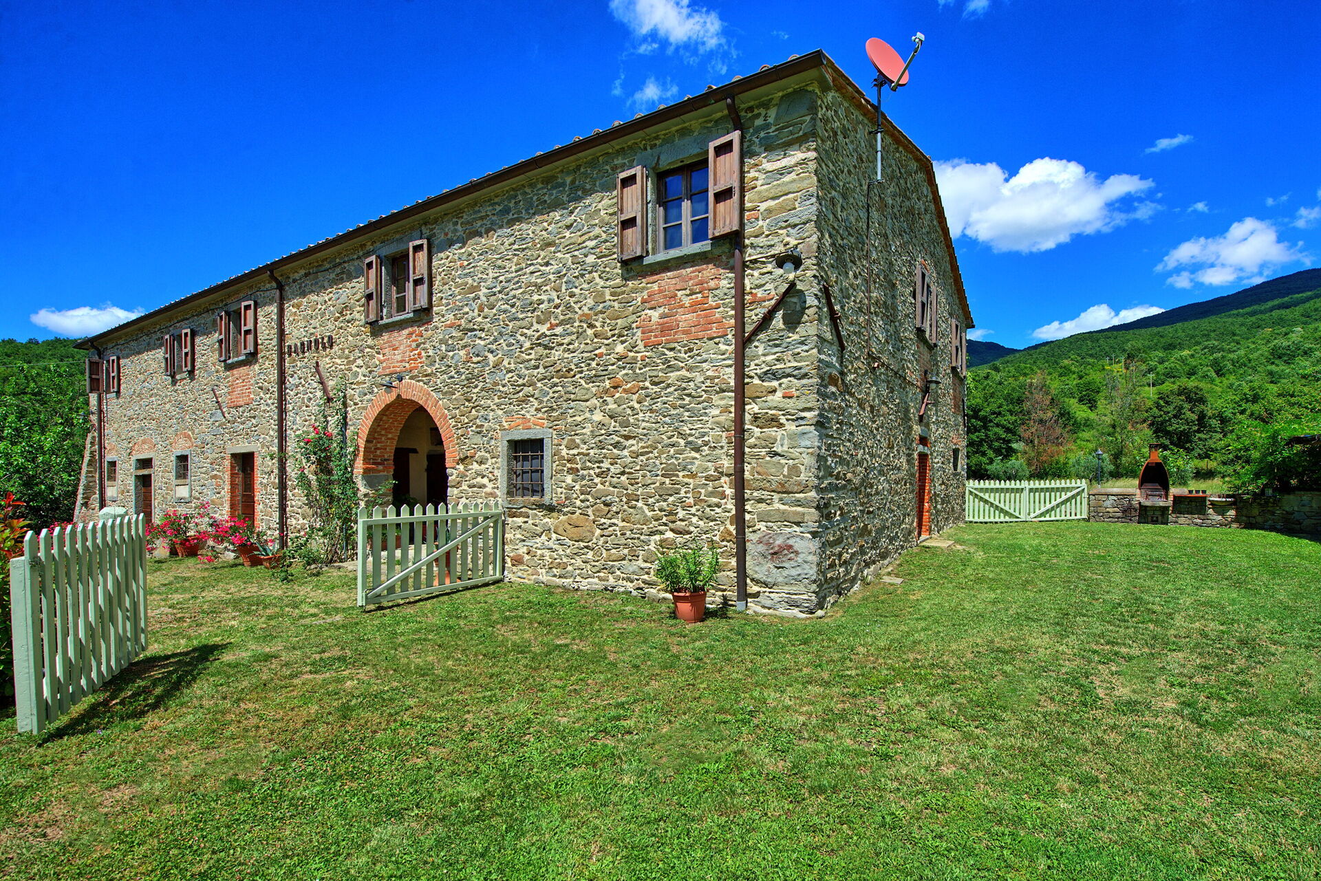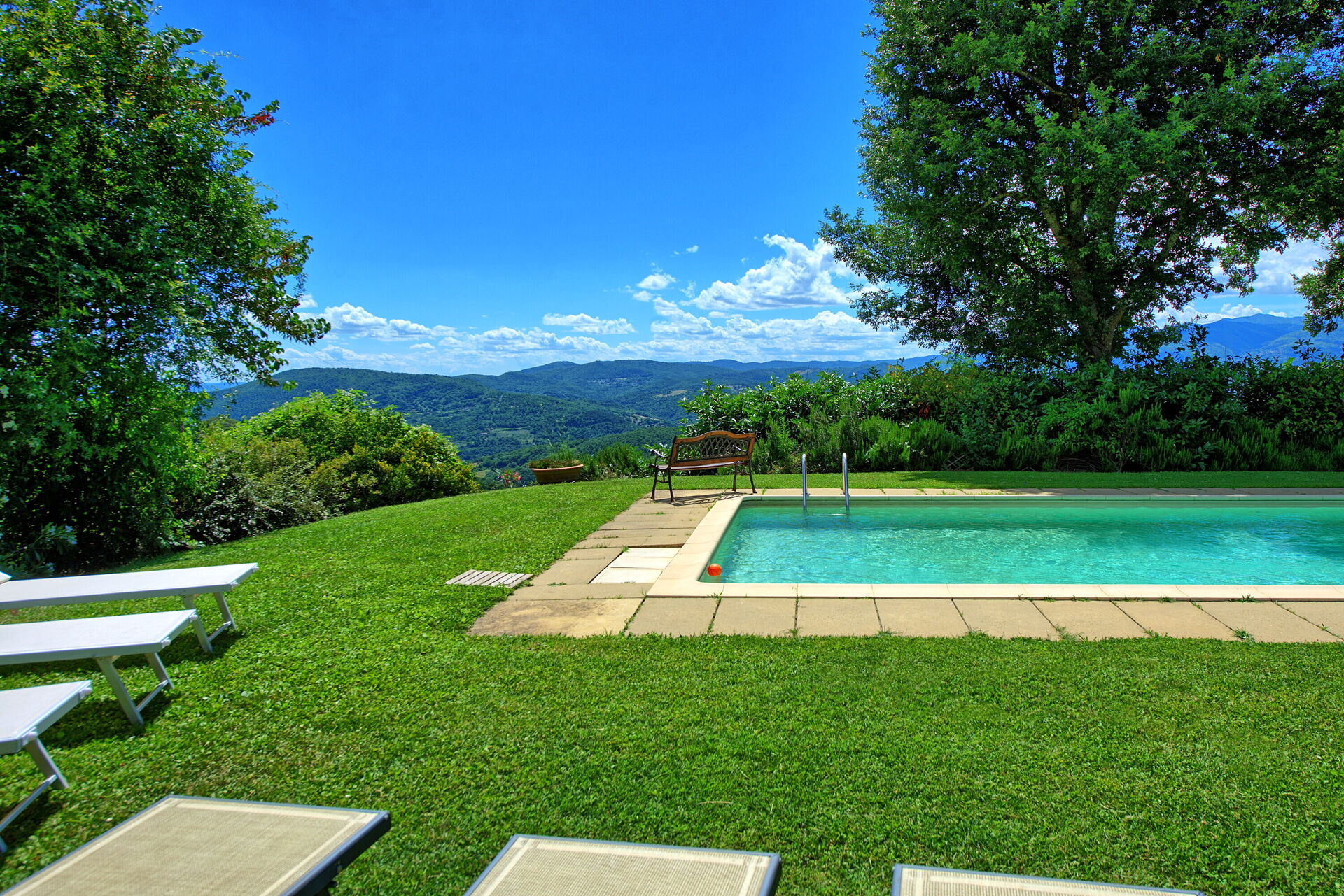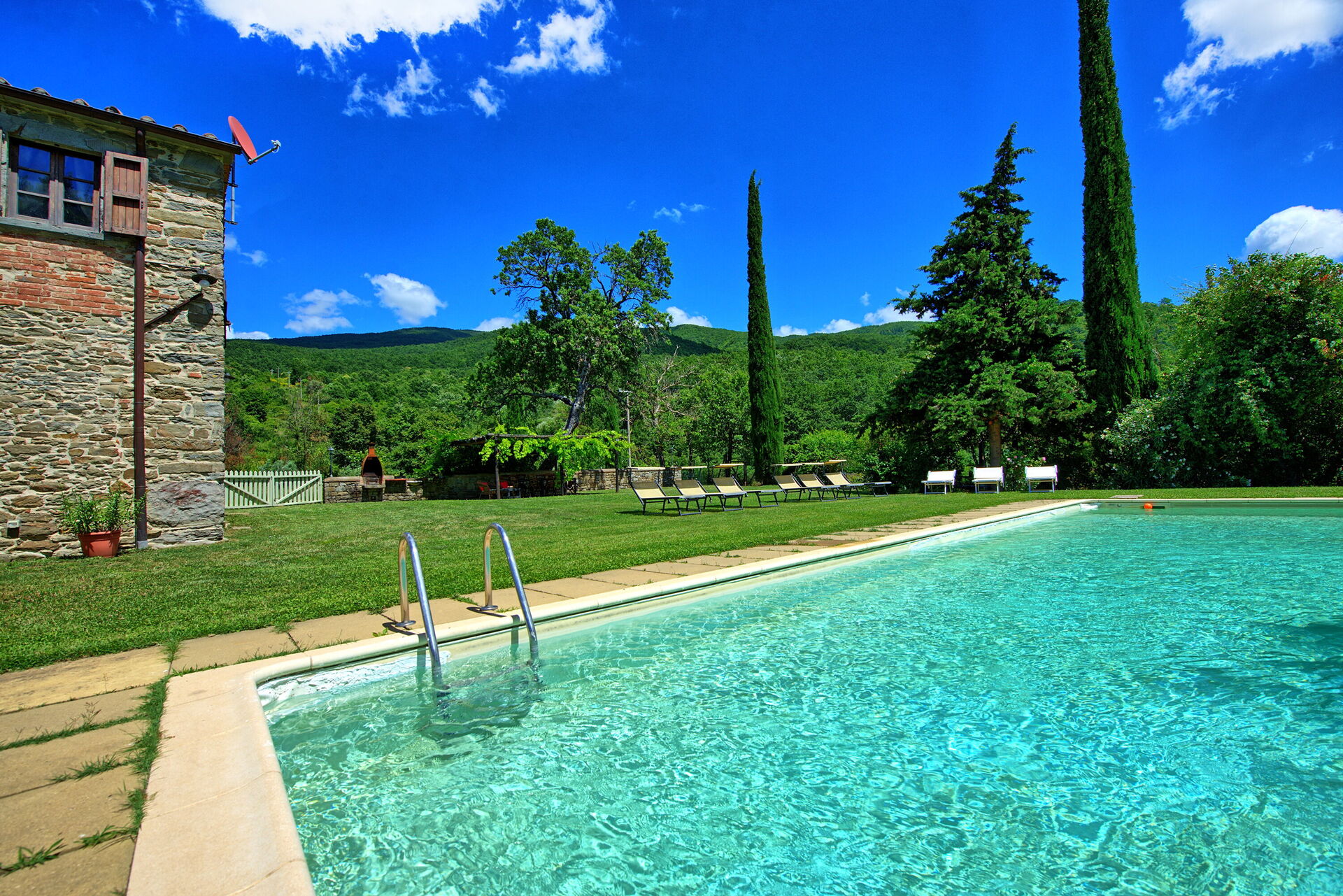 All'esterno, questa bellissima casa per vacanze è avvolta dalla natura e dalle colline. Un ampio giardino curato e ricco di piante e alberi circonda la villa, offrendo totale privacy in un ambiente tranquillo e rilassante. La zona piscina privata è situata in posizione panoramica e dispone di lettini prendisole, poltroncine e ombrelloni: un luogo perfetto per trascorrere lunghe ore a rilassarsi e rinfrescarsi durante le calde giornate estive in compagnia della propria famiglia o di un gruppo di amici. A disposizione degli ospiti vi è una pergola attrezzata con tavolo e sedie per poter organizzare grigliate e godersi pranzi e cene all'aperto. La proprietà è interamente recintata e dispone di un ampio spazio esterno di circa 2000 m2. La posizione è molto tranquilla e permette agli ospiti di trascorrere una vacanza rilassante a contatto con la natura.