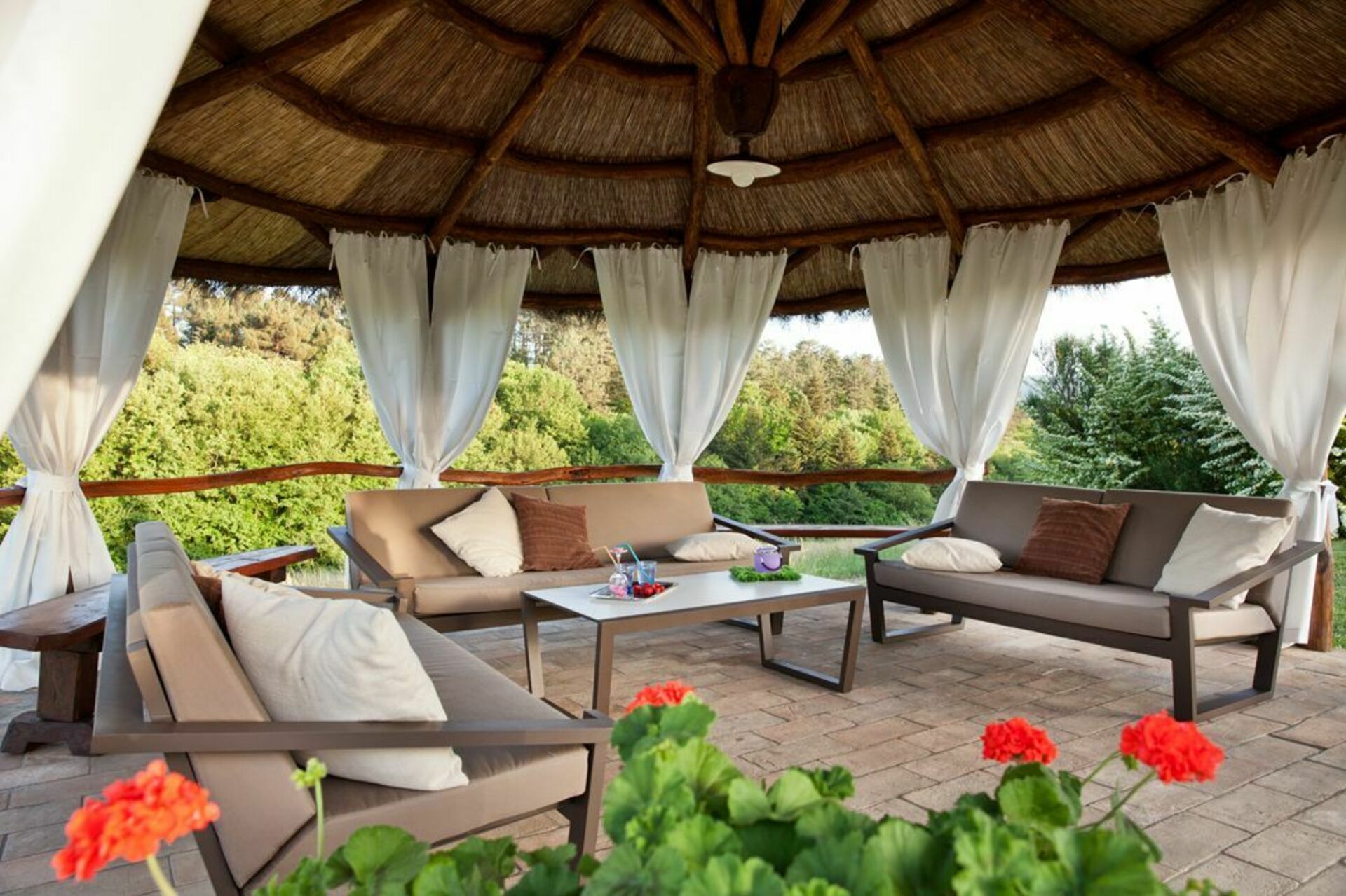 Terrazzo con accesso diretto in giardino arredato con tavolini e ombrellone.