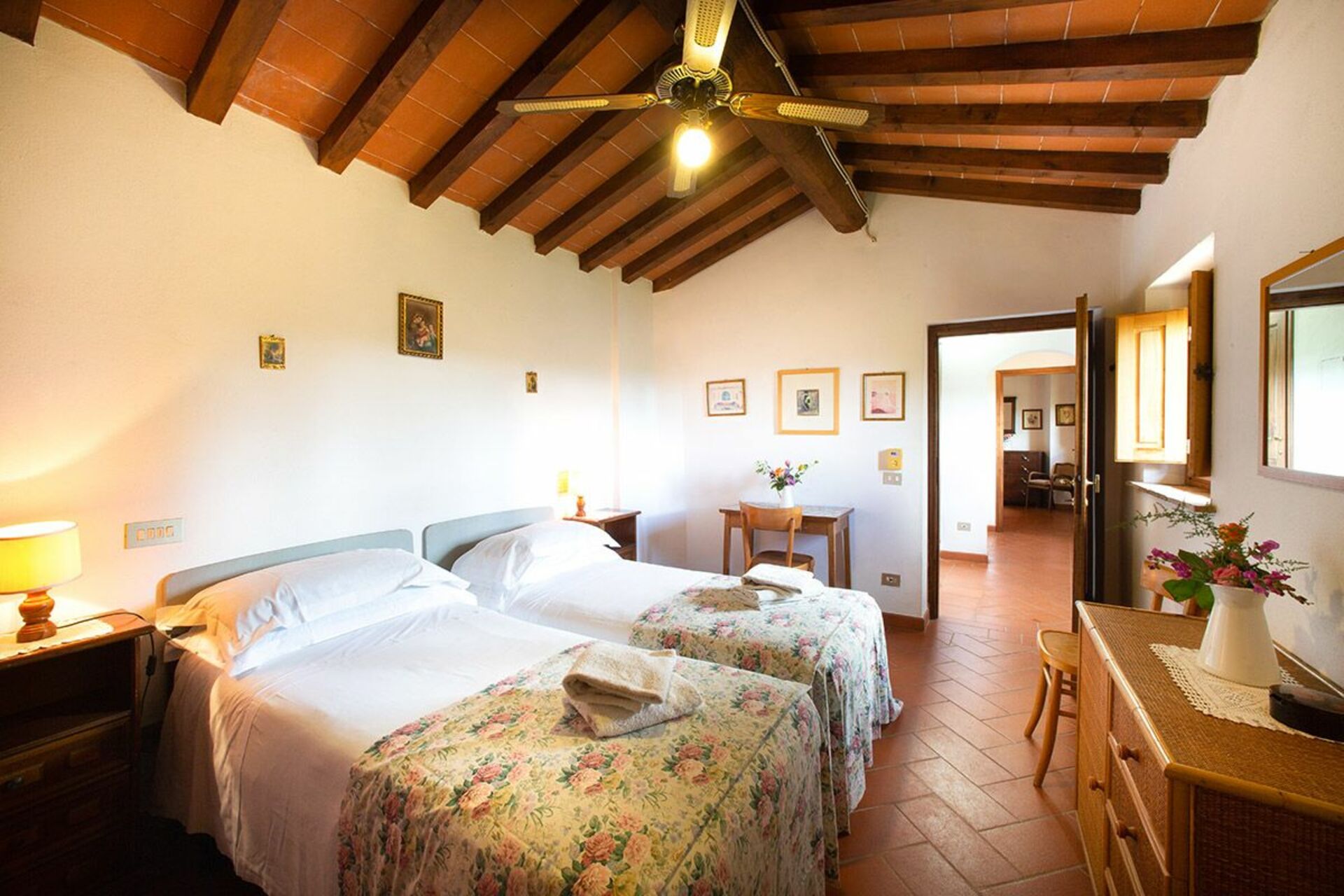 1° Piano: camera matrimoniale con ventilatore, camera con 2 letti singoli e ventilatore, originale piccolo bagno mansardato con doccia.