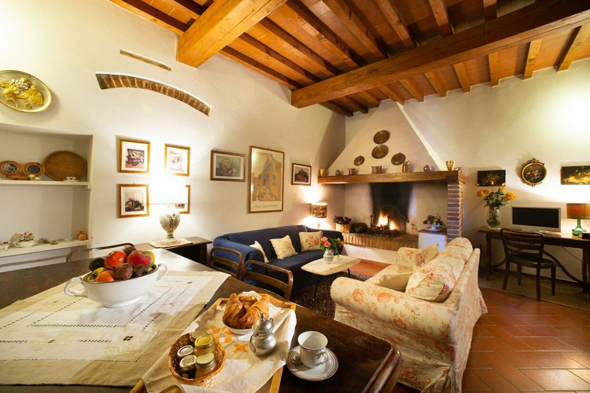 Piano terreno: soggiorno con camino e zona pranzo con accesso sull’esterno, cucina (forno, microonde, lavastoviglie, freezer, frigo), bagno doccia.