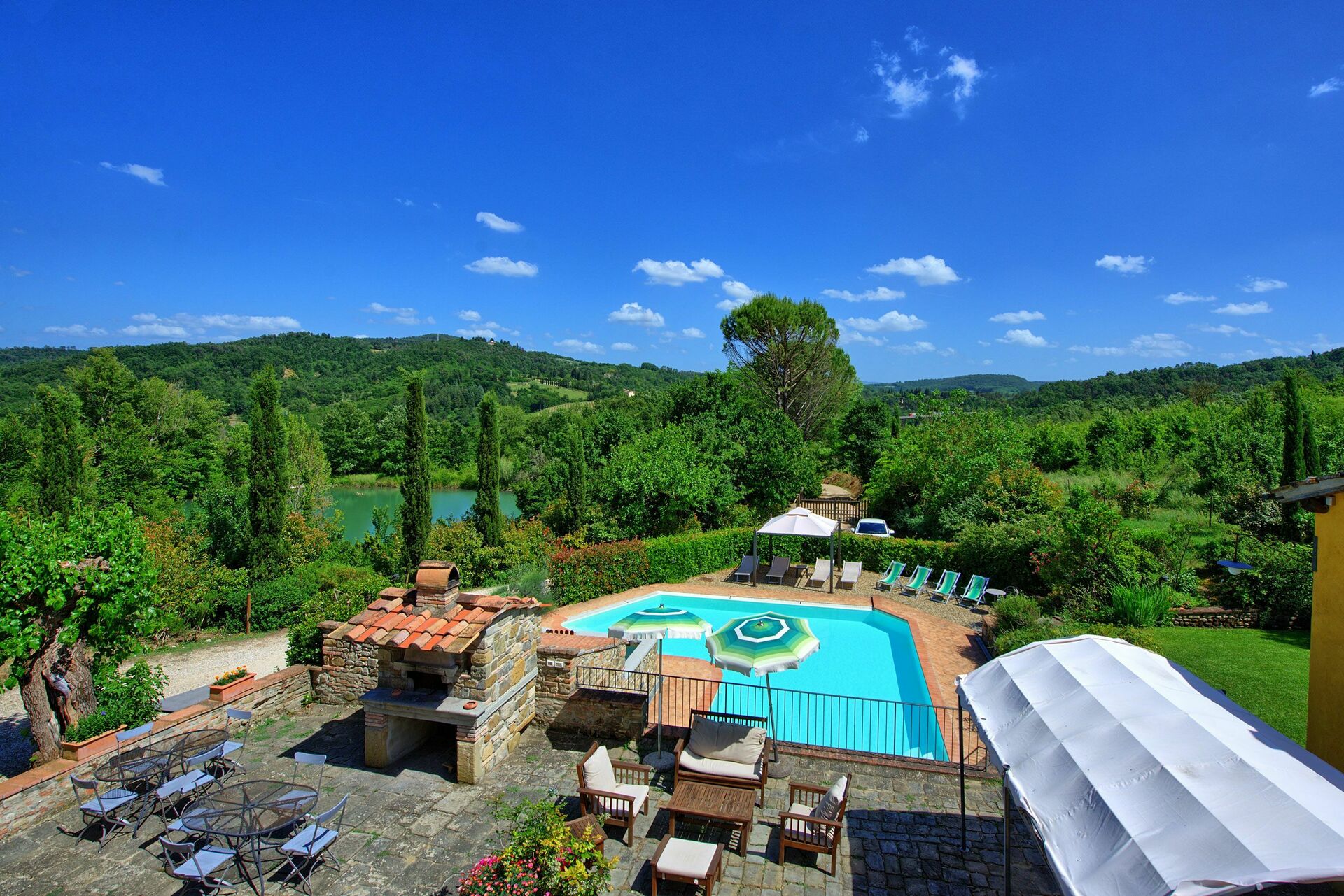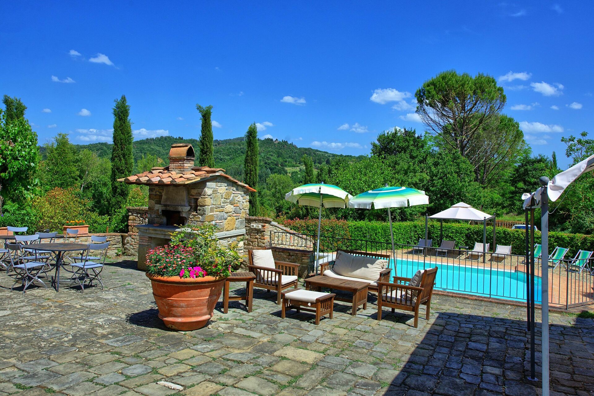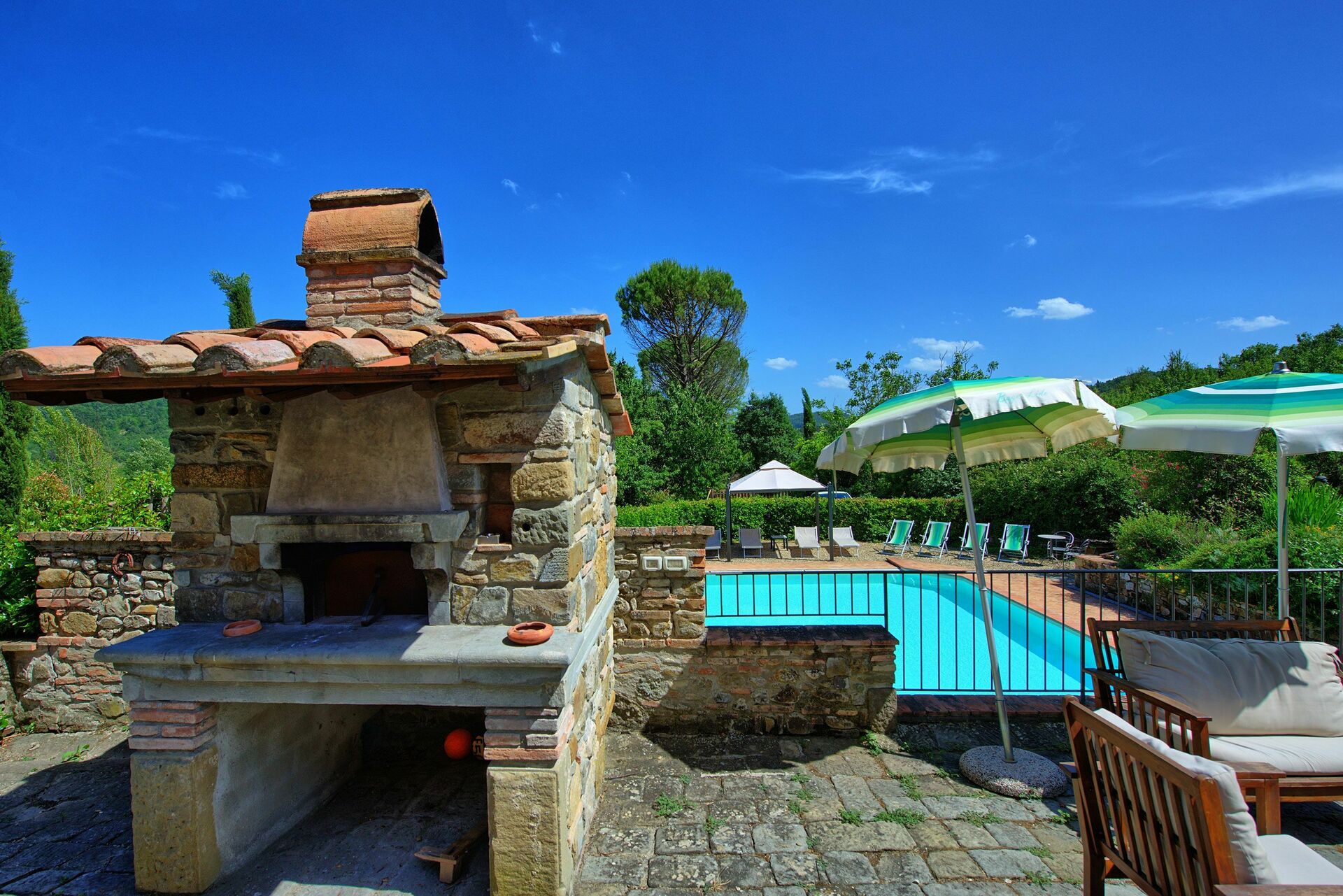 All'esterno, questa splendida villa offre una vista panoramica mozzafiato sulle colline e sul paesaggio circostante. Un giardino curato avvolge la proprietà ed offre una grande piscina privata con lettini ed ombrelloni: il luogo ideale in cui trascorrere indimenticabili momenti con i propri amici e la propria famiglia. Un'area barbecue attrezzata con tavoli e sedie è perfetta per mangiare all'aperto, godendosi la vista sulla natura e l'aria di campagna.