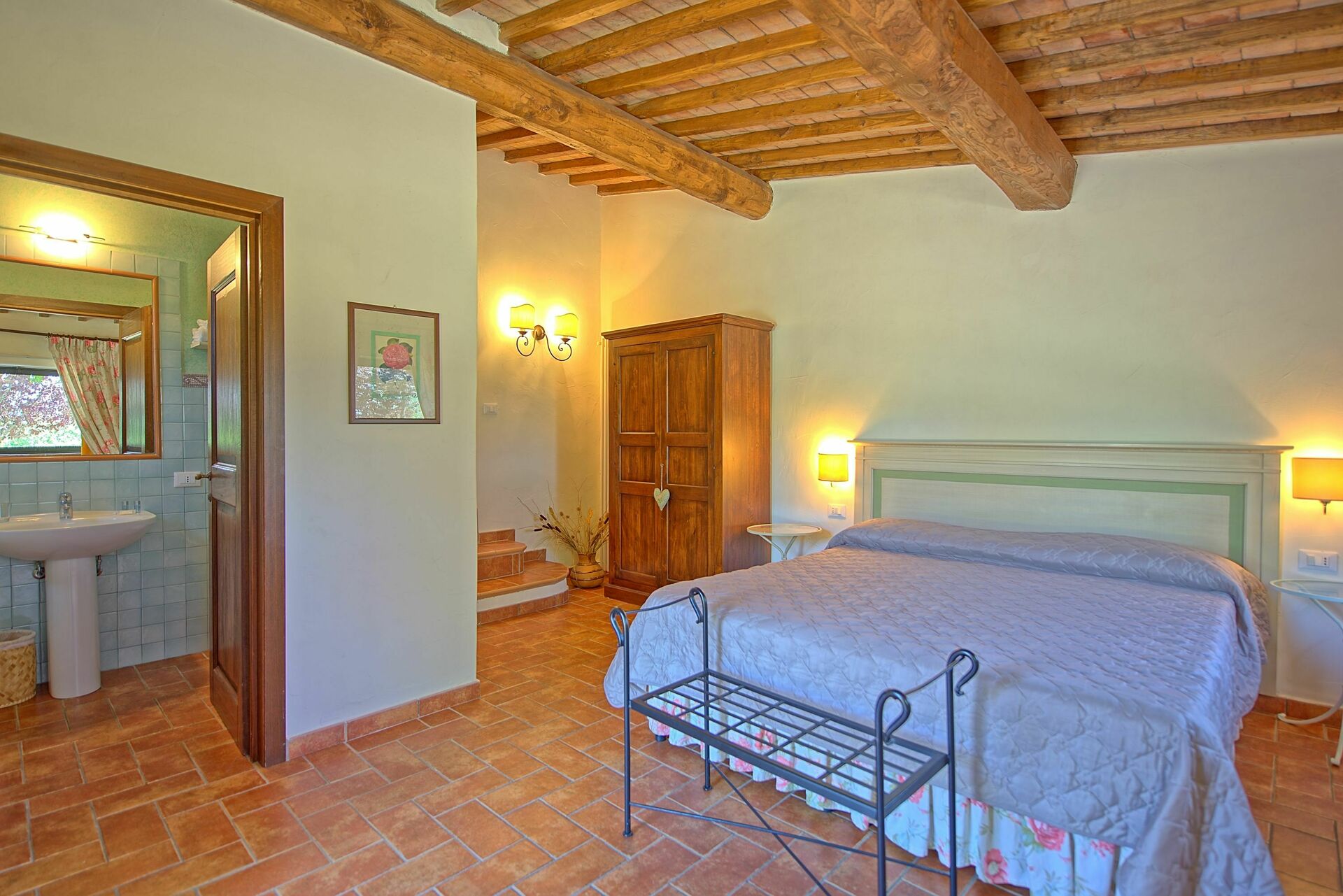 3 gradini più in basso: camera con 2 letti singoli e bagno privato con doccia.
