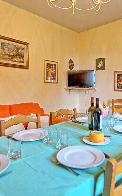 1° Piano: ingresso su soggiorno (TV satellitare) con zona pranzo e angolo cottura (forno, freezer), camera matrimoniale, camera con 2 letti singoli.