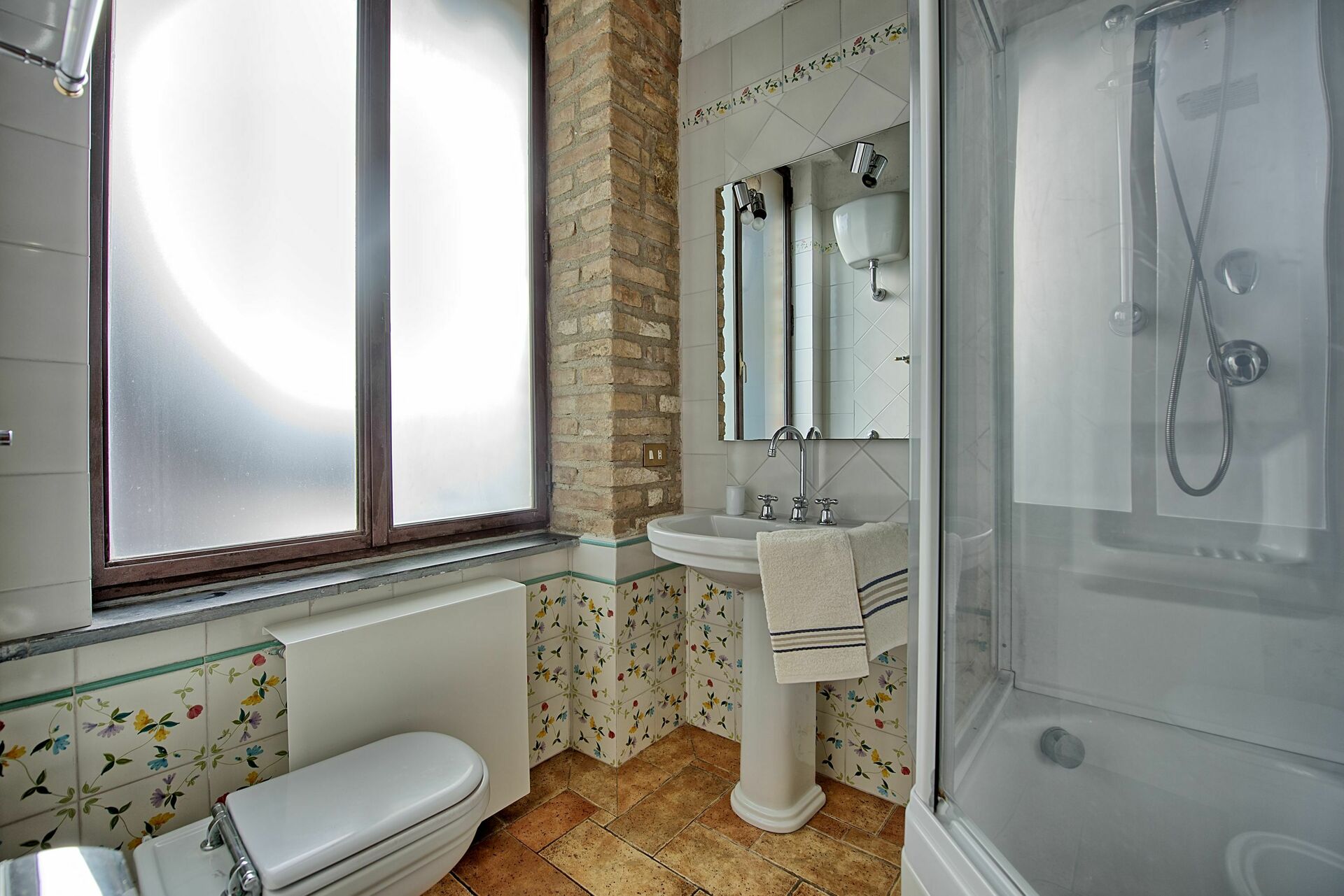 3 gradini sotto: panoramico soggiorno con divano letto singolo (€ 50 a settimana) e TV, camera matrimoniale con bagno privato con doccia.