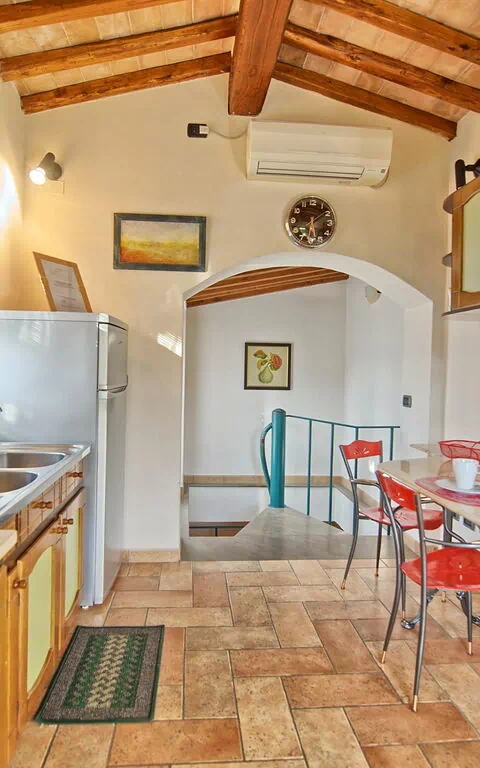 Piano terreno: ingresso su zona pranzo con angolo cottura (forno, freezer, tostapane, bollitore).